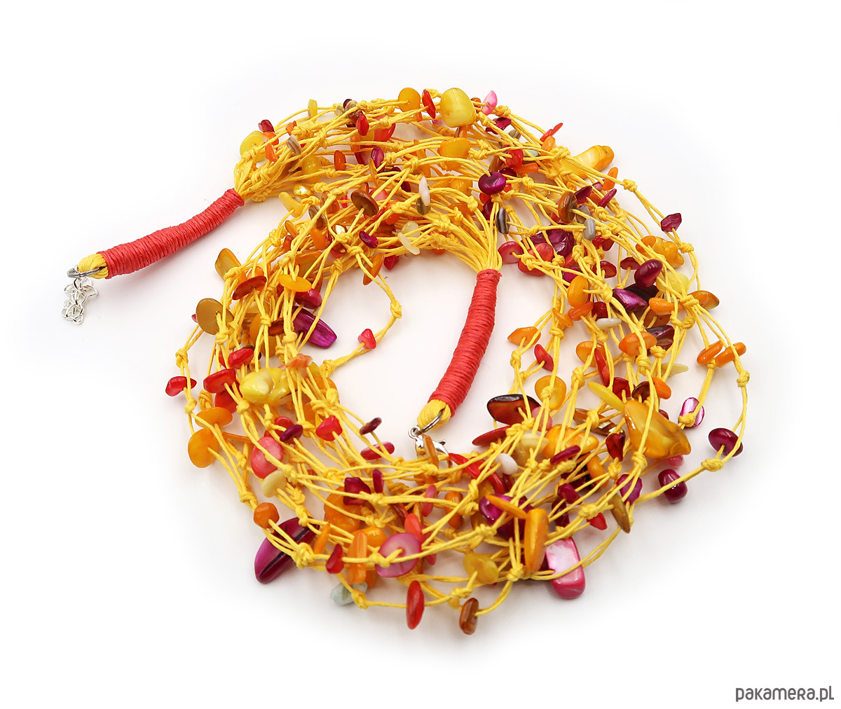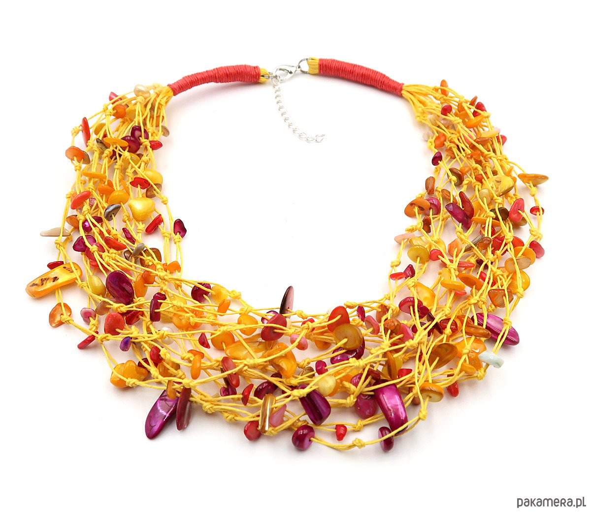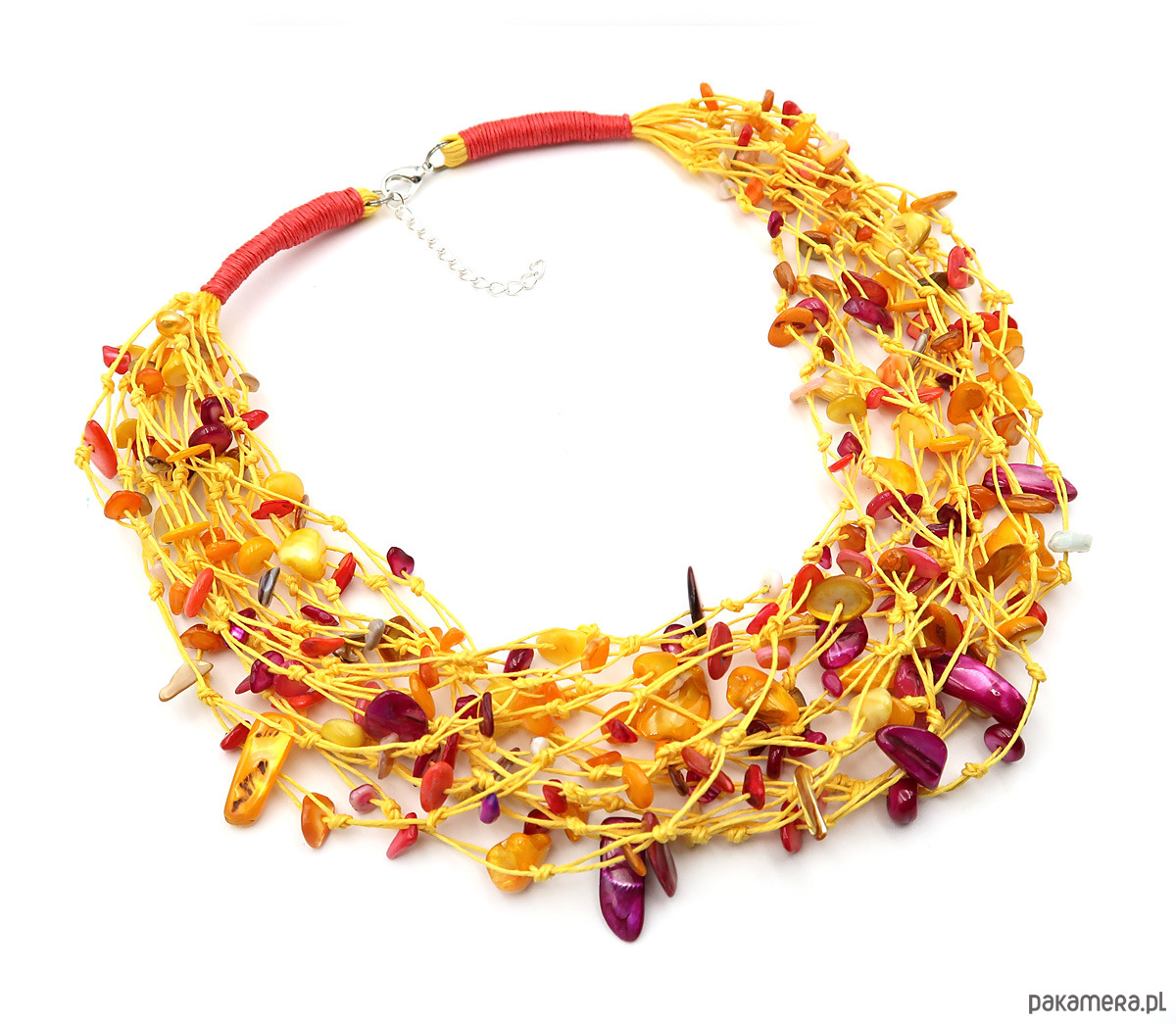 Wyjątkowy, ręcznie wykonany naszyjnik stworzony na bazie naturalnej, polskiej przędzy lnianej w kolorze ciepłej żółci z subtelnym wykończeniem przy zapięciu z przędzy w odcieniu malinowym.