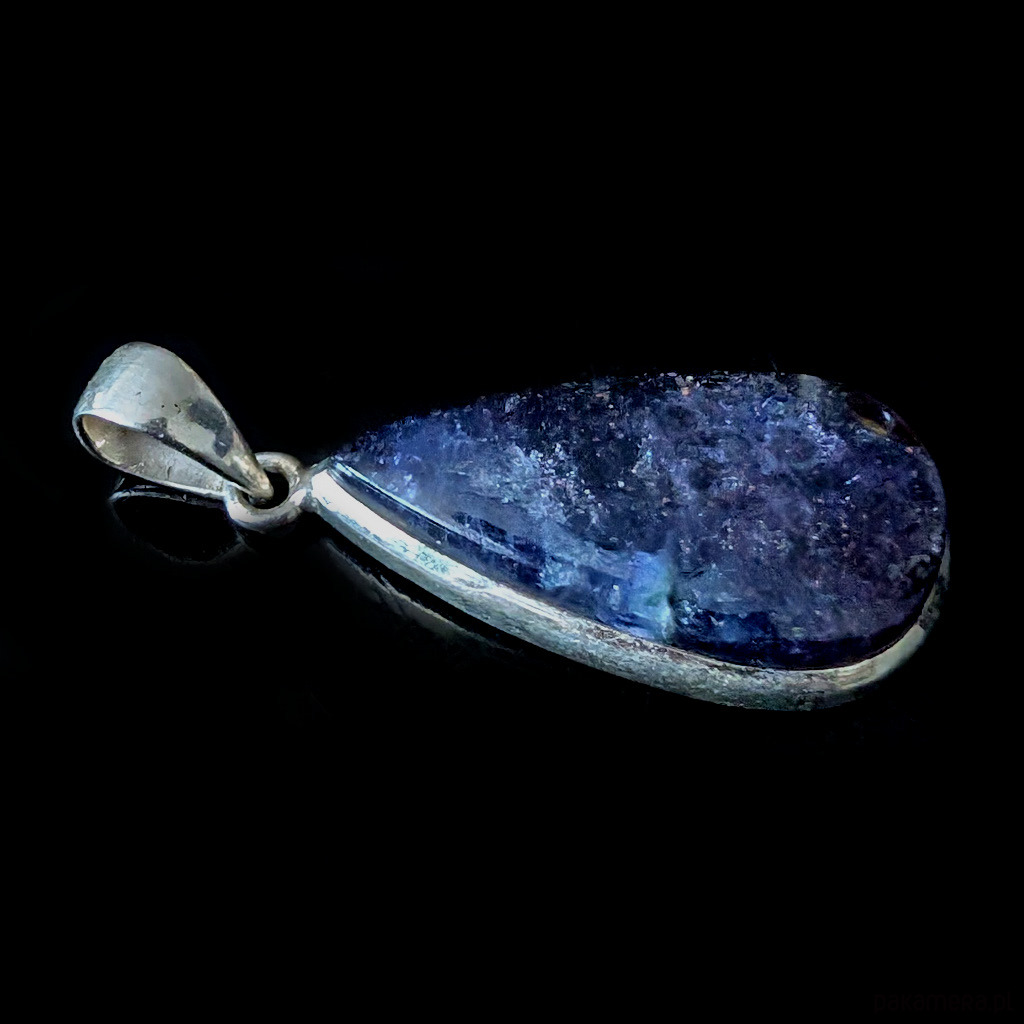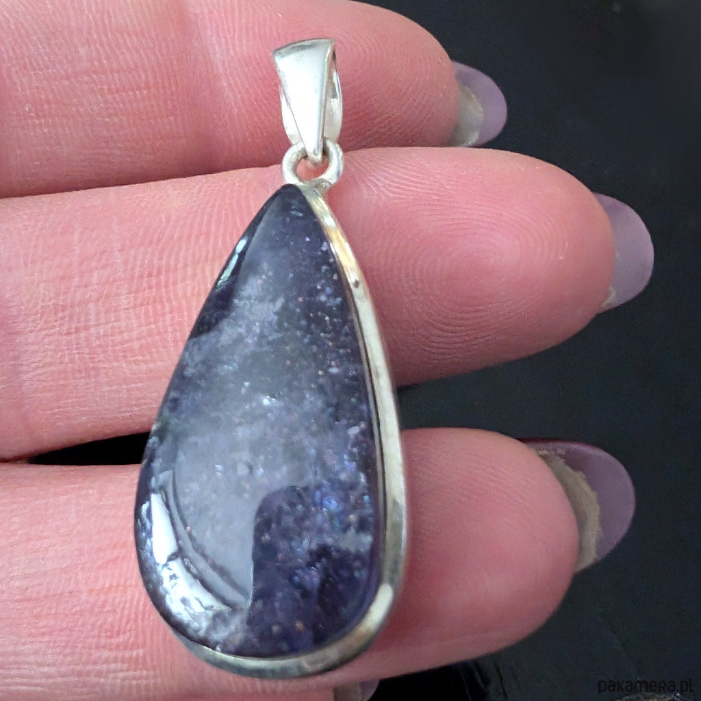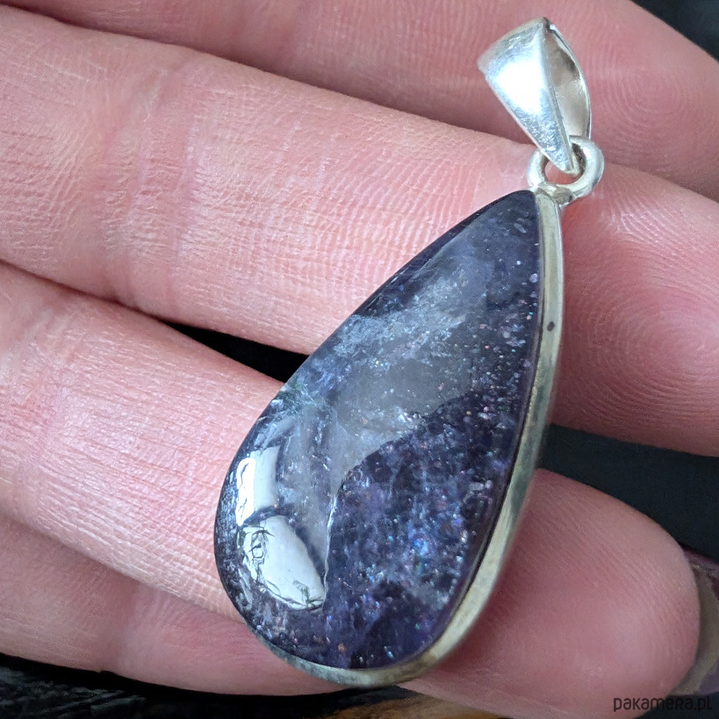 Wisiorek ze srebra próby 925 i zjawiskowego iolitu z kamieniem słonecznym zwanym inaczej skaleniem awenturynowym. Rzadki minerał wykazujący tzw.efekt awenturyzacji w postaci maleńkich mieniących się wrostów- łusek innych minerałów,np.hematytu. Kamień ma oprawę 30 x 16 mm. dŁugość 42 mm, waga 7,8 grama. Wisiorek wykonany przez dostawcę kamieni. Polecam, unikat