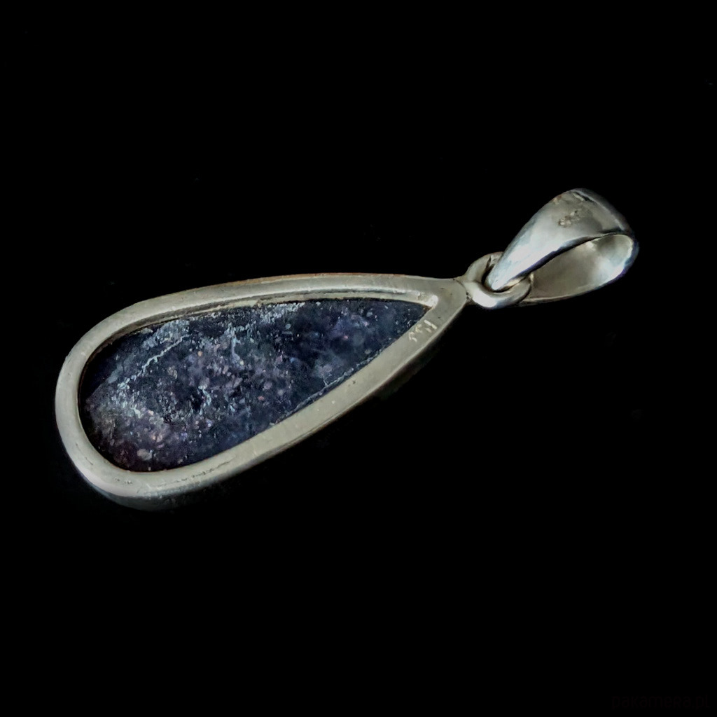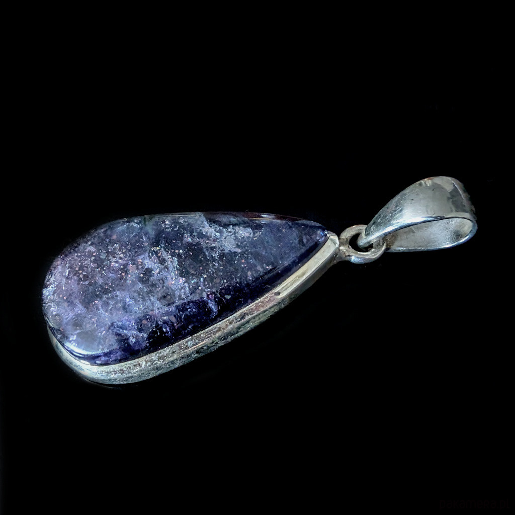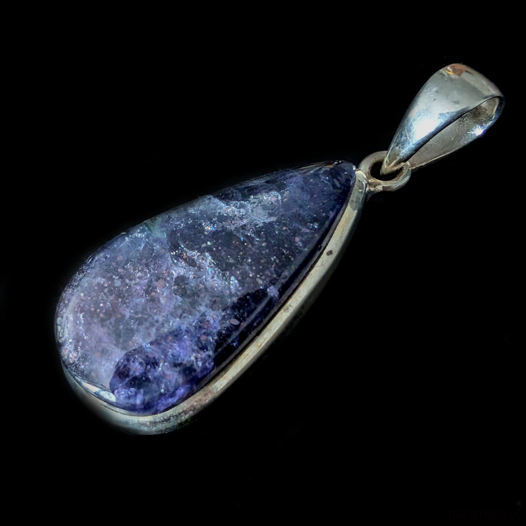 Wisiorek ze srebra próby 925 i zjawiskowego iolitu z kamieniem słonecznym zwanym inaczej skaleniem awenturynowym. Rzadki minerał wykazujący tzw.efekt awenturyzacji w postaci maleńkich mieniących się wrostów- łusek innych minerałów,np.hematytu. Kamień ma oprawę 30 x 16 mm. dŁugość 42 mm, waga 7,8 grama. Wisiorek wykonany przez dostawcę kamieni. Polecam, unikat
