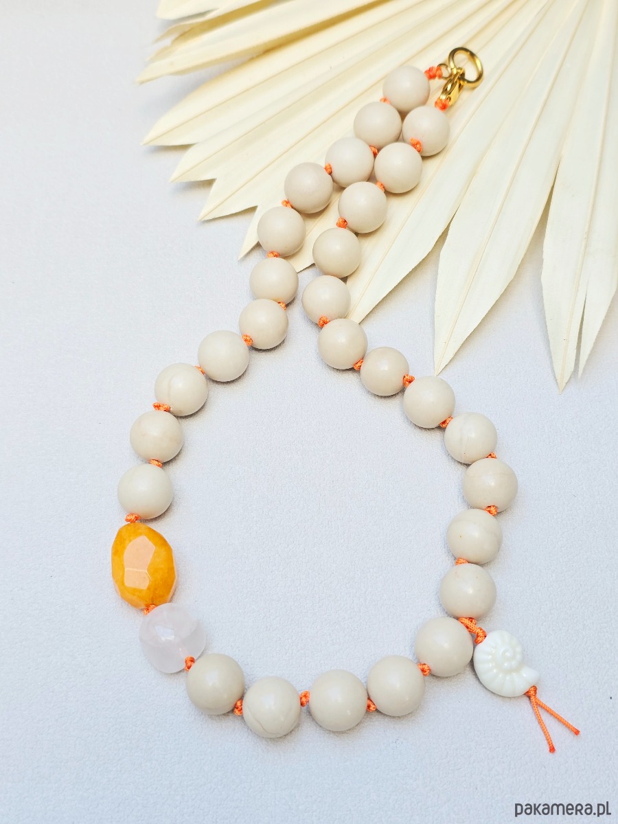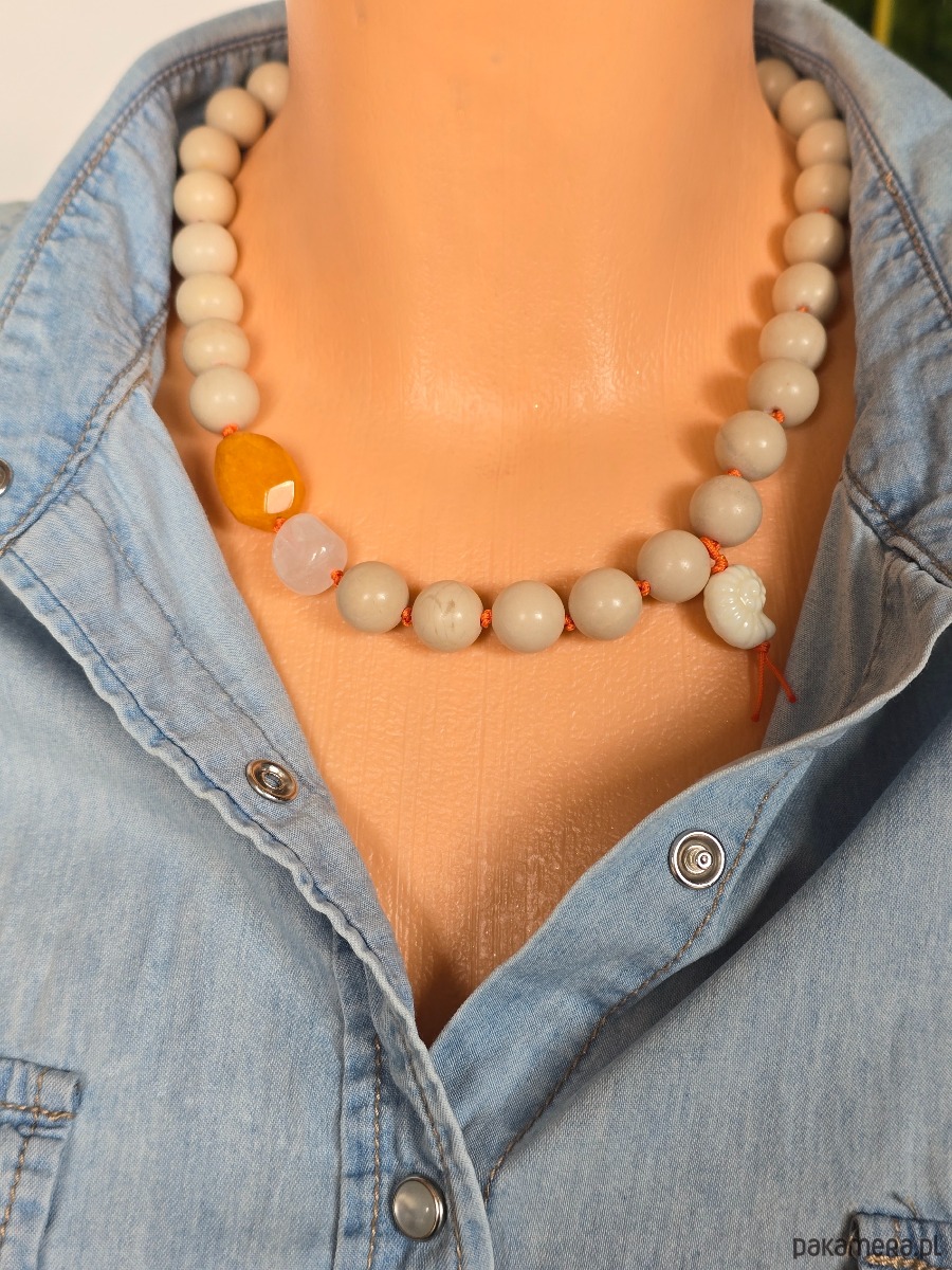 Wykorzystane kamienie to jaspis rzeczny, bryłka fasetowanego jadeitu pomarańczowego, bryłka kryształu górskiego. Ozdobą naszyjnika jest również zawieszka w kształcie amonitu.