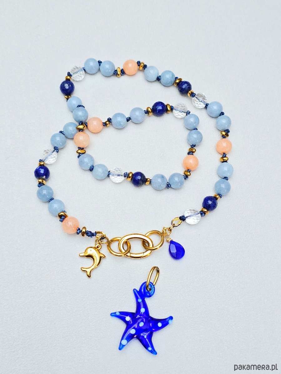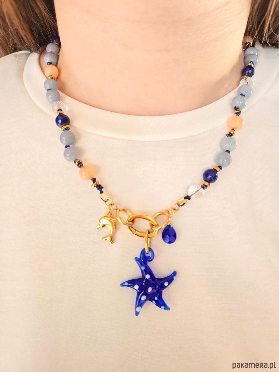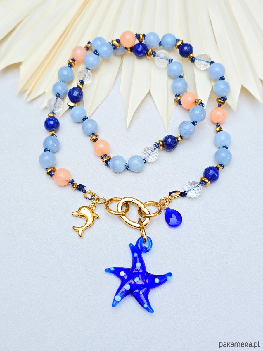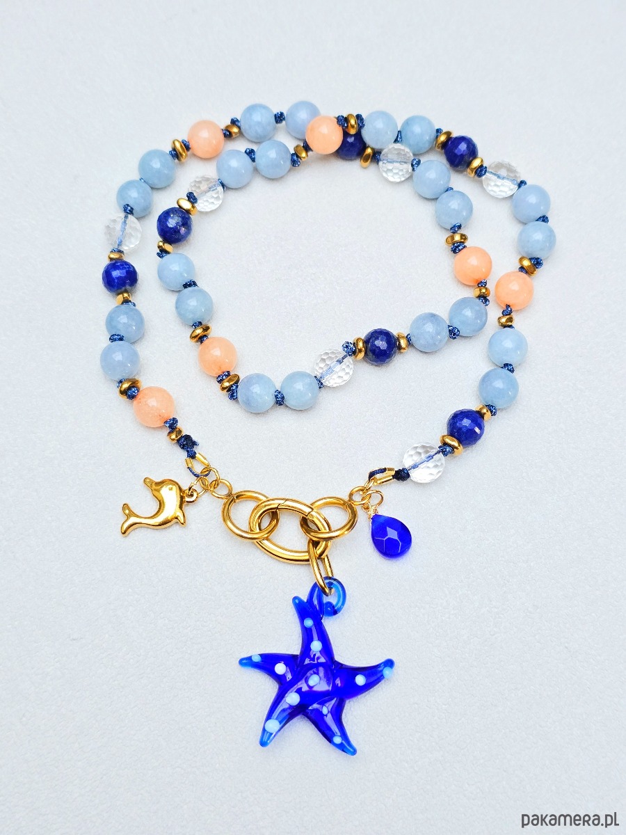 Unikatowy, naszyjnik z kamieni naturalnych o średnicy ok 8mm. Zapinany z przodu. Z zawieszkami , w tym z piękną szklaną zawieszką rozgwiazdą, która jest zdejmowana. (Można nosić naszyjnik bez niej)