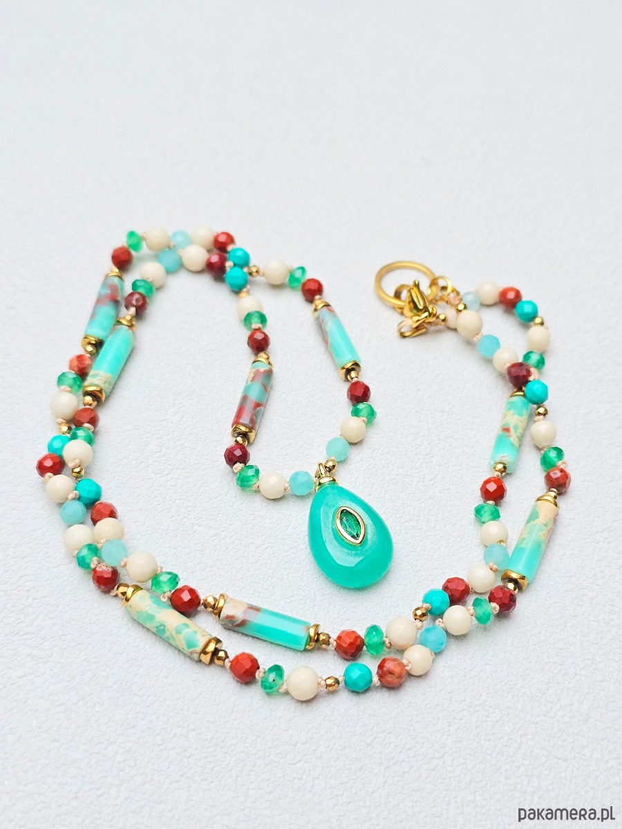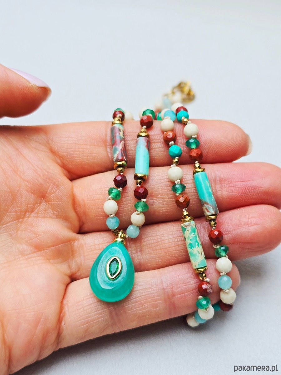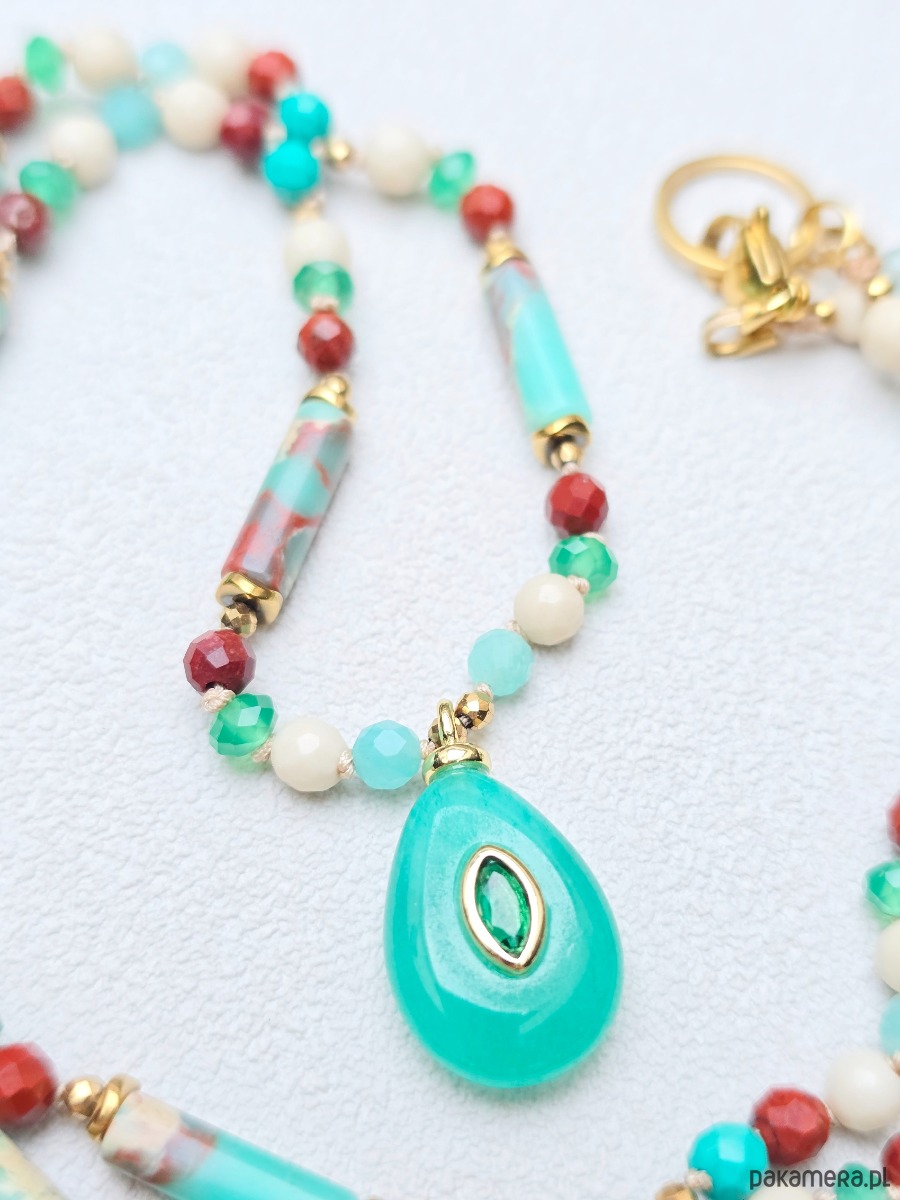 Wykonany z kamieni naturalnych tj.: jaspis rzeczny, ceglasty i cesarski, amazonit, magnezyt, zielony onyks, jadeit.
