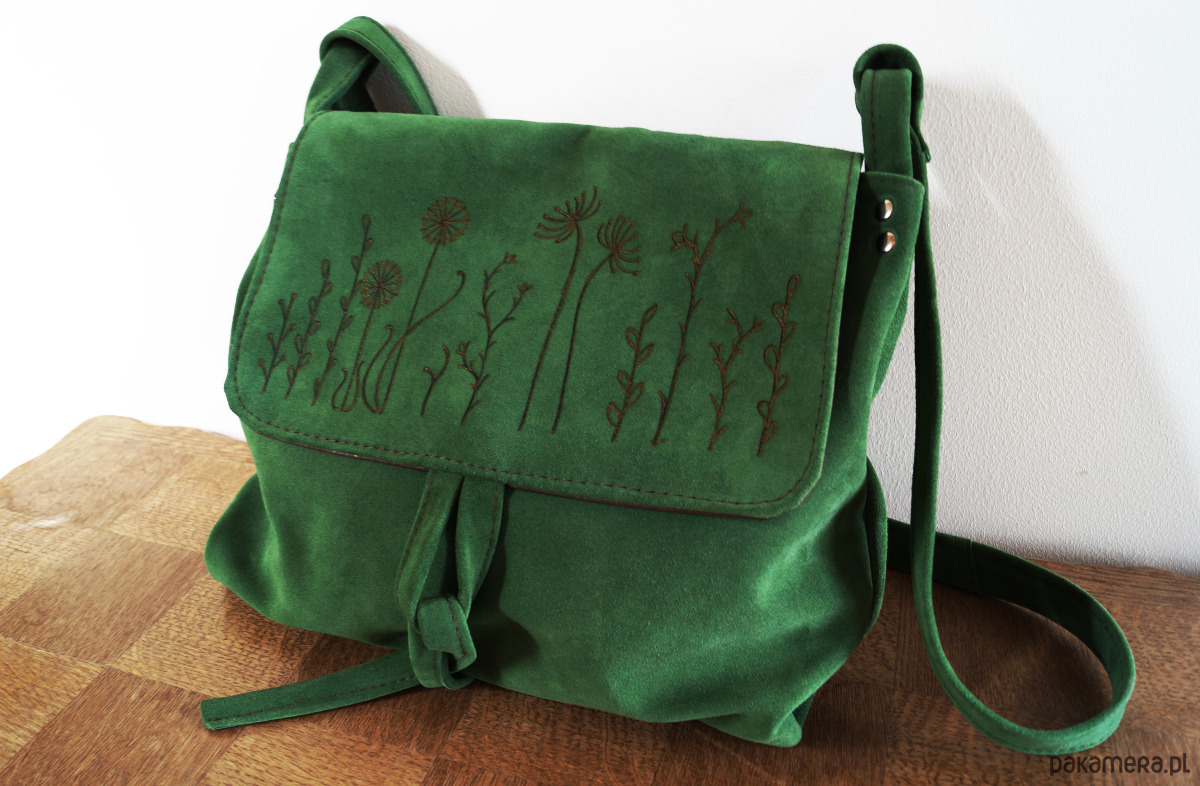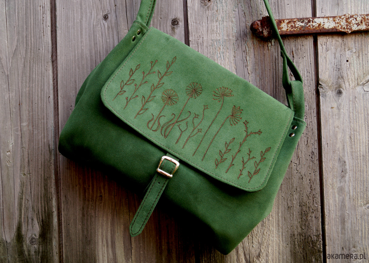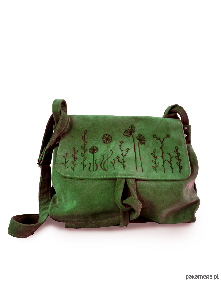 Duża torebka ze świetnej jakości, grubej, pięknej skóry bydlęcej, zamszowej, w kolorze żywej, trawiastej zieleni (kolejne zdjęcia przedstawiają tę torebkę w innych kolorach). Mieści swobodnie format A4. Na klapie – ręcznie wypalony wzór polnych kwiatów. Prosty, autorski krój. Zapinana na zamek, skórzany troczek i magnes ukryty pod klapą. Wewnątrz podszewka i trzy kieszenie, w tym jedna na zamek. Z tyłu kieszeń na telefon. Wysokość – 33, szerokość – 33/44, regulowany pasek długi na max. 130 cm.