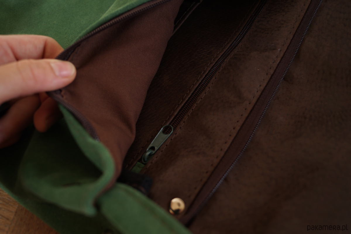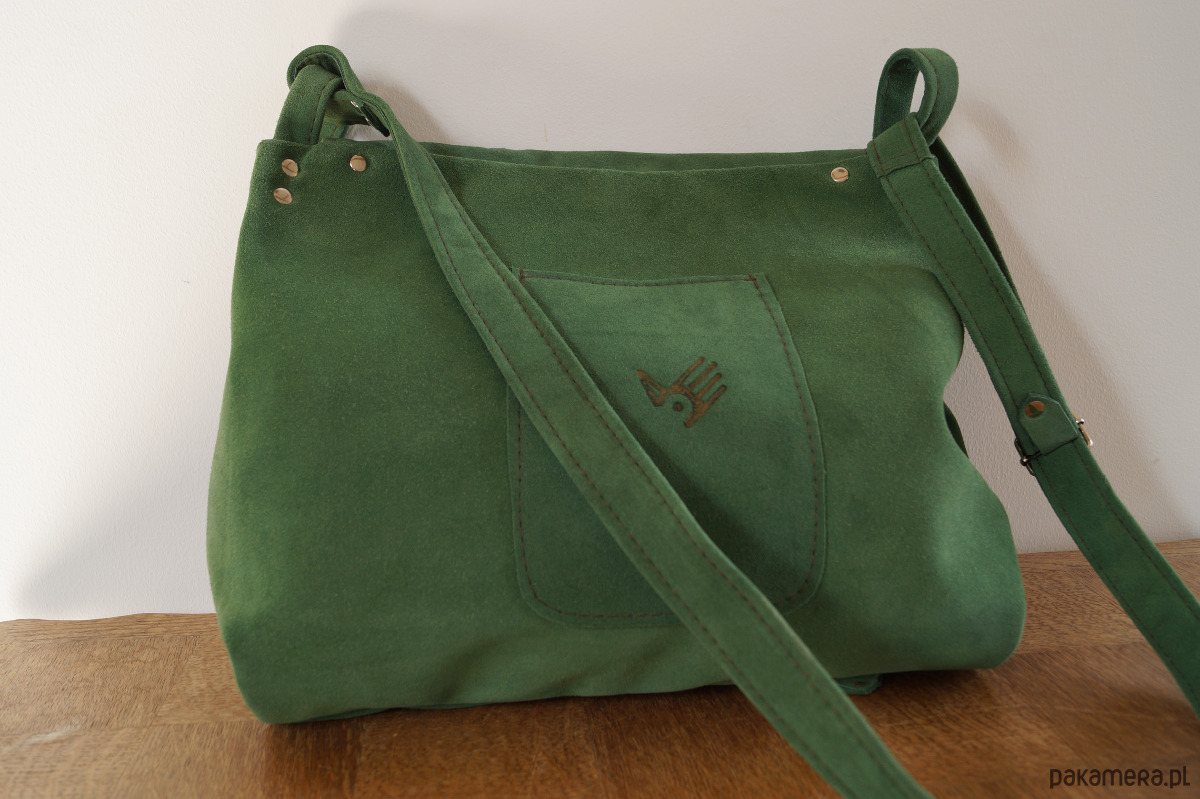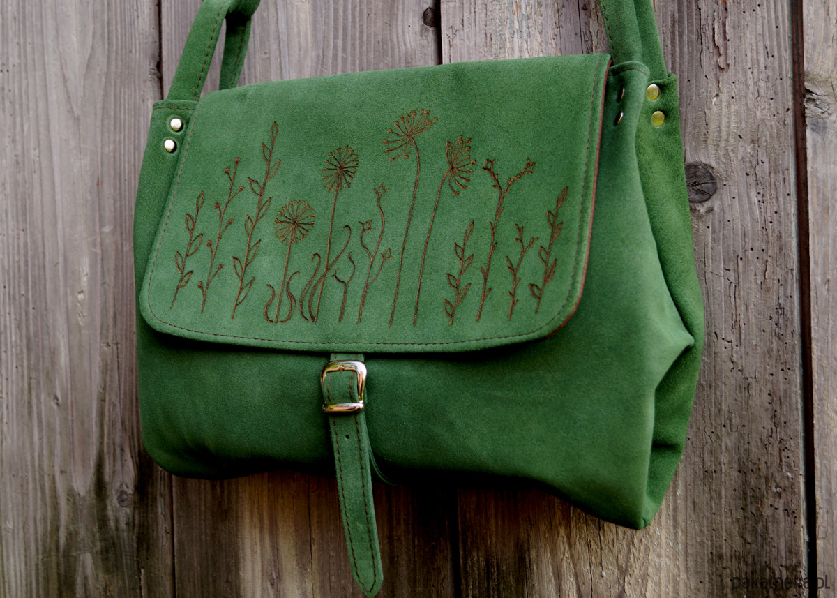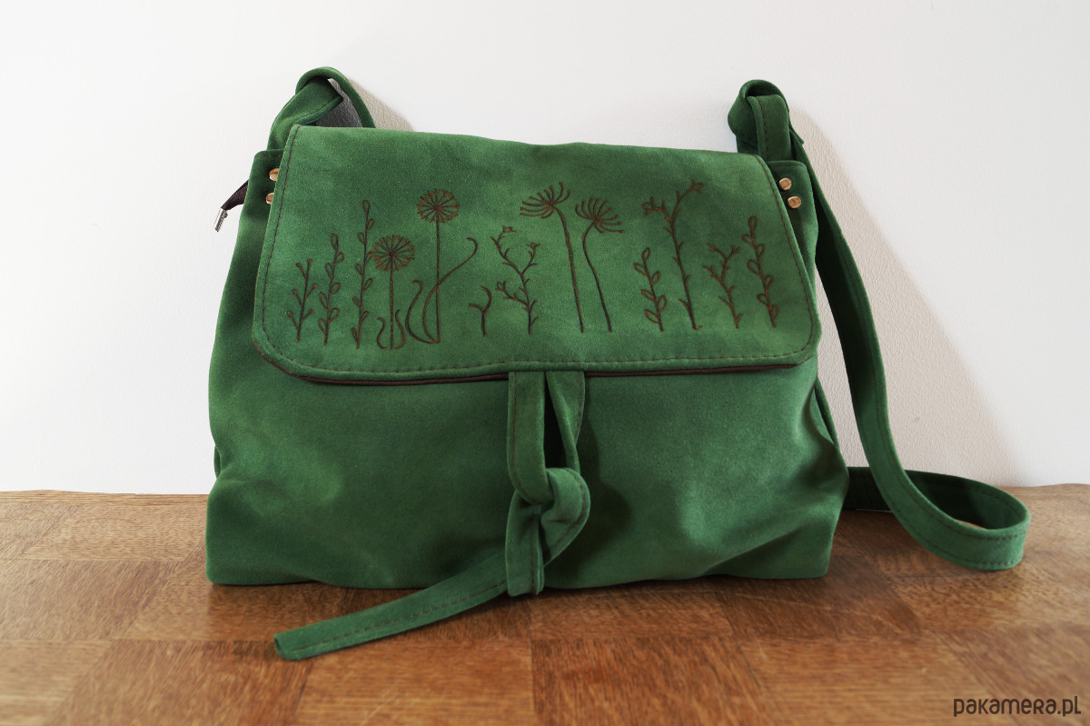 Duża torebka ze świetnej jakości, grubej, pięknej skóry bydlęcej, zamszowej, w kolorze żywej, trawiastej zieleni (kolejne zdjęcia przedstawiają tę torebkę w innych kolorach). Mieści swobodnie format A4. Na klapie – ręcznie wypalony wzór polnych kwiatów. Prosty, autorski krój. Zapinana na zamek, skórzany troczek i magnes ukryty pod klapą. Wewnątrz podszewka i trzy kieszenie, w tym jedna na zamek. Z tyłu kieszeń na telefon. Wysokość – 33, szerokość – 33/44, regulowany pasek długi na max. 130 cm.