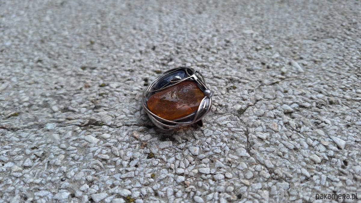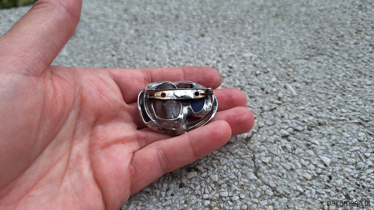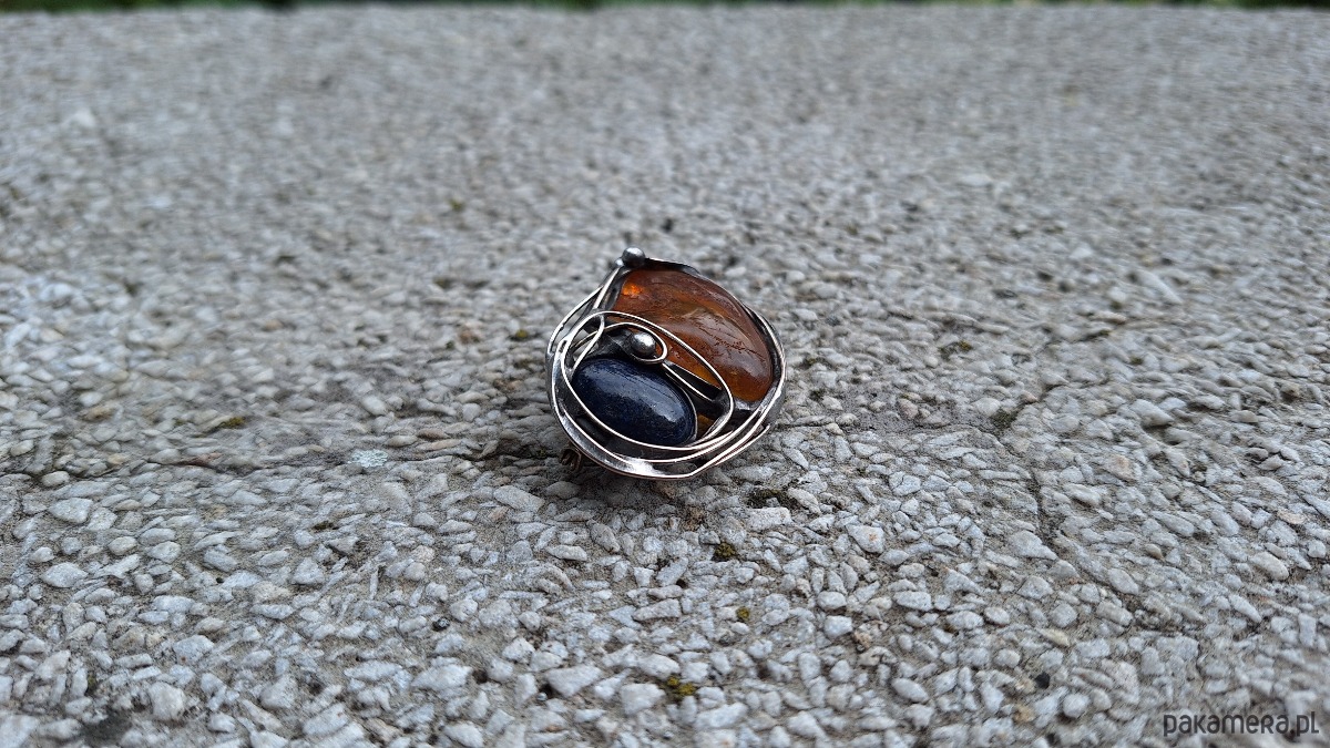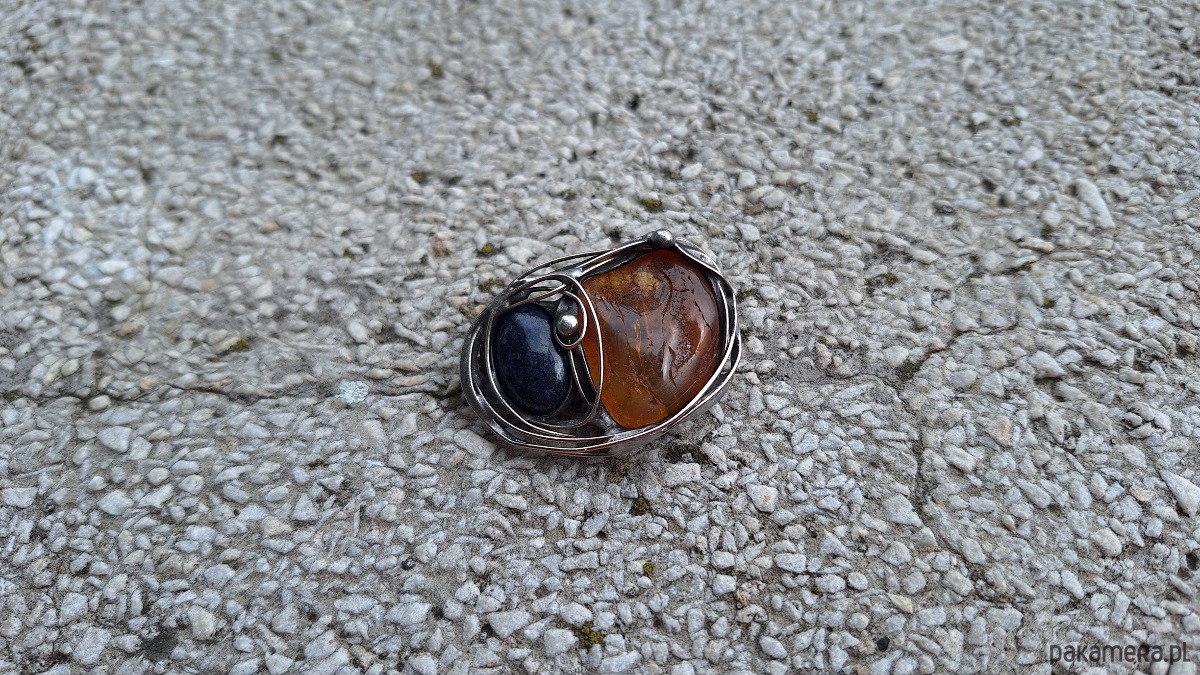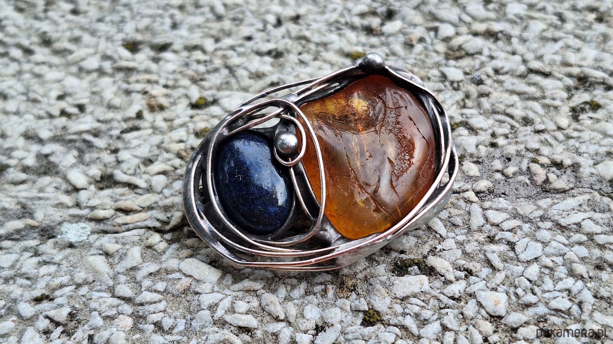 Broszka wykonana z miedzi, cyny, lapis lazuli i bursztynu. Wymiary ok. 4.5 na 3 cm. Zapięcie metalowe.