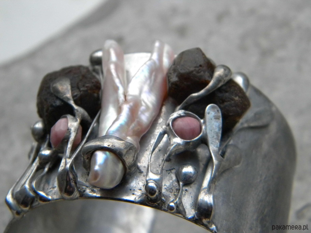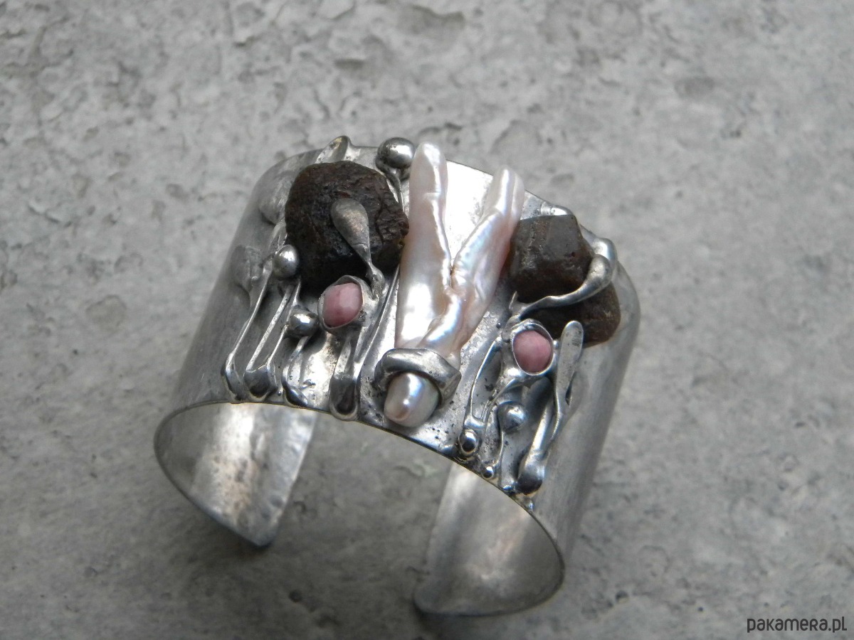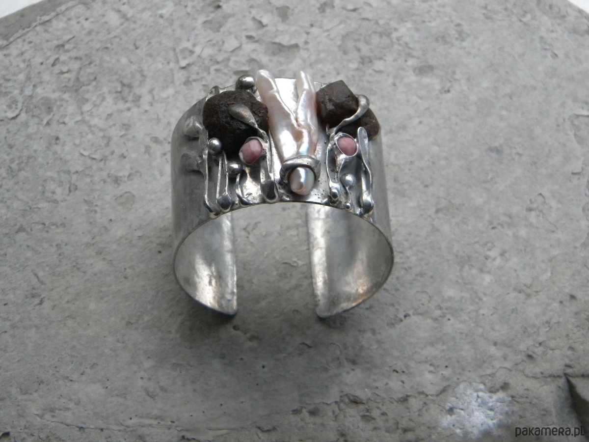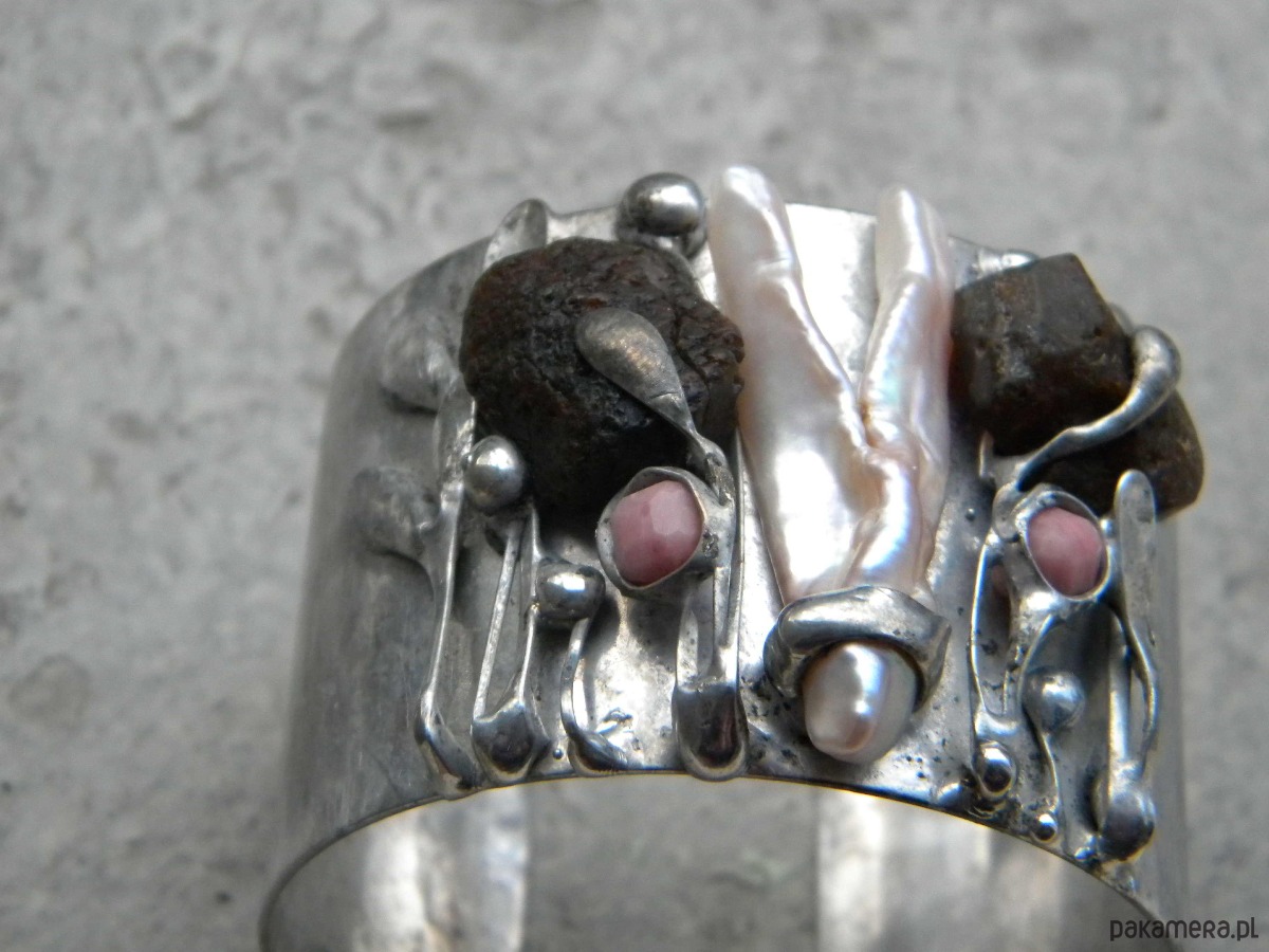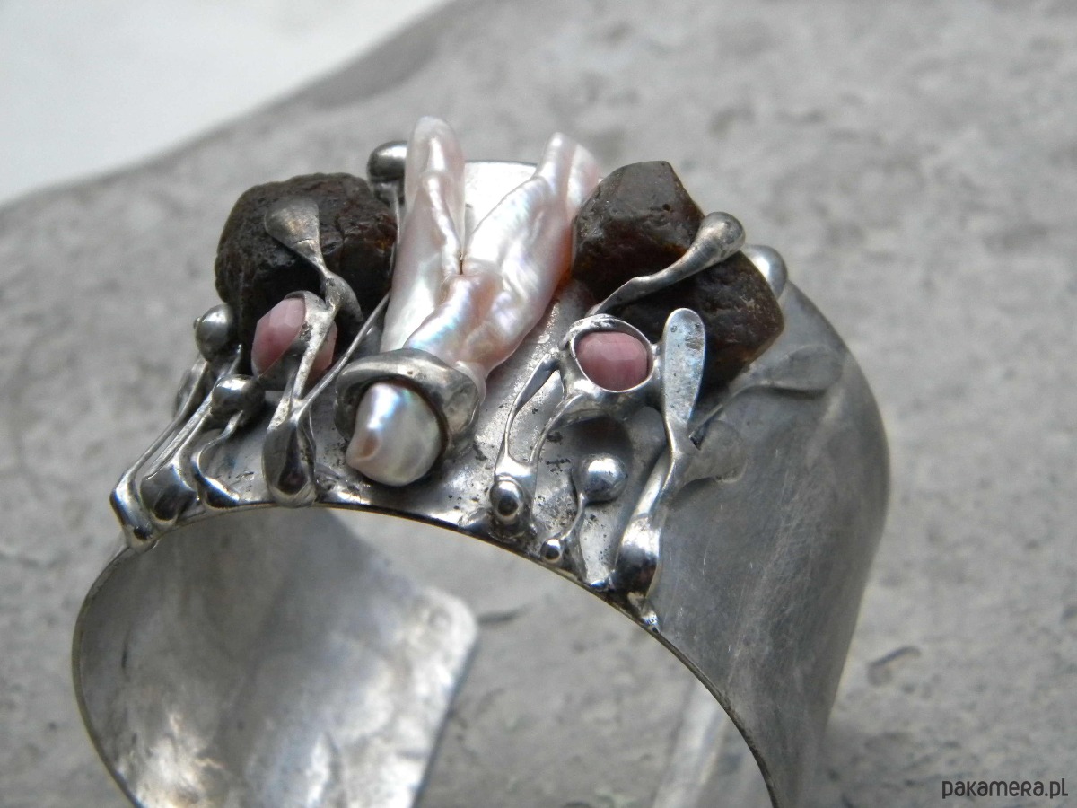 Bransoleta z ocynowanej miedzi, surowych bursztynów, perły i rodonitów