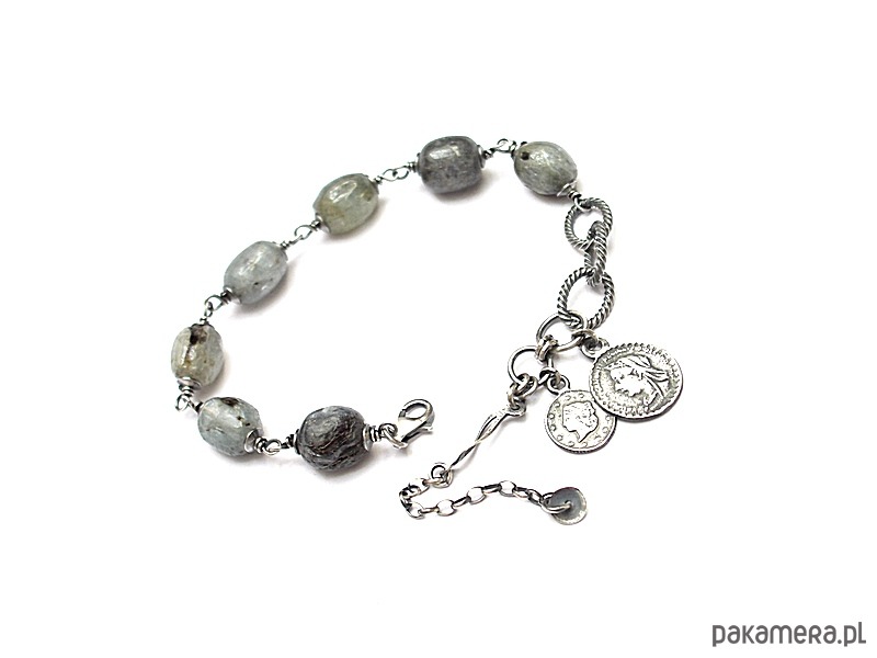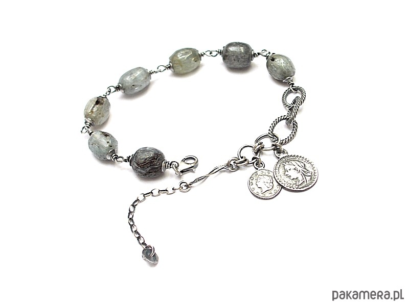Bransoletka wykonana ze srebra [pr.925] w połączeniu z oliwkami kyanitów [10mm - surowa powierzchnia, niedoskonałości] oraz srebrnymi imitacjami monet. Całość oksydowana i przetarta. Możliwość zapinania bransoletki 17,5cm -18,5cm plus ozdobna przedłużka. Biżuteria ozdobnie zapakowana.