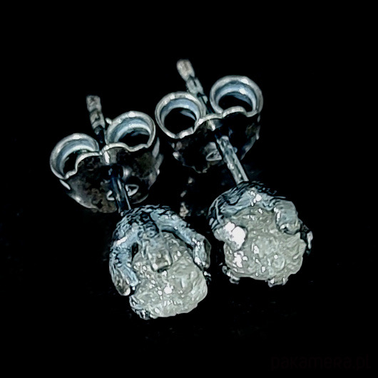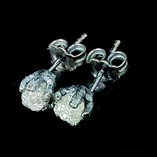Przepiękne, ascetyczne sztyfty z naturalnymi, surowymi srebrnymi diamentami o kształcie nieregularnych bryłek w oprawie srebra próby 925. Średnoca 5 mm. Lekkie, komfortowe i bardzo efektowne. Waga jednego kolczyka 0,7 grama. Kolczyki zostaną wysłane w ozdobnym pudełeczku.
