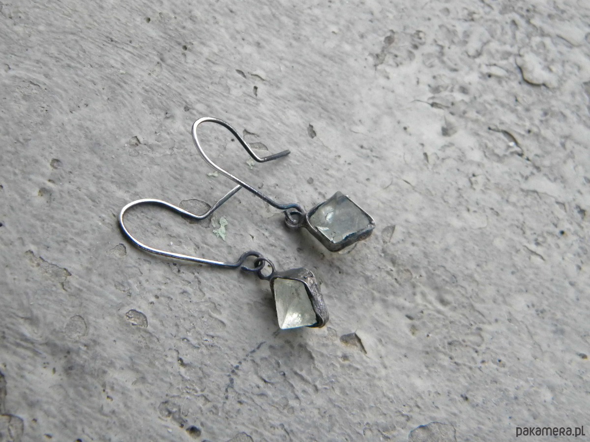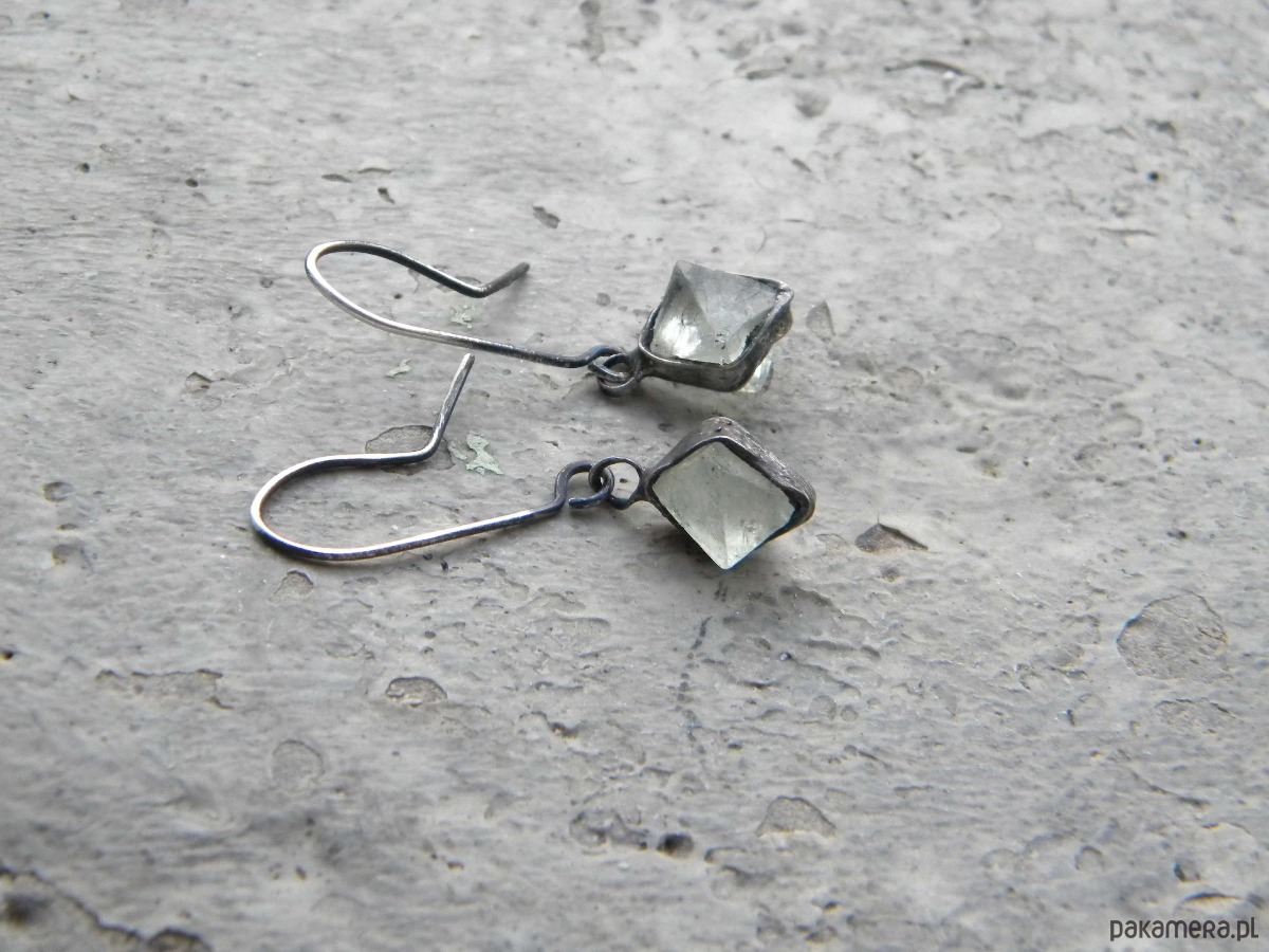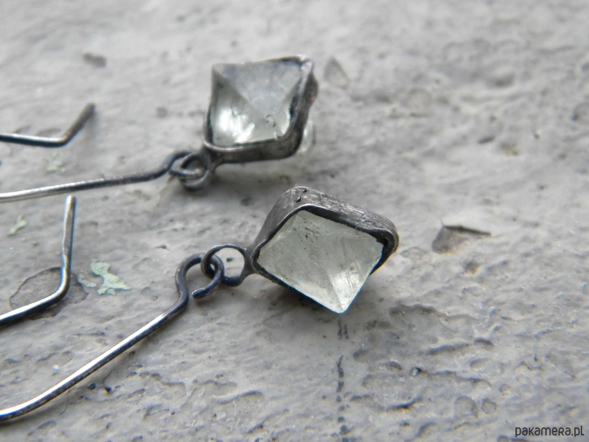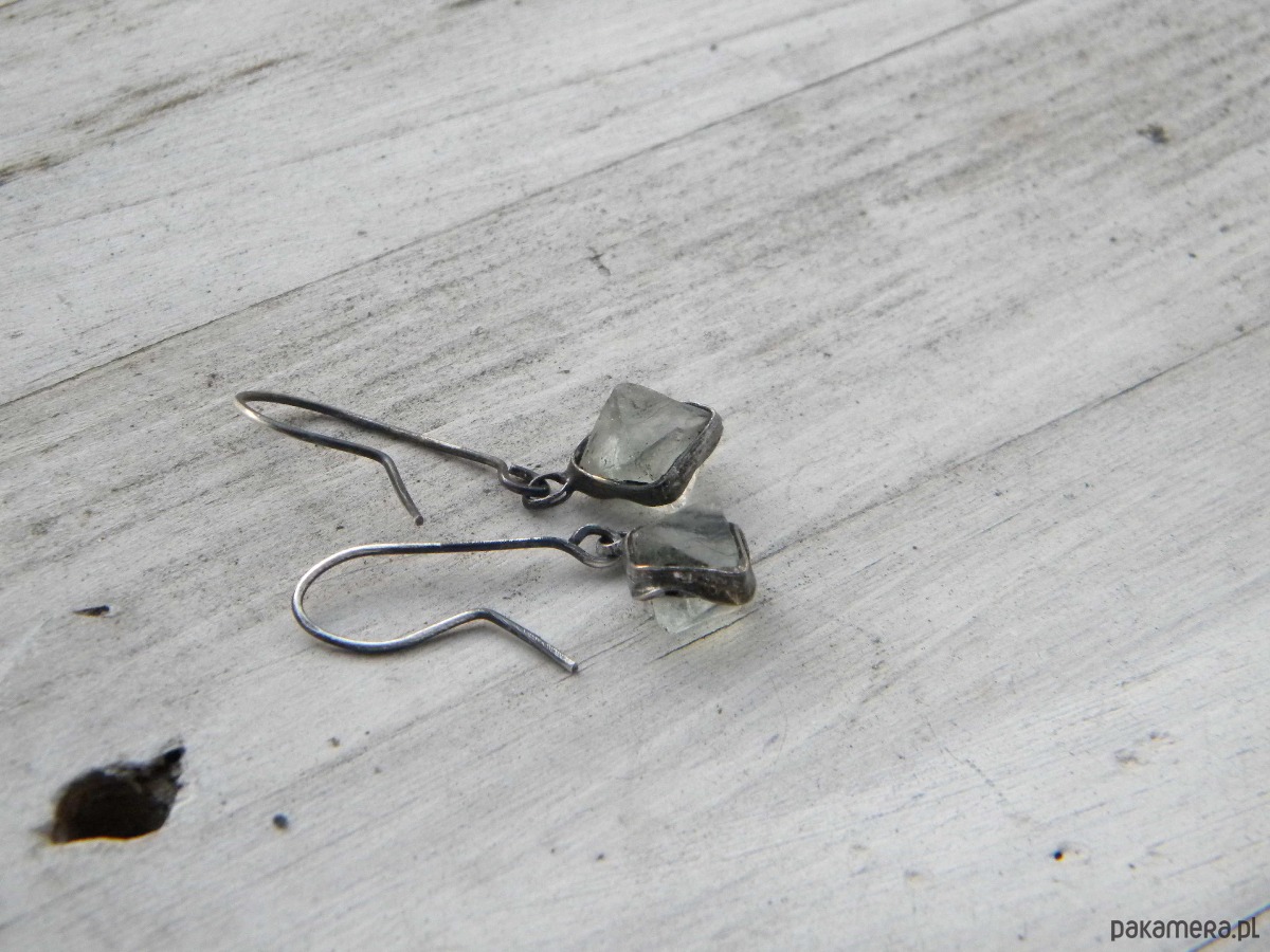 Kolczyki z surowych kryształów fluorytu w ocynowanej miedzi.