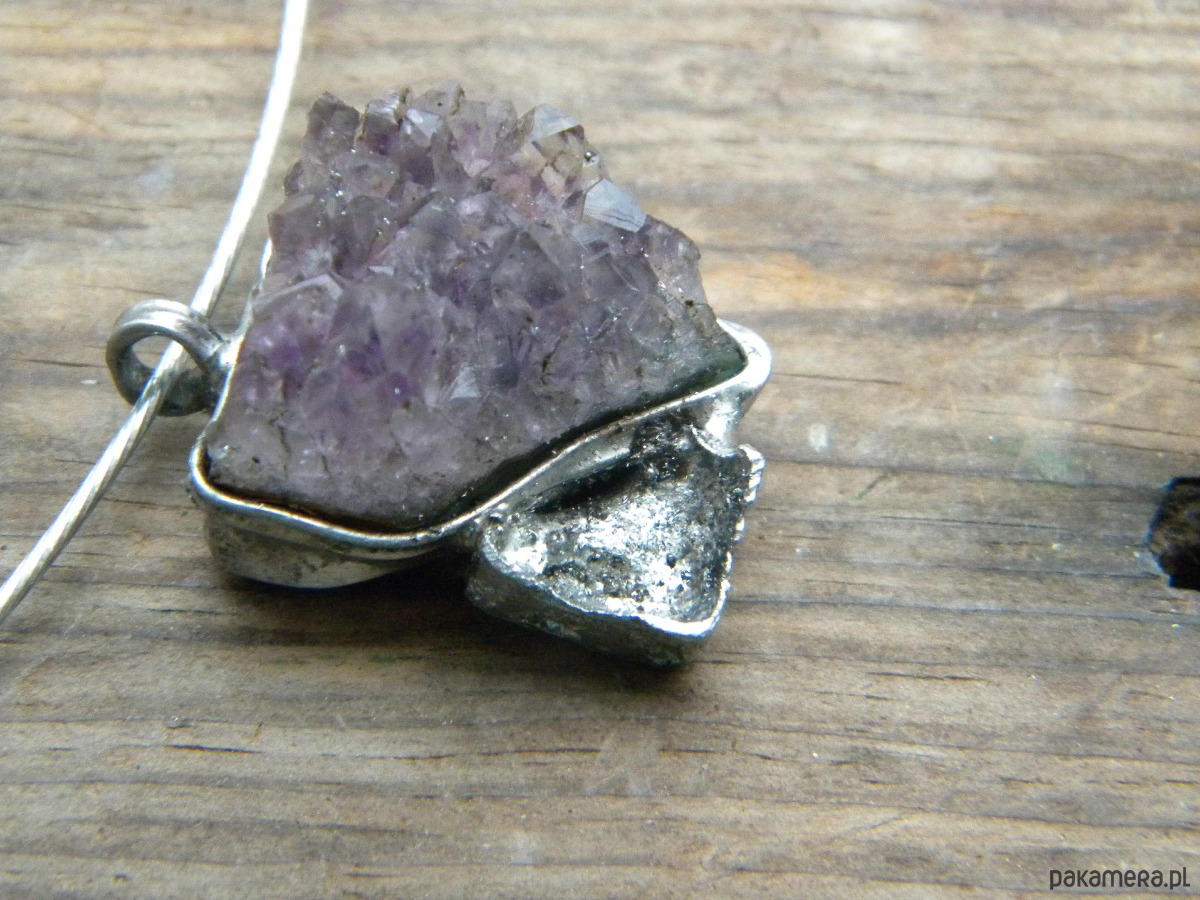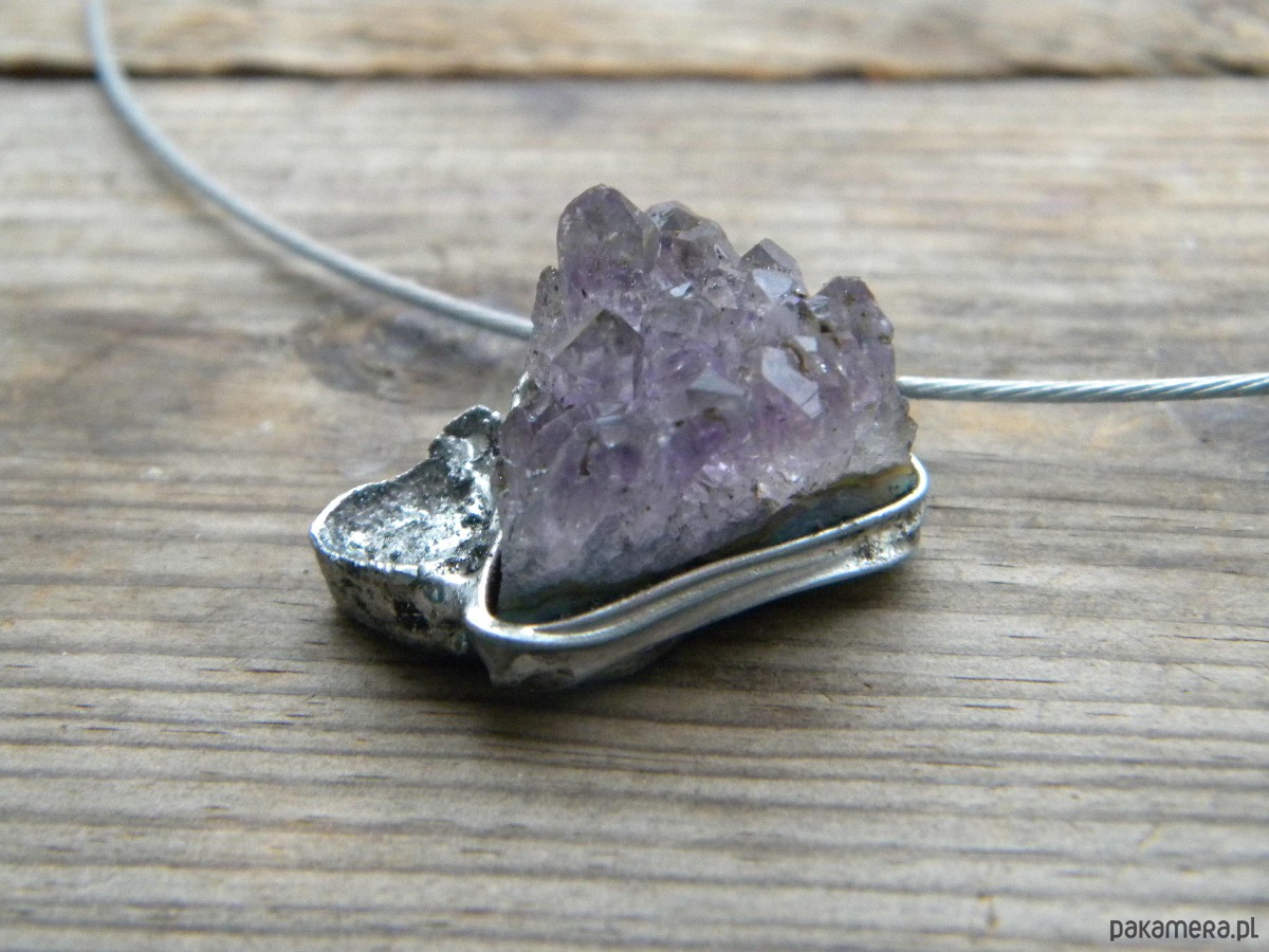 kryształy surowego ametystu w oprawie z ocynowanej miedzi