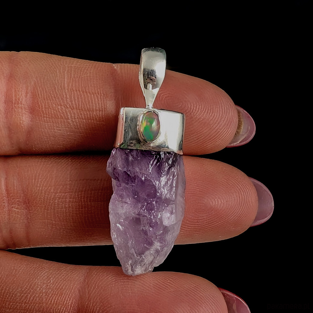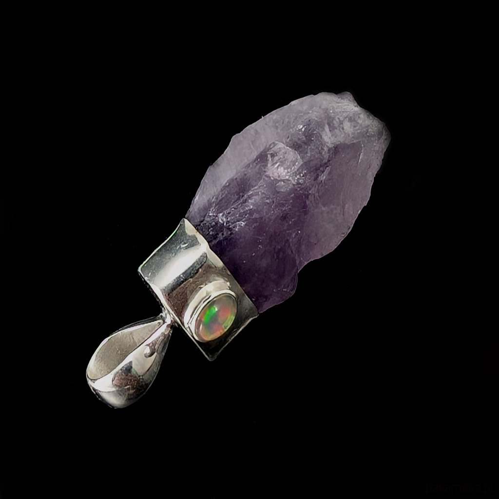 Oryginalny wisiorek wykonany ze srebra próby 925 oraz pięknego, surowego ametystu. Towarzyszy mu multibarwny opal etiopski. Wymiary wisiorka max 40 x 13 mm. Waga 8,2 grama. Wykonany przez dostawcę kamieni. Zawieszka zostanie zapakowana w ozdobne pudełeczko.