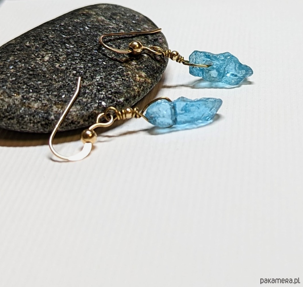 Wyjątkowy egzemplarz. Kolczyki zostały wykonane ze złota gold filled, na którym są zawieszone bryłki surowego kamienia apatytu. Kamień ma niezwykły, intensywny kolor i duży poziom przezierności. Przepuszcza promienie światła i emanuje blaskiem. Bryłka nie jest lśniąca, raczej sprawia wrażenie, jakby kamień świecił od środka. Bardzo krótka seria ze względu na unikatowość kamieni tej jakości.