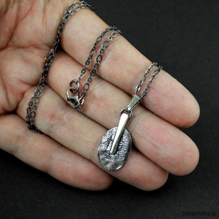 Ciemne jak głębiny nocy srebro otula ten wisiorek, niosąc w sobie oddech żaru i chłodu jednocześnie. Barwy układają się tu w opowieść – grafitowe szarości przypominają deszczowy asfalt o poranku, gdy nad miastem wisi mgła, a polerowane srebro niczym struga księżycowego światła przecina aksamitną czerń. Faktura owalnej blaszki jest jak fragment skały wyrzeźbionej przez wiatr, z widocznymi żyłkami i zarysami, które przy każdym ruchu chwytają światło, by zaraz zniknąć w cieniu. Wąski, polerowany pasek srebra, lśniący niczym strużka rtęci, biegnie przez środek kompozycji, nadając jej surową harmonię i oddech przestrzeni. Długość wisiorka 3,2 cm, szerokość 1,2 cm, a łańcuszek o obwodzie ok. 55 cm okala szyję ciemnym, grafitowym rytmem, tworząc spokojny, industrialny rytuał codzienności. Całość wykonana ręcznie ze srebra próby 925, oksydowanego i polerowanego w miejscach dostępnych, z poszanowaniem naturalnych rysunków metalu. Istnieje możliwość zmiany długości łańcuszka (proszę o wiadomość przed zakupem). Biżuteria zostanie zapakowana w eleganckie etui, gotowa, by stać się osobistym amuletem.