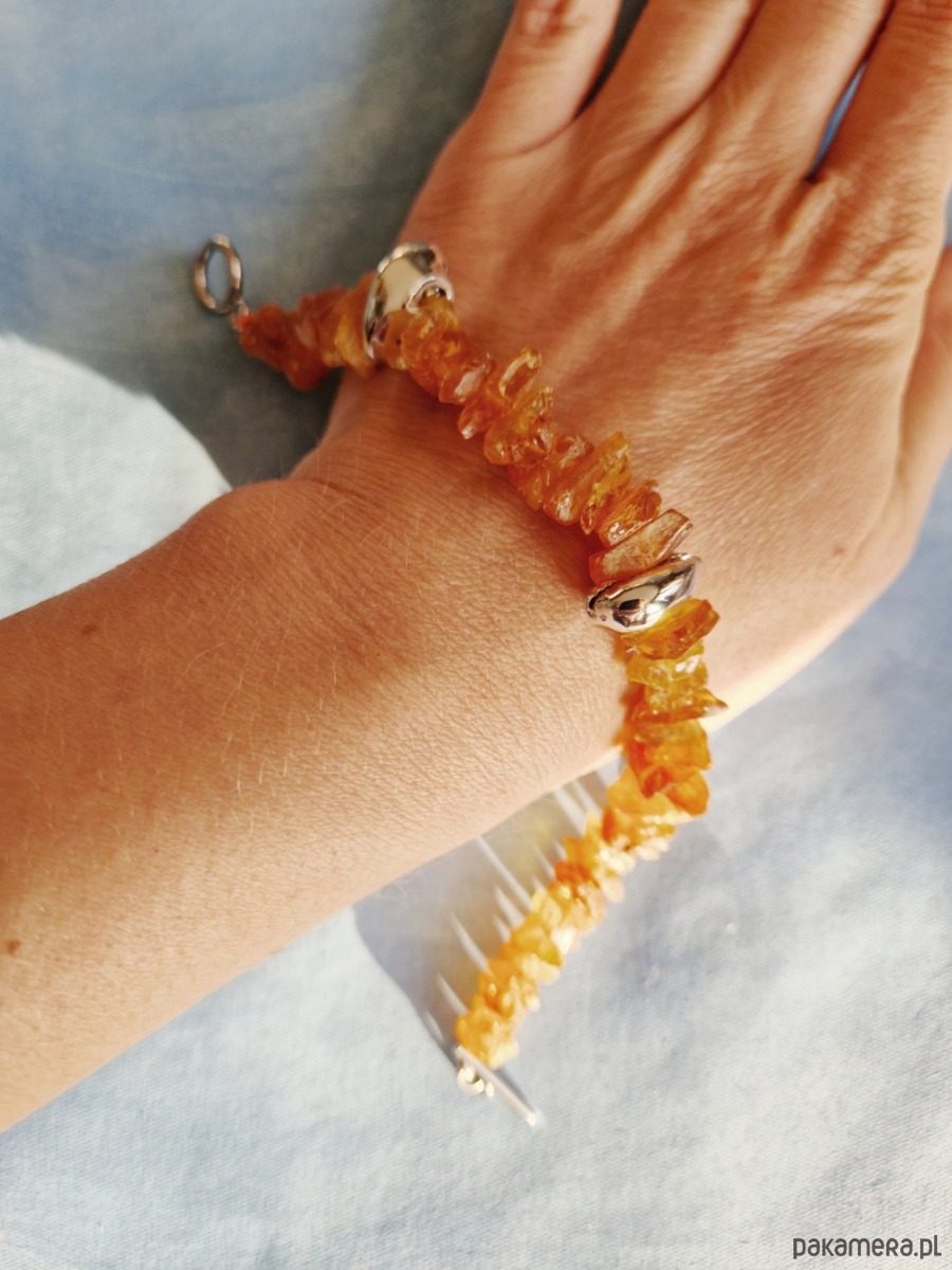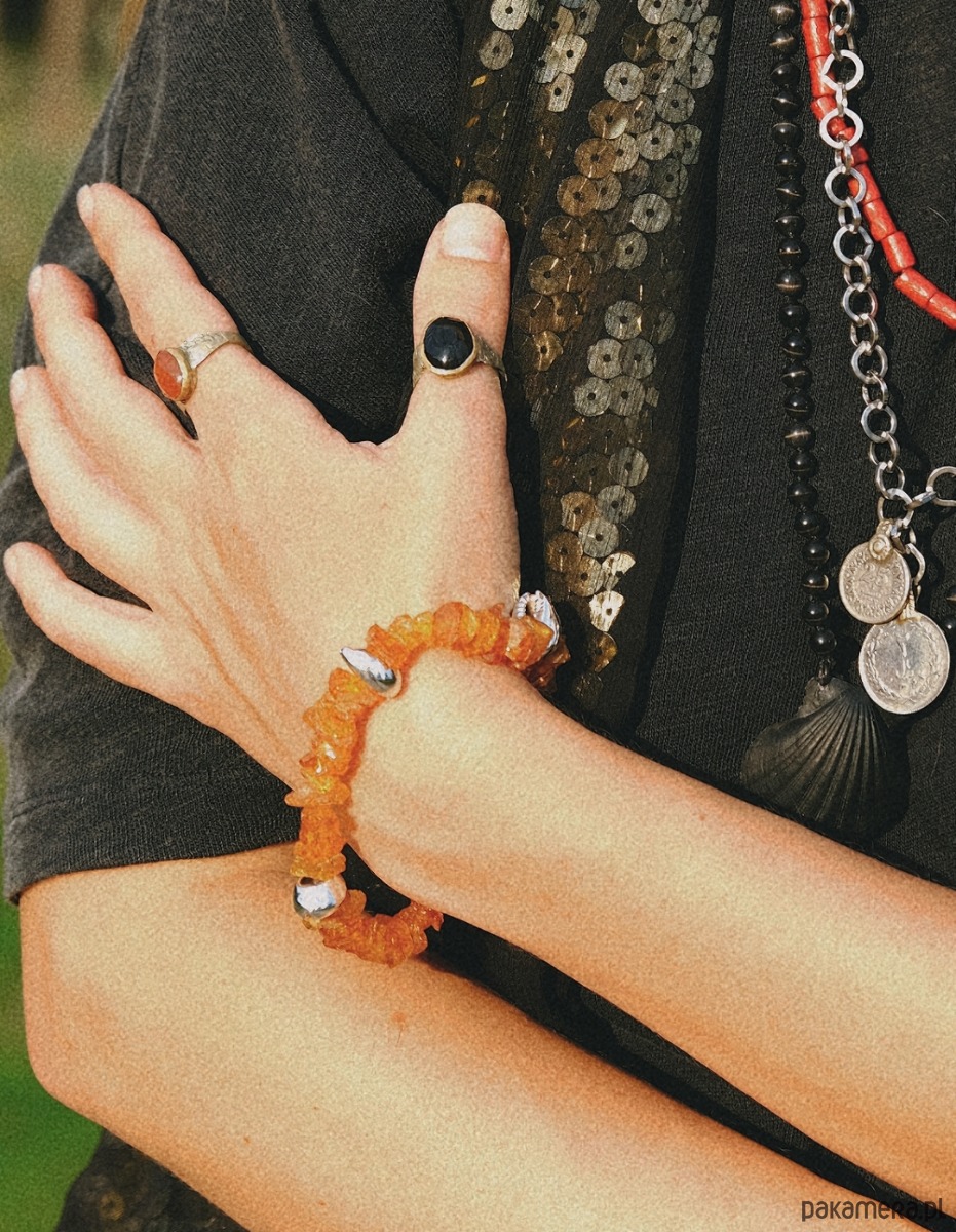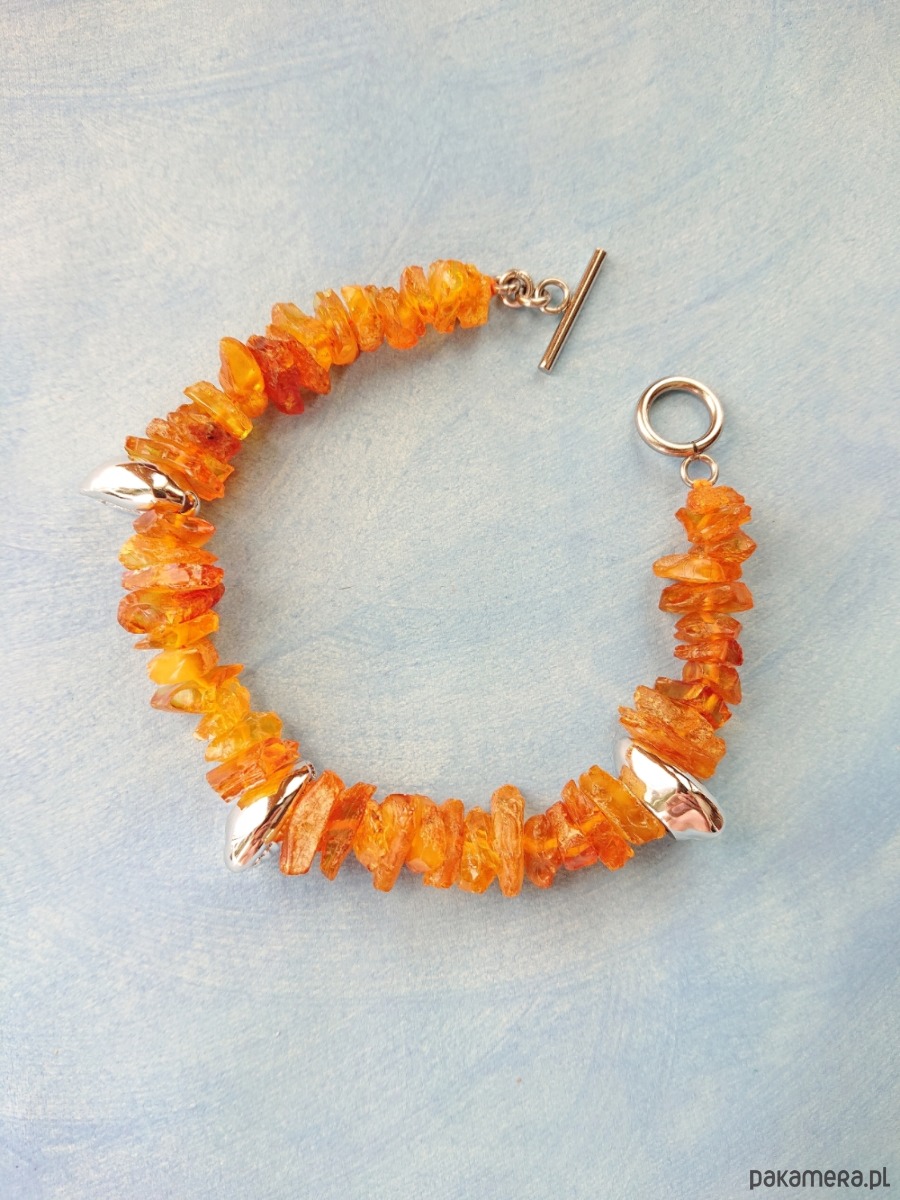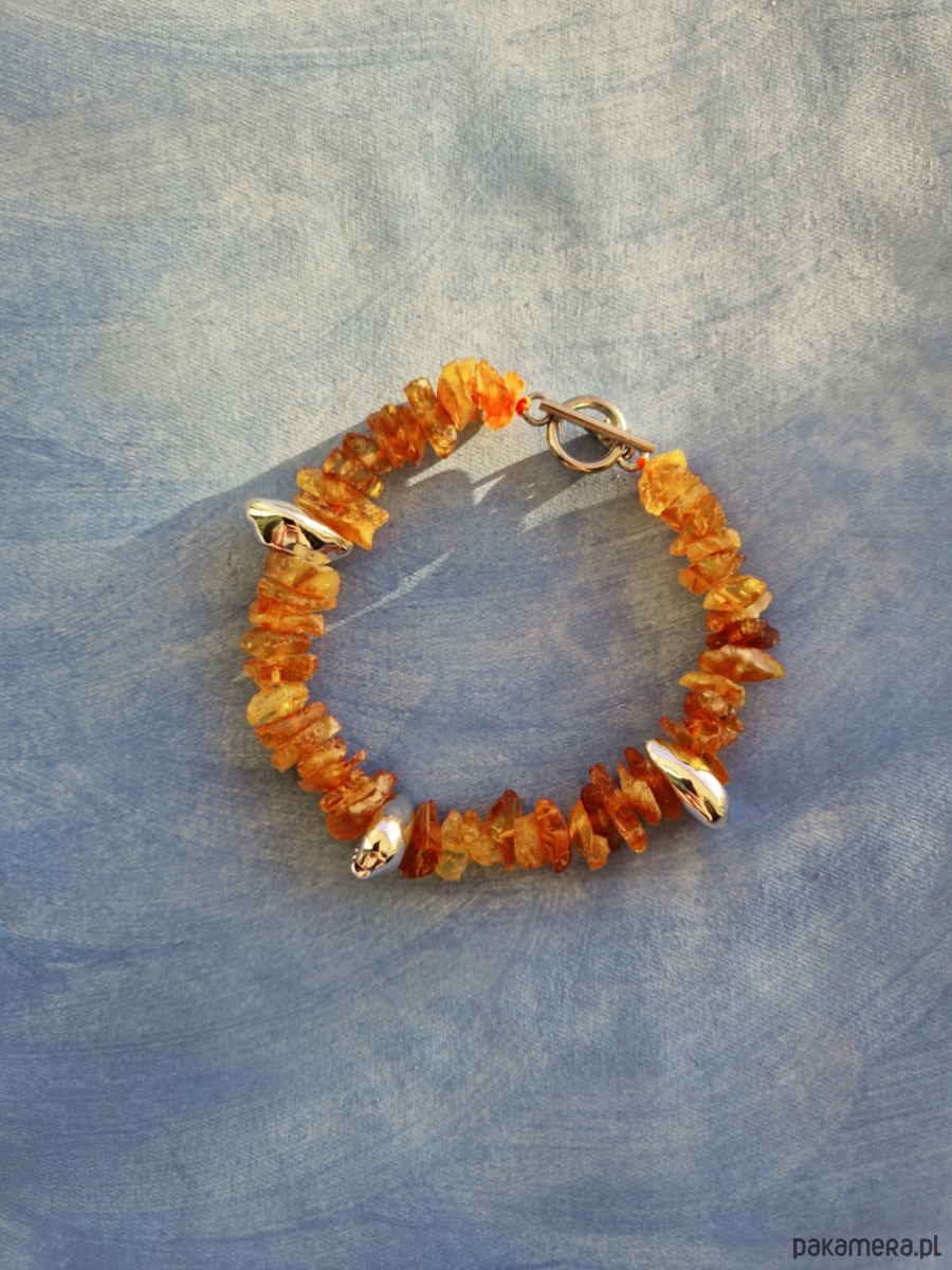 Bransoletka z surowego bursztynu w jasnym kolorze przeplatana kilkoma naturalnymi muszlami kauri platerowanymi na srebrny kolor.