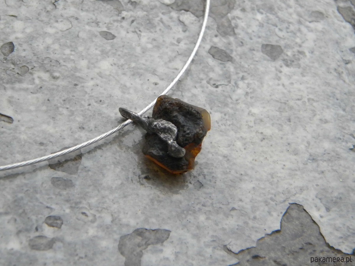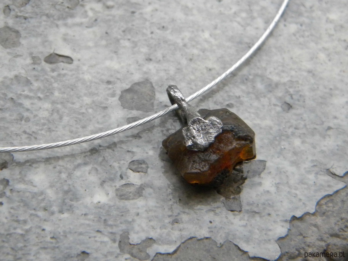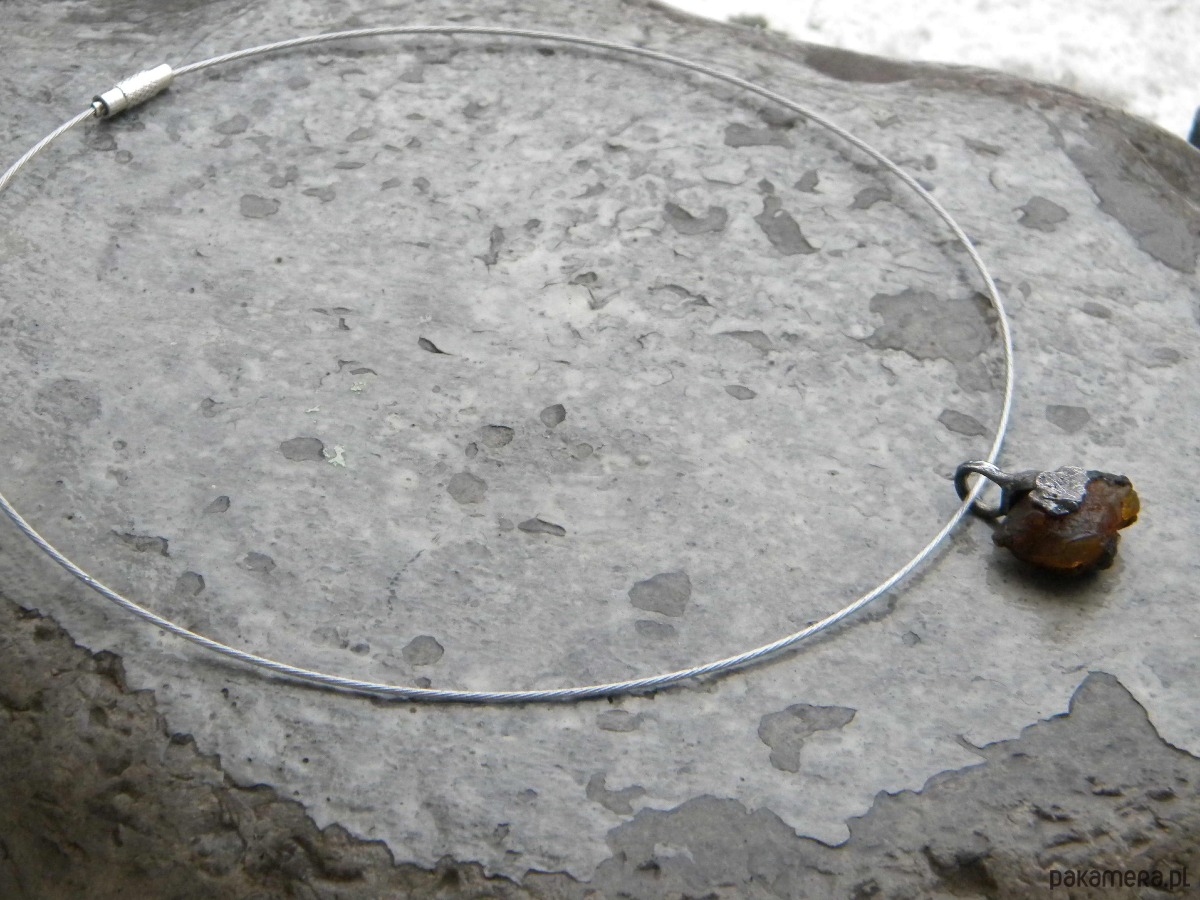 surowy bursztyn oprawiony w ocynowaną miedz.