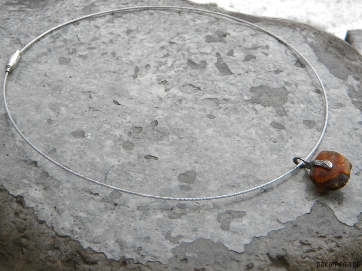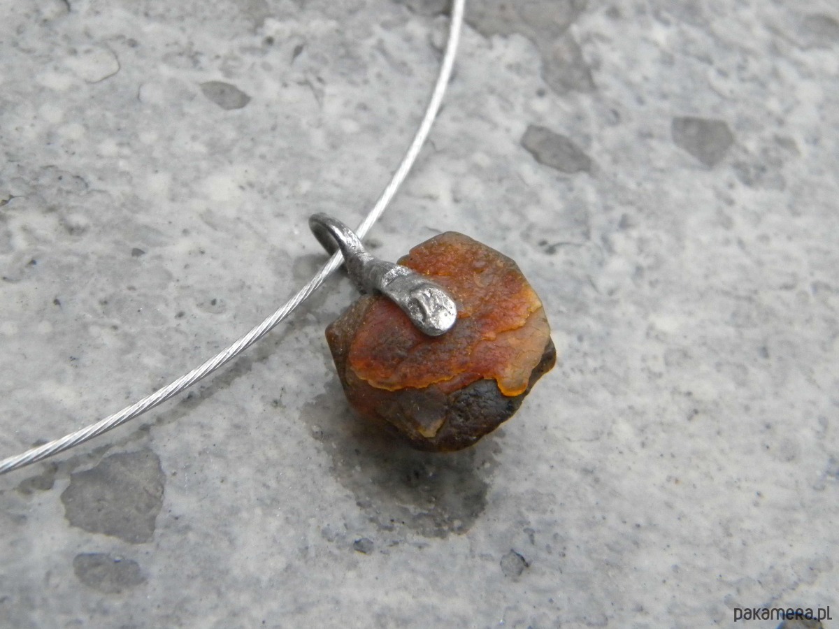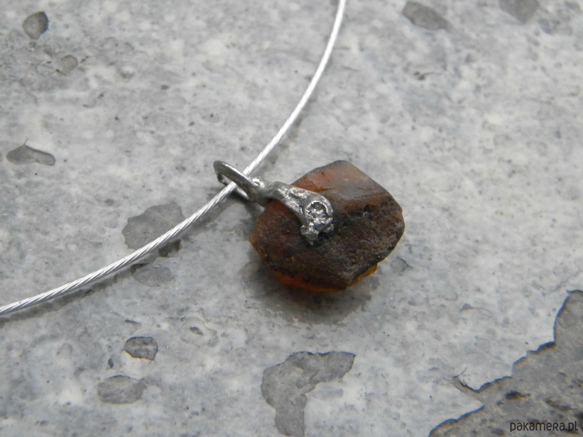 surowy bursztyn oprawiony w ocynowaną miedz.