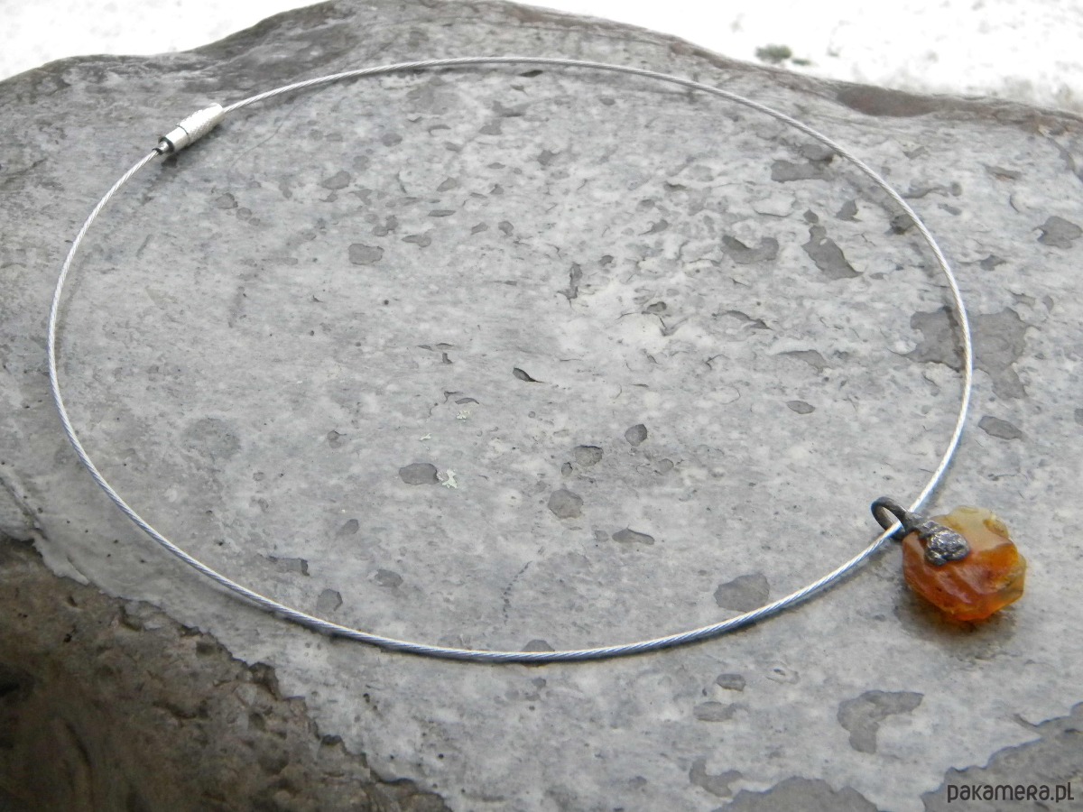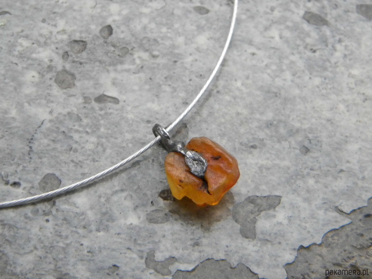 surowy bursztyn oprawiony w ocynowaną miedz.