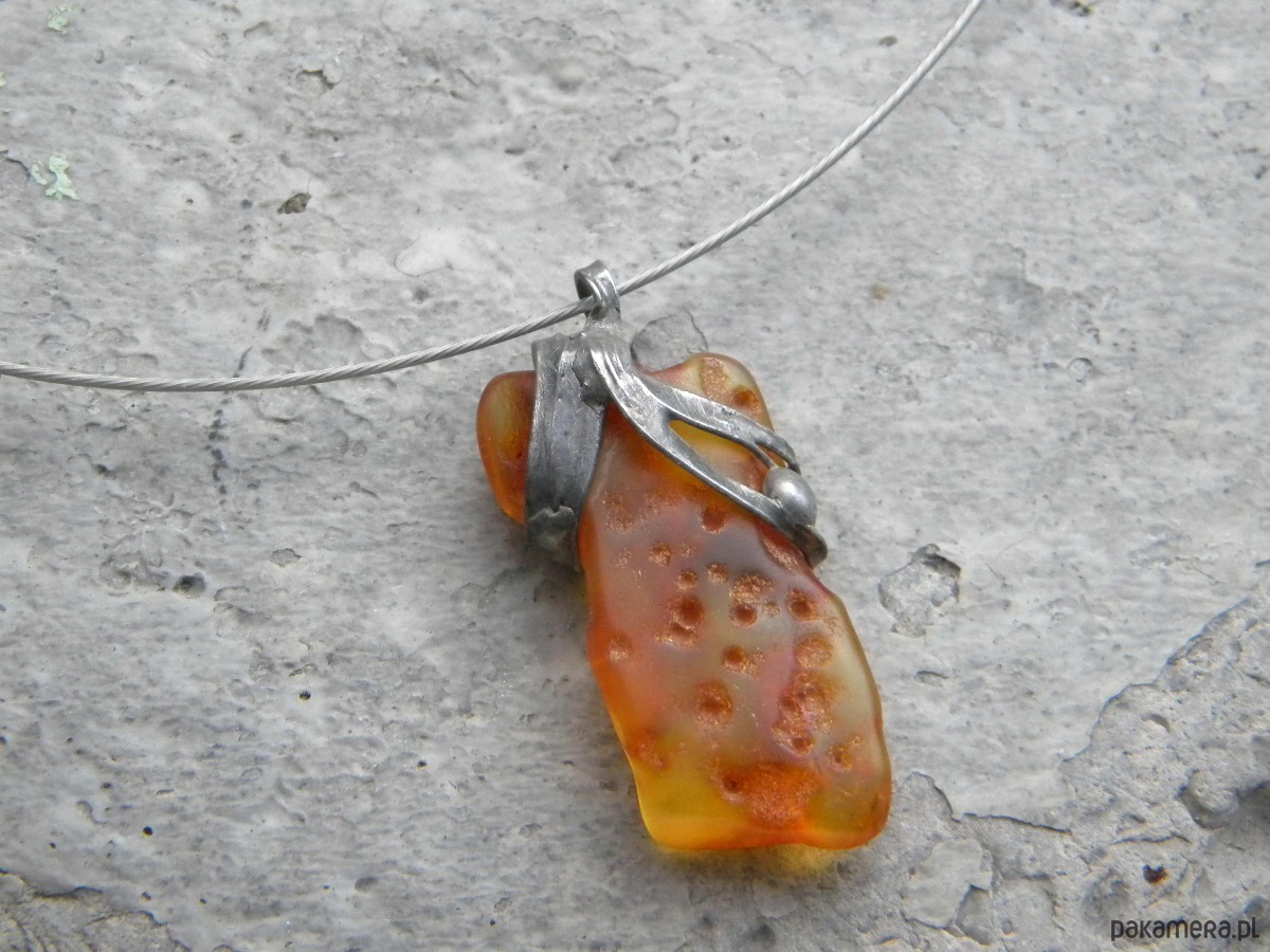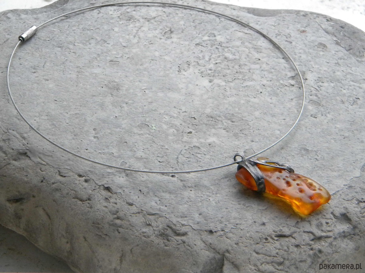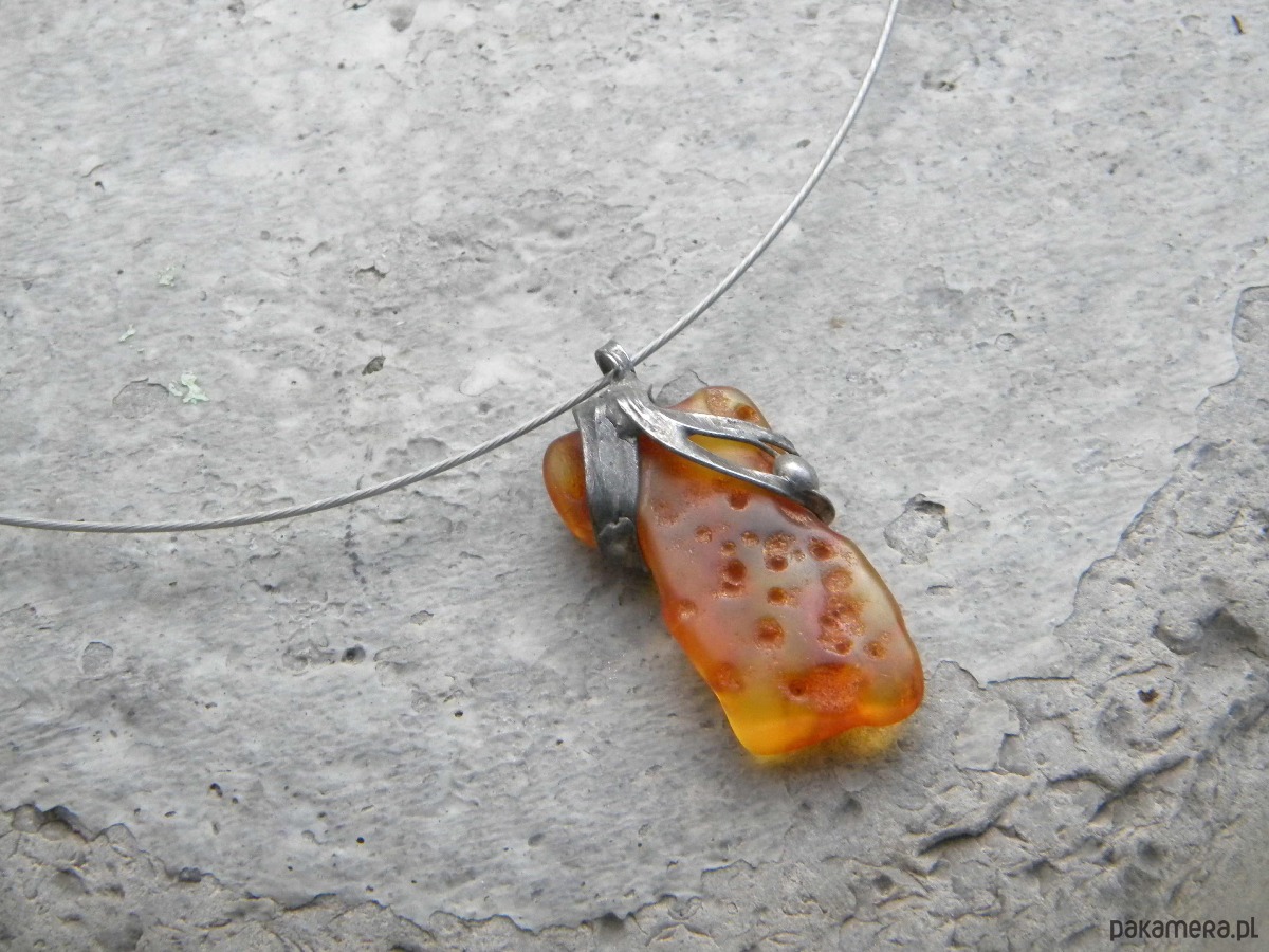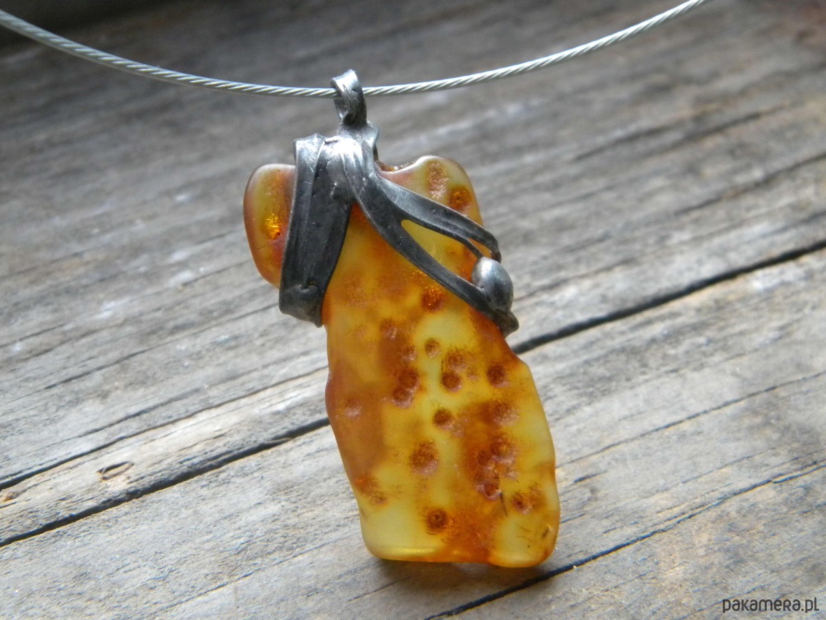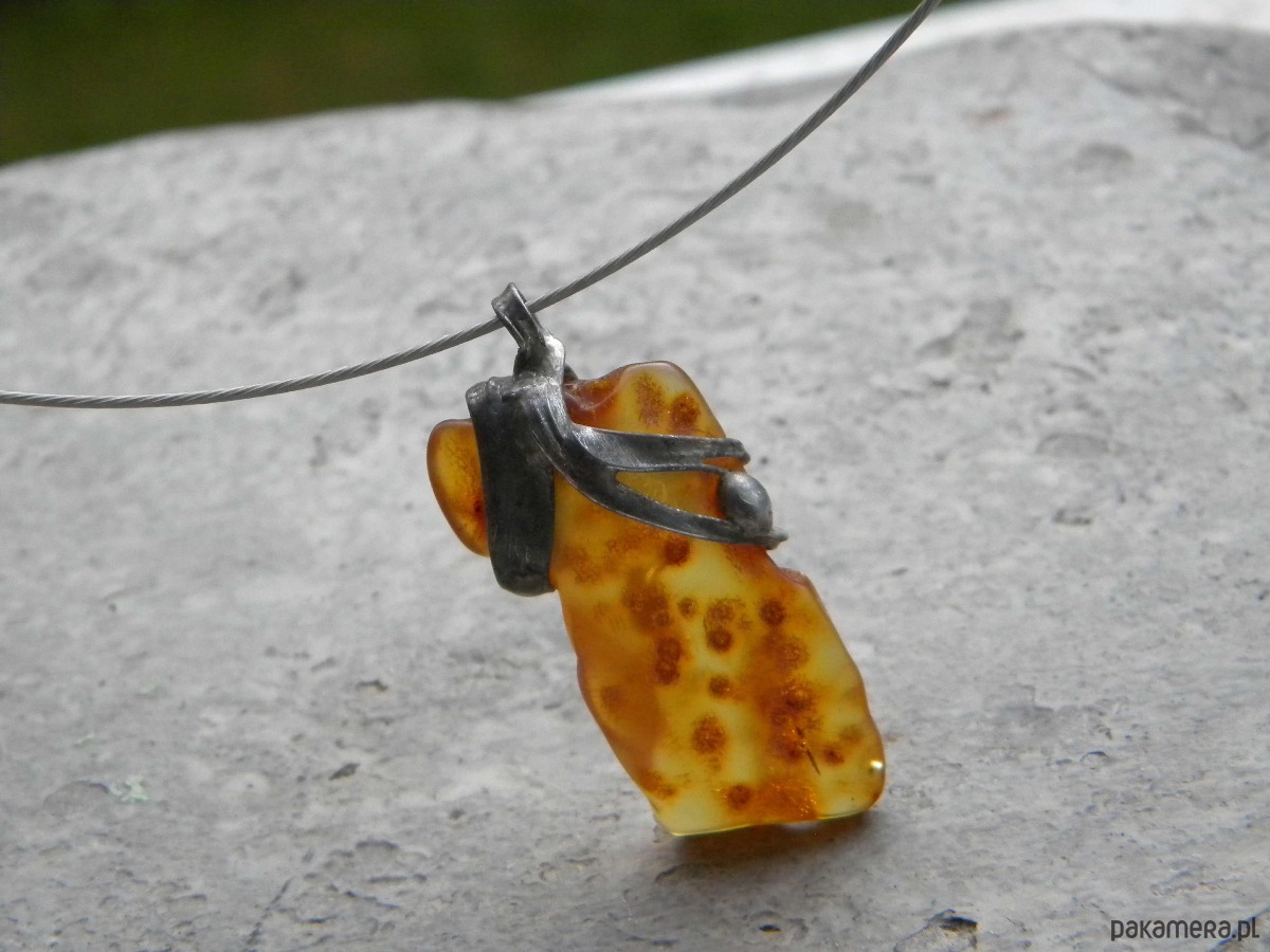 surowy bursztyn oprawiony w ocynowaną miedz.