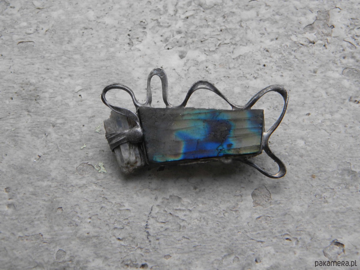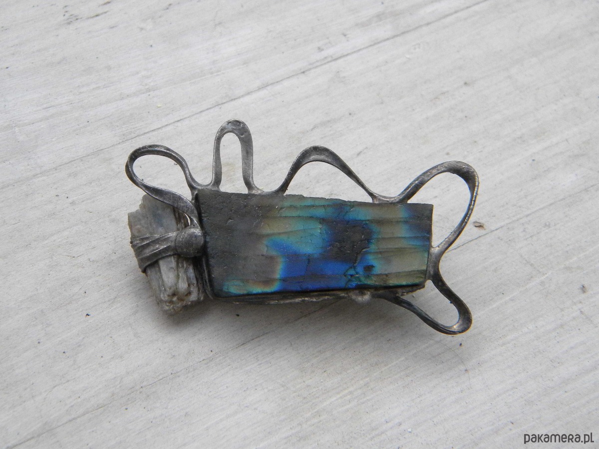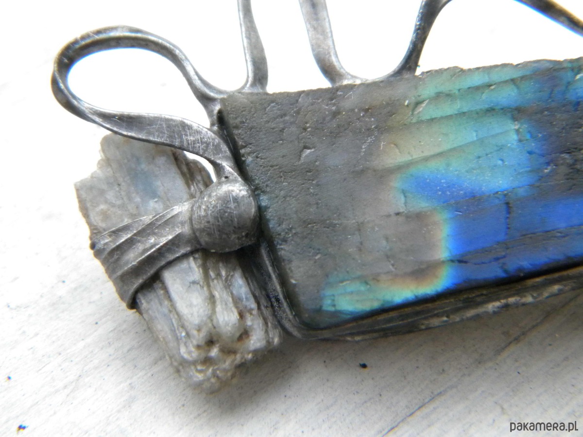 Broszka z surowego labradorytu i surowego kianitu w ocynowanej miedzi.