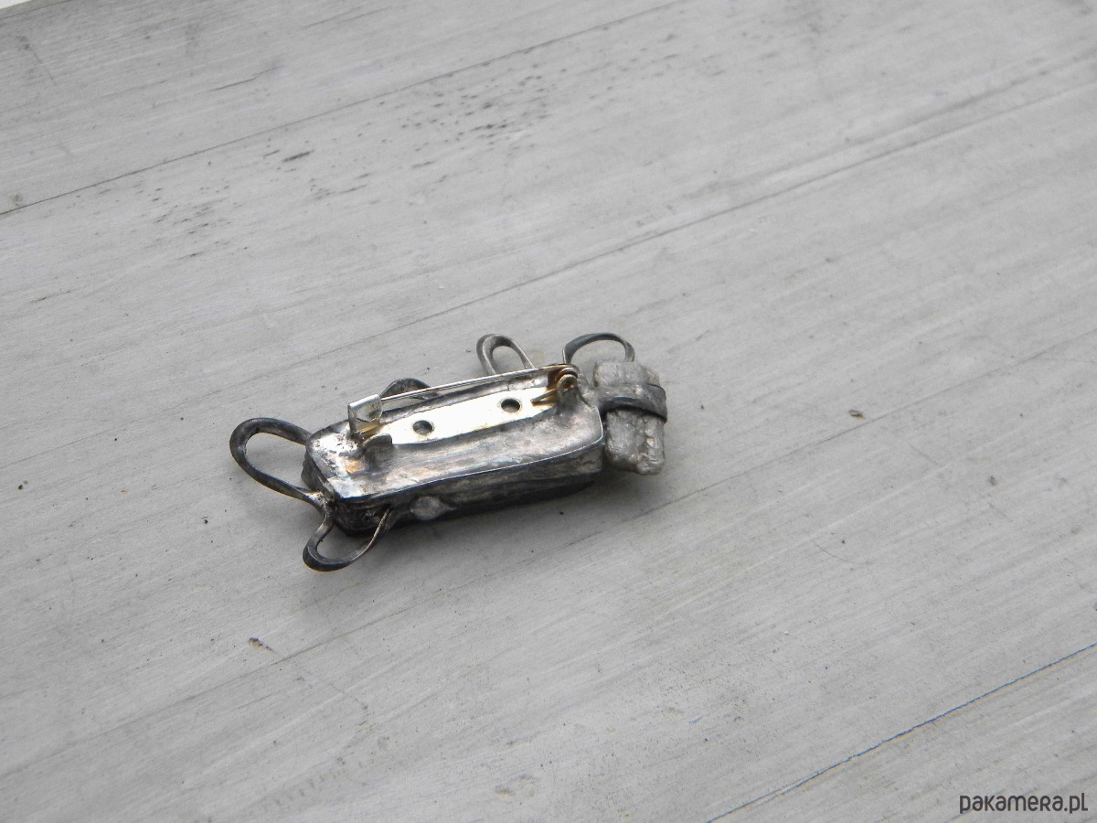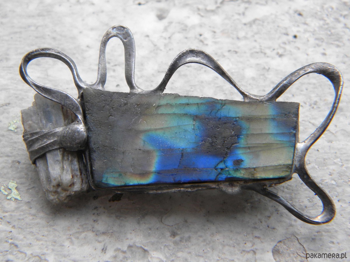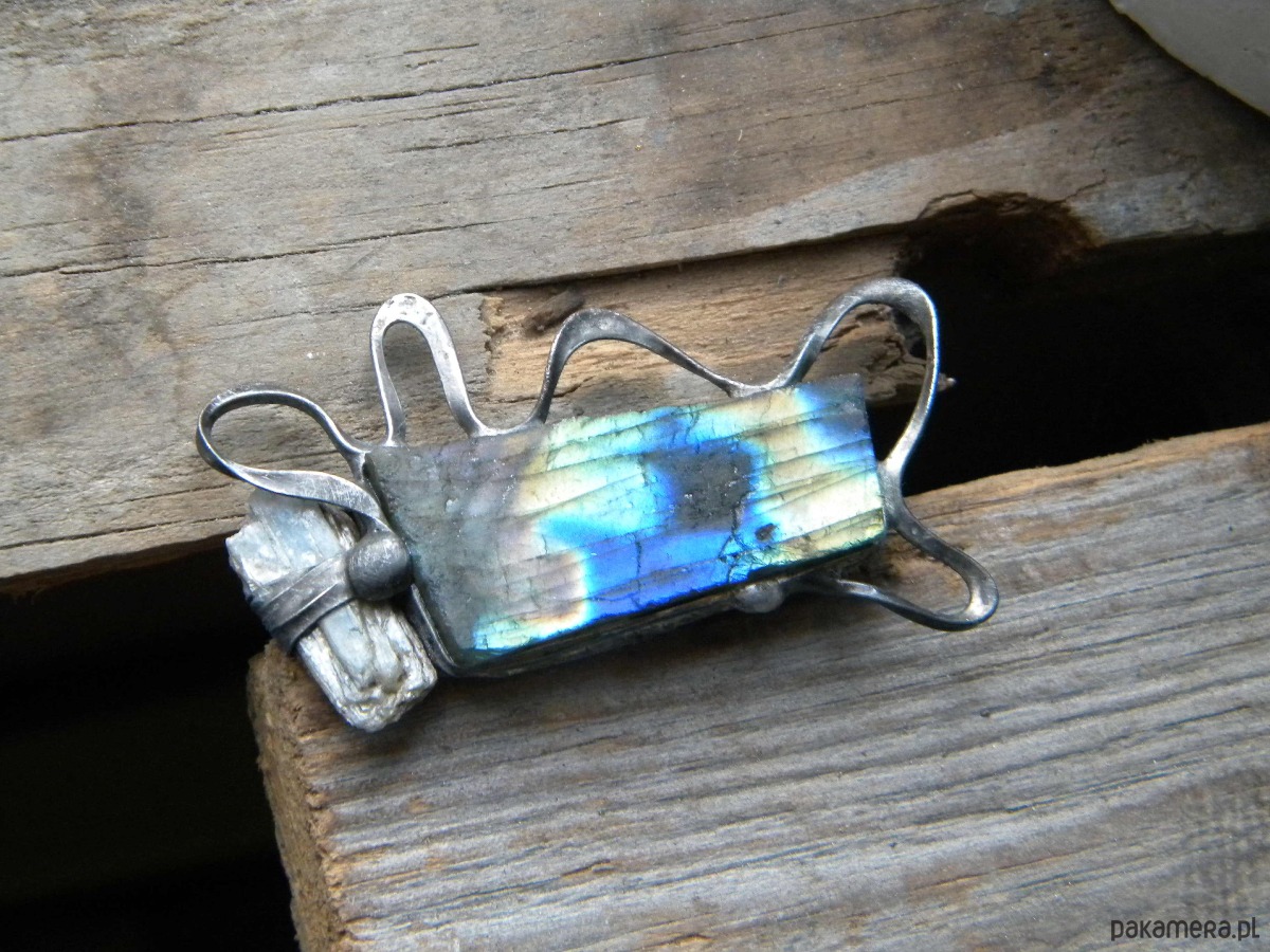 Broszka z surowego labradorytu i surowego kianitu w ocynowanej miedzi.