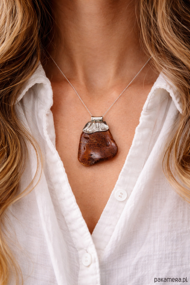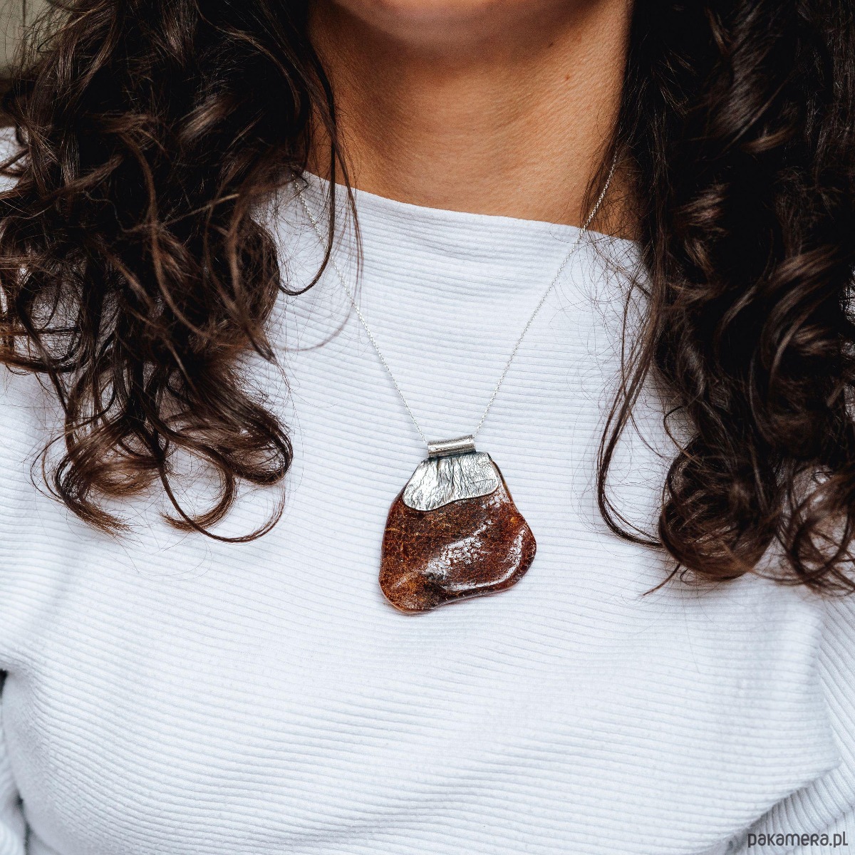 Wyjątkowy naszyjnik z ciemnego bursztynu bałtyckiego i srebra — połączenie surowej natury z nowoczesnym rzemiosłem. Centralny element stanowi nieoszlifowany, nieregularny kamień bursztynu o głębokiej, ziemistej barwie, którego chropowata powierzchnia i naturalne inkluzje podkreślają autentyczność i unikalny charakter każdego egzemplarza. Kamień oprawiony jest w teksturowane srebro próby 925, dodające całości rustykalnego, a jednocześnie eleganckiego wyrazu.