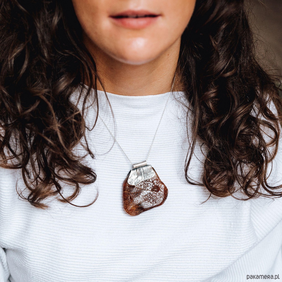 Projekt skierowany do osób ceniących biżuterię o organicznym charakterze, miłośników stylu boho, natury i rękodzieła. Każdy element bursztynu ma unikalne pęknięcia, linie i inkluzje, które opowiadają swoją własną, naturalną historię, dzięki czemu naszyjnik jest niepowtarzalny. Teksturowana oprawa ze srebra dopełnia kompozycję, nadając jej artystycznego i współczesnego sznytu. Produkt idealnie sprawdzi się jako wyróżniający się dodatek do codziennych oraz bardziej formalnych stylizacji, a także jako znaczący prezent dla osób obchodzących listopadowe urodziny.