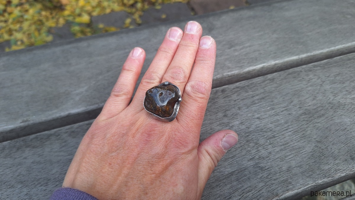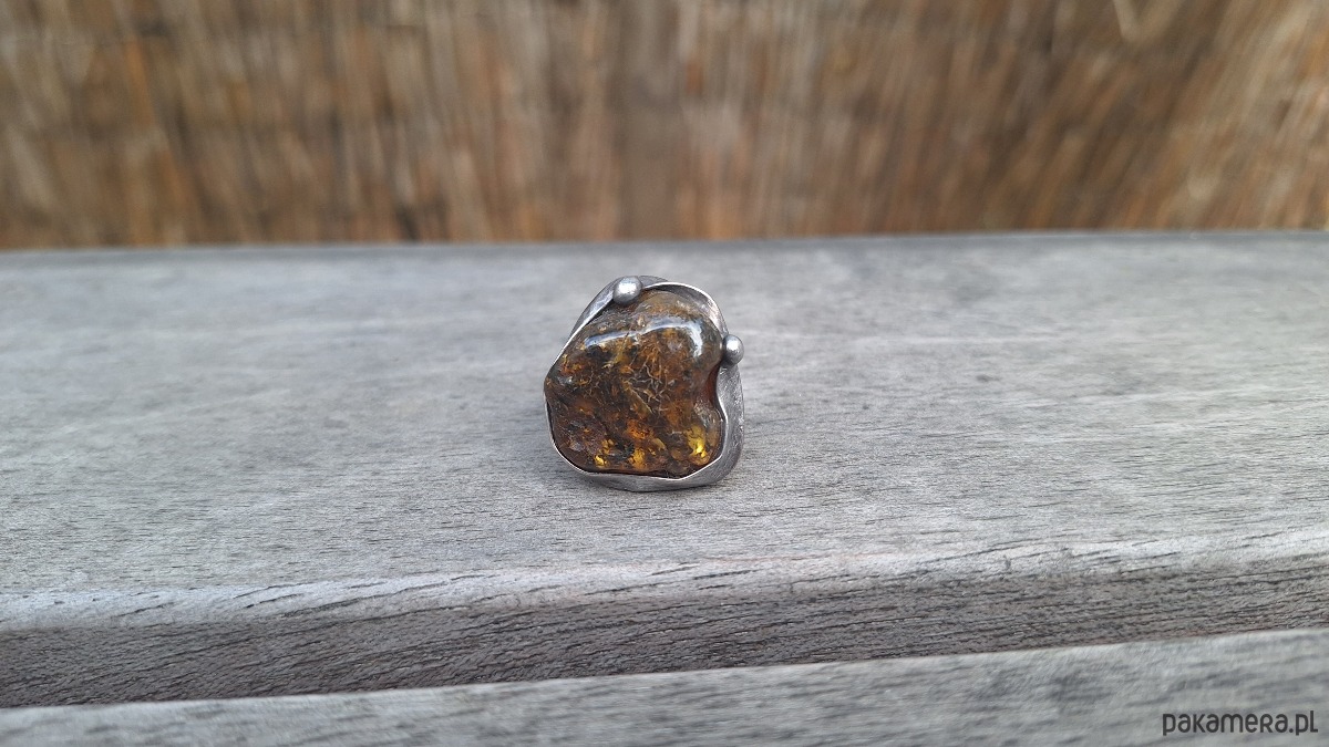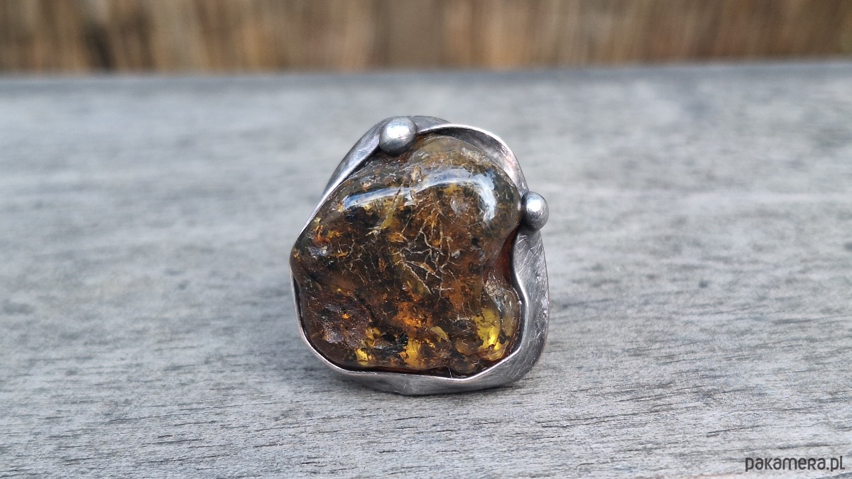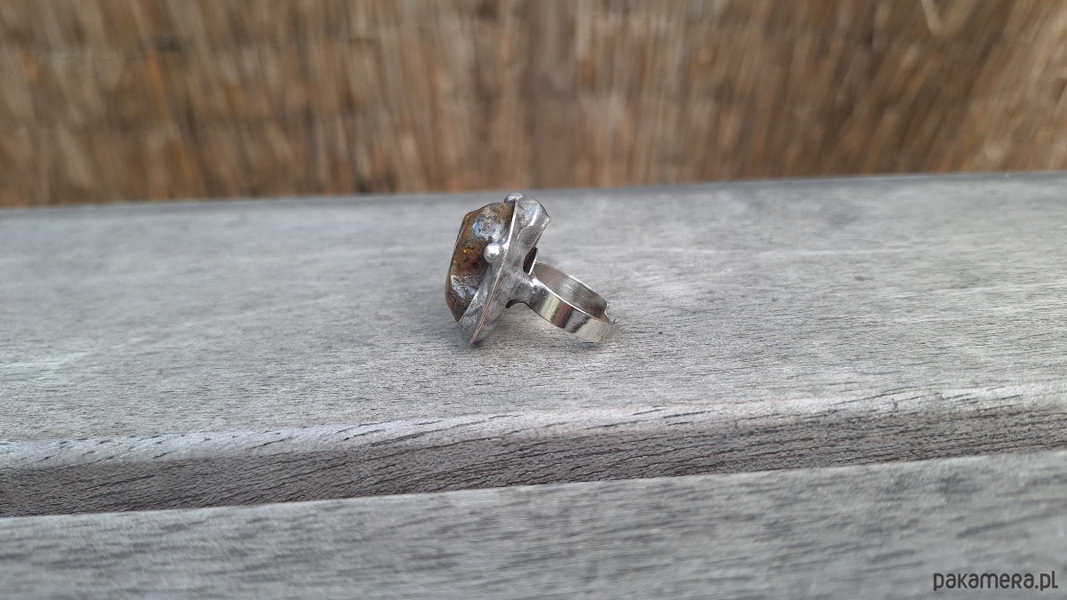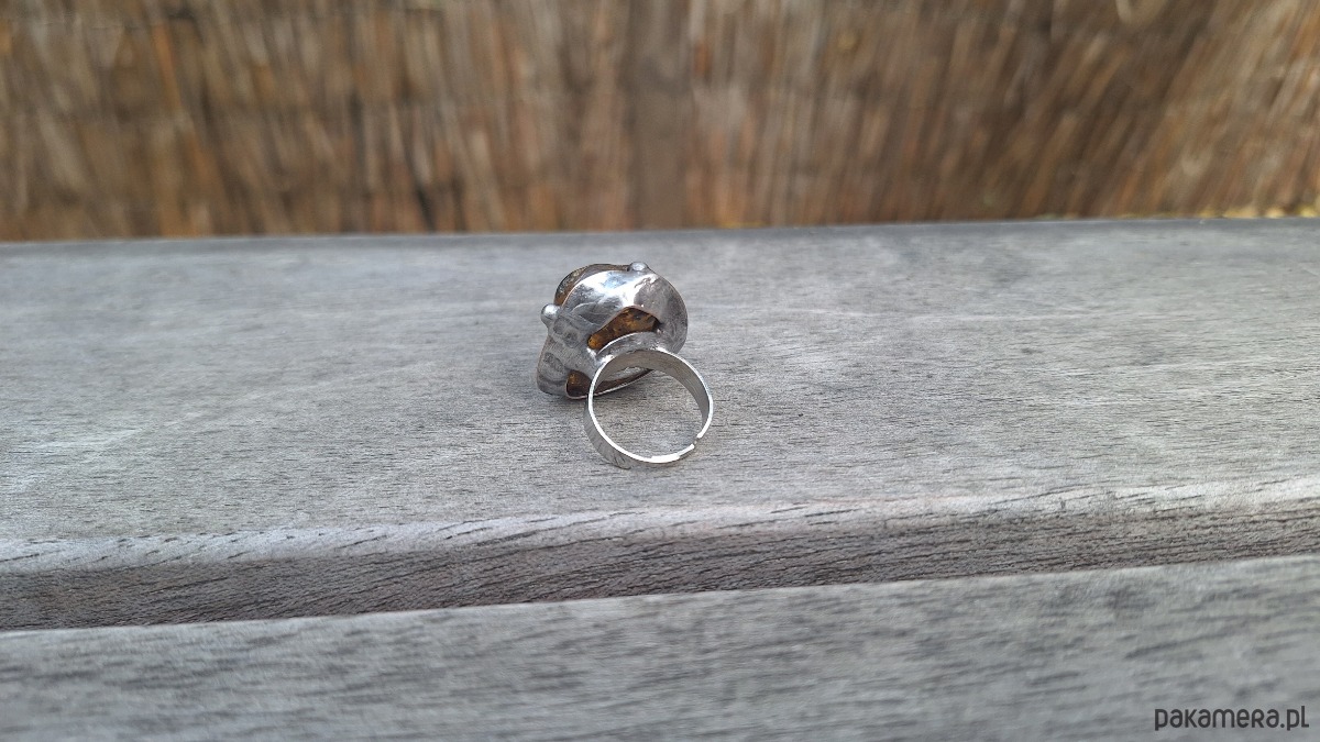 Pierścionek wykonany z miedzi, cyny i bursztynu. Wymiary ok. 2.3 na 2.3 cm. Regulowany. Nie jest ciężki.