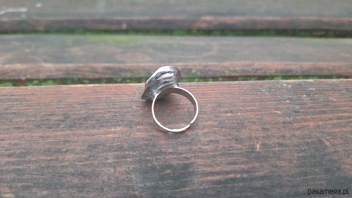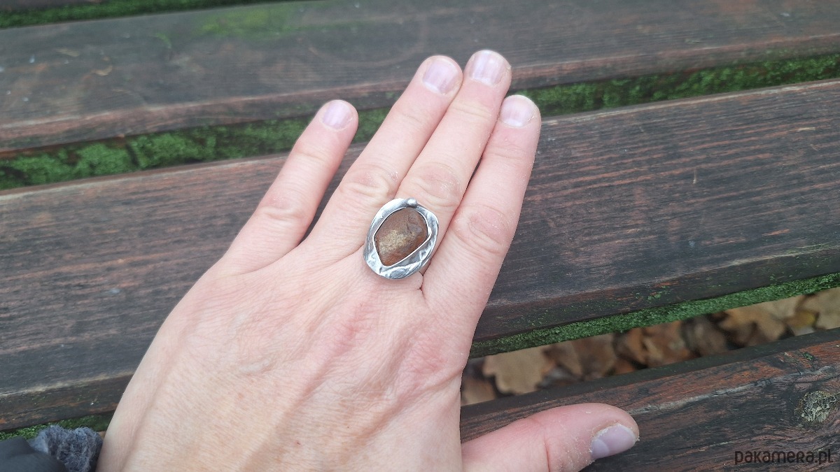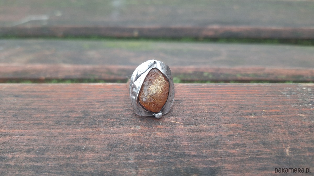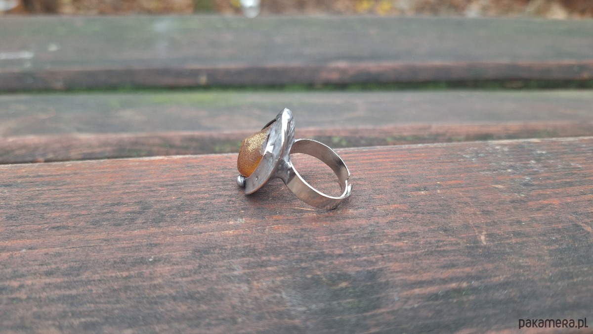 Pierścionek wykonany z miedzi, cyny i bursztynu. Wymiary ok. 2 na 1.7 cm. Regulowany. Nie jest ciężki.