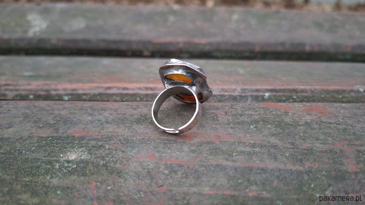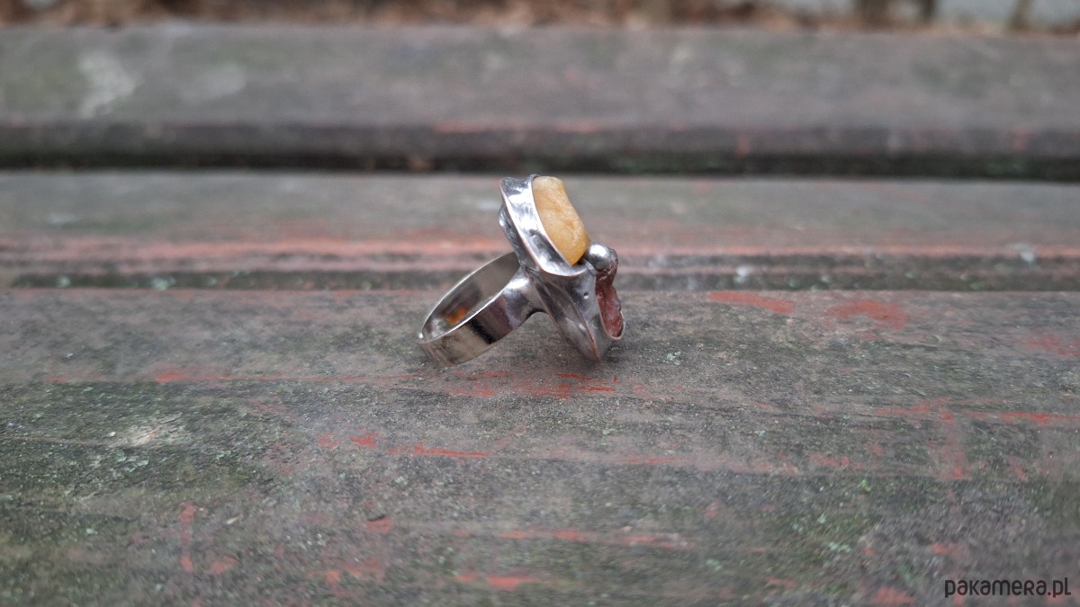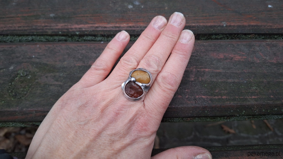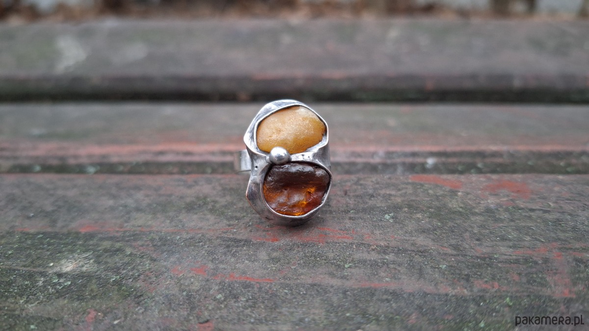 Pierścionek wykonany z miedzi, cyny i bursztynów. Wymiary ok. 2.5 na 2 cm. Regulowany. Nie jest ciężki.