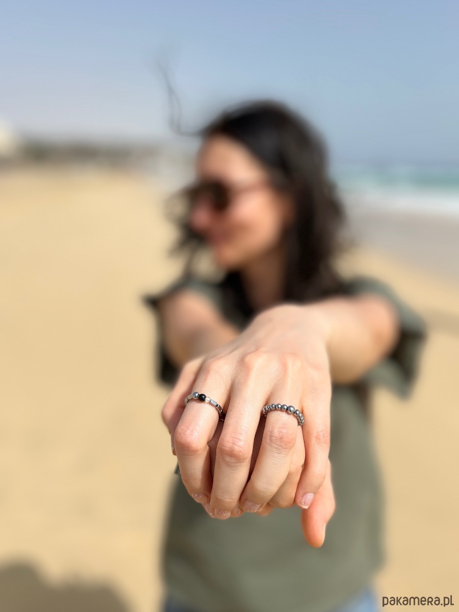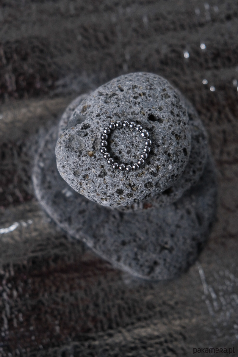 Minimalistyczny, drobny pierścionek ręcznie wykonany z kamyczków mineralnych (z galwanizowanego na kolor srebrny hematytu) oraz linki stalowej jubilerskiej najwyższej jakości.