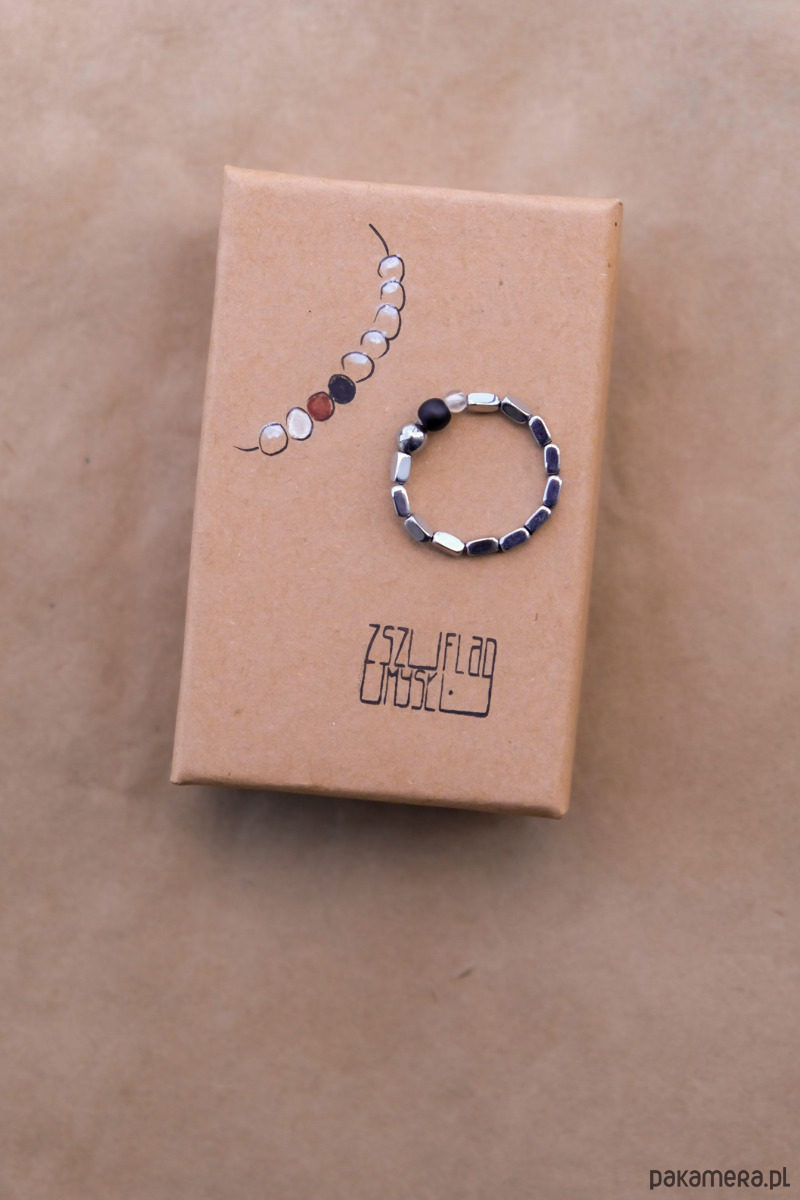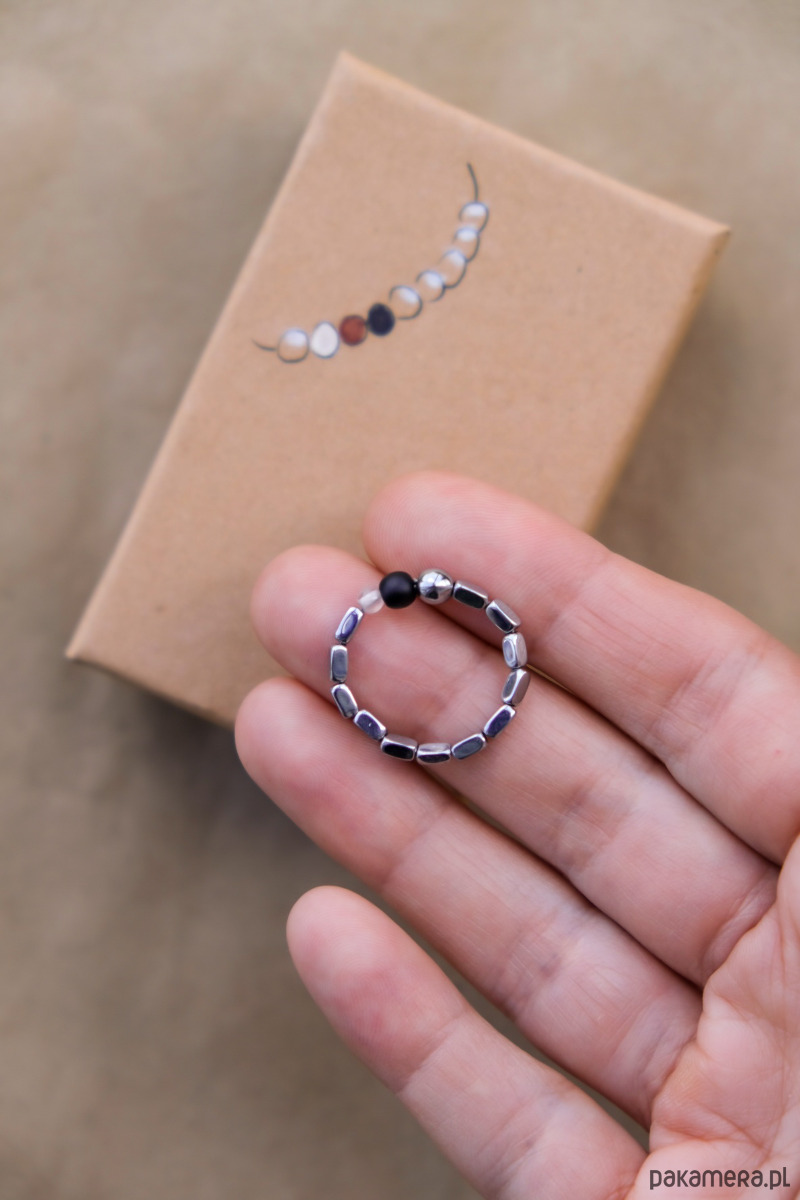 To pierścionek, który poczujesz od razu. Mały, minimalistyczny, ale pełen charakteru. Ręcznie wykonany z precyzją i sercem. Każdy drobny kamień – od galwanizowanego hematytu w kolorze srebra po bezbarwne akcenty – został dobrany tak, by cieszyć oko i sprawiać przyjemność noszenia. Całość na stalowej lince jubilerskiej najwyższej jakości.