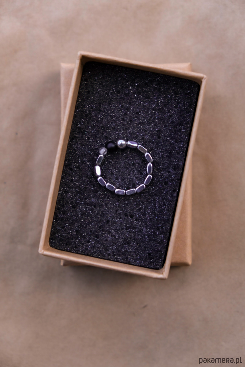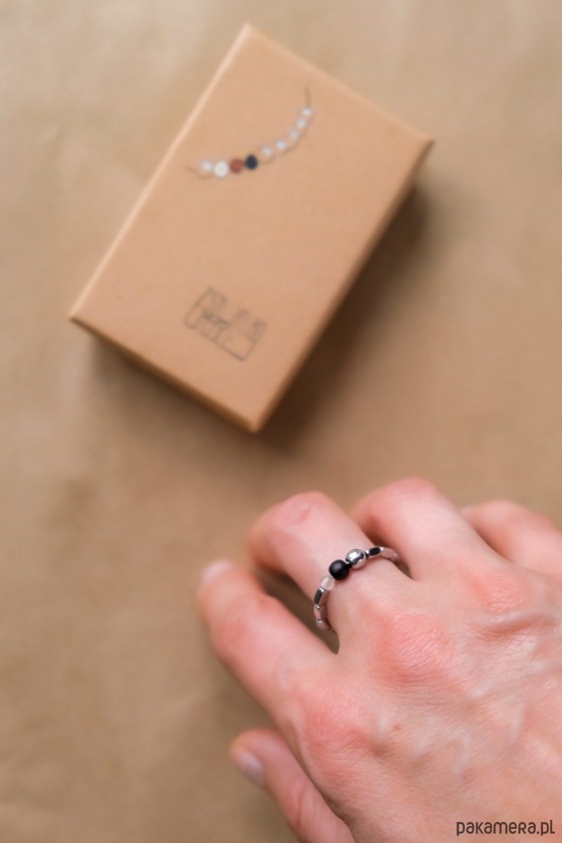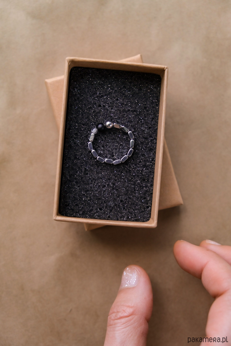 Biżuteria, która zachwyca – pierścionek minimalistyczny w kolorze srebra i czerni.