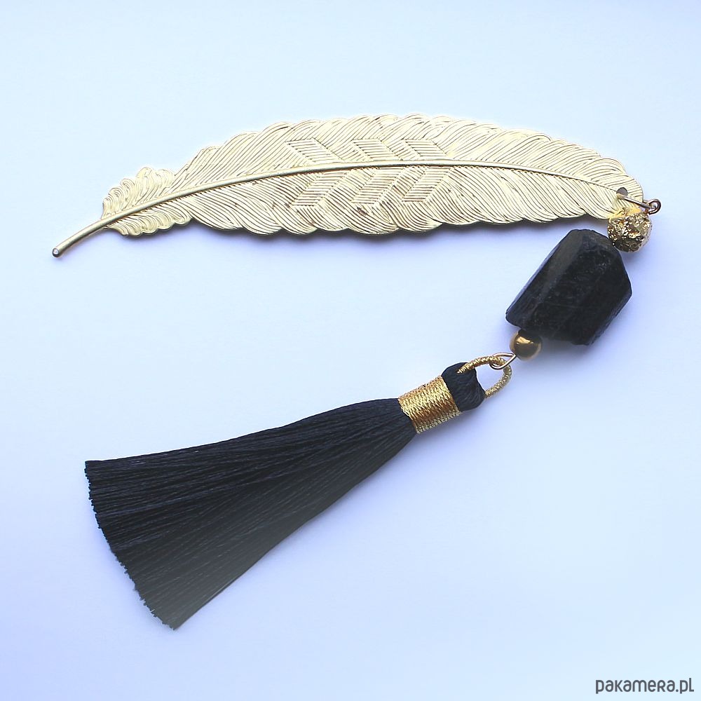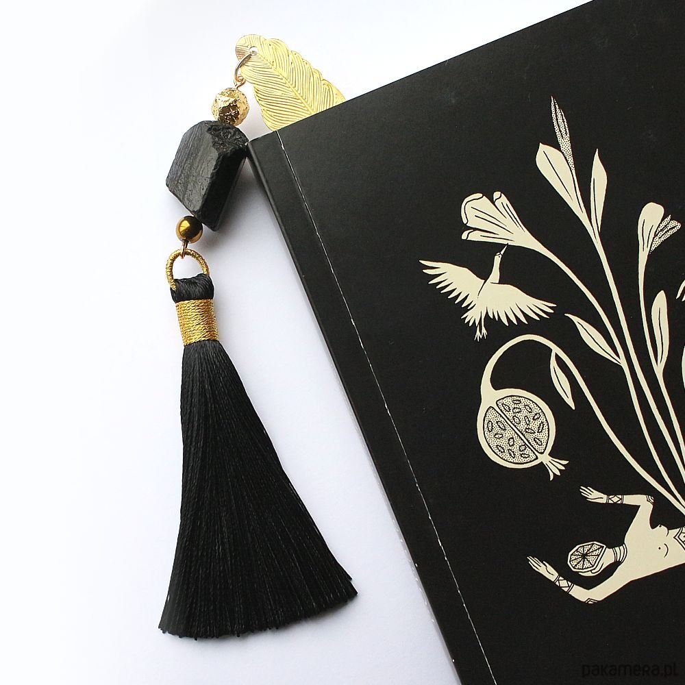 Elegancka etno zakładka do książki amulet ochronny w odcieniu czerni i złota. Ozdobiona surowym turmalinem, pozłacaną lawą wulkaniczną i hematytem.