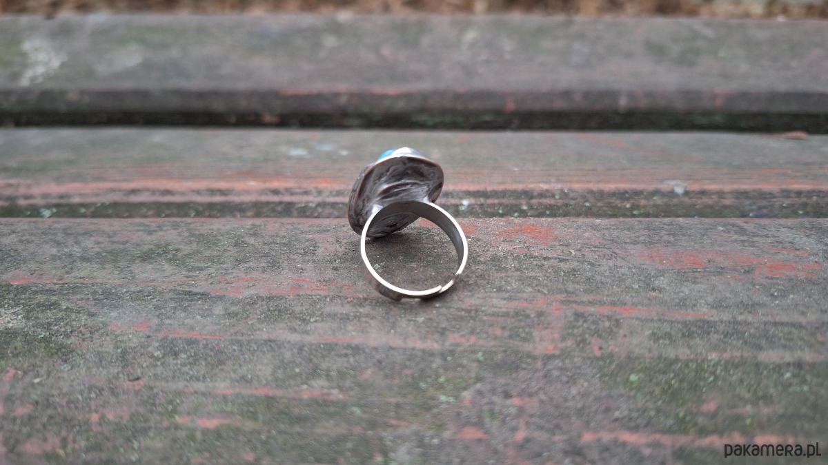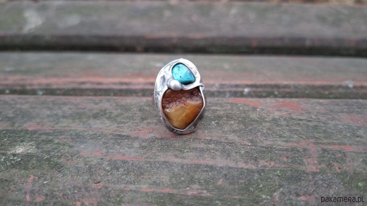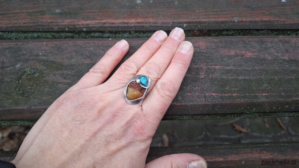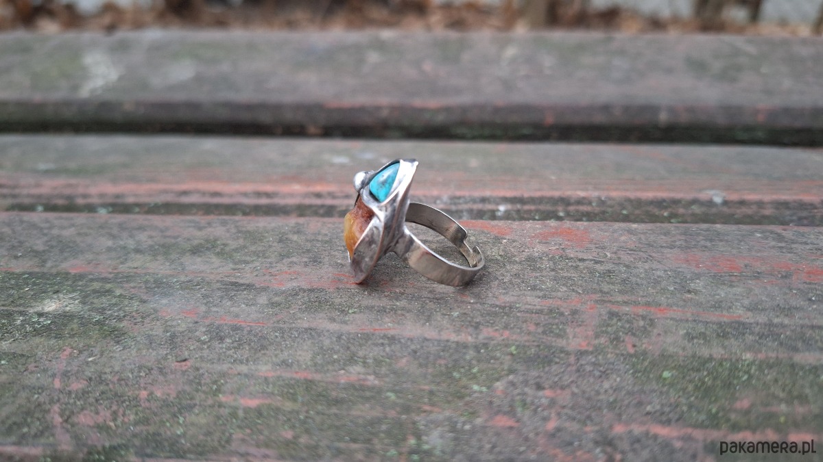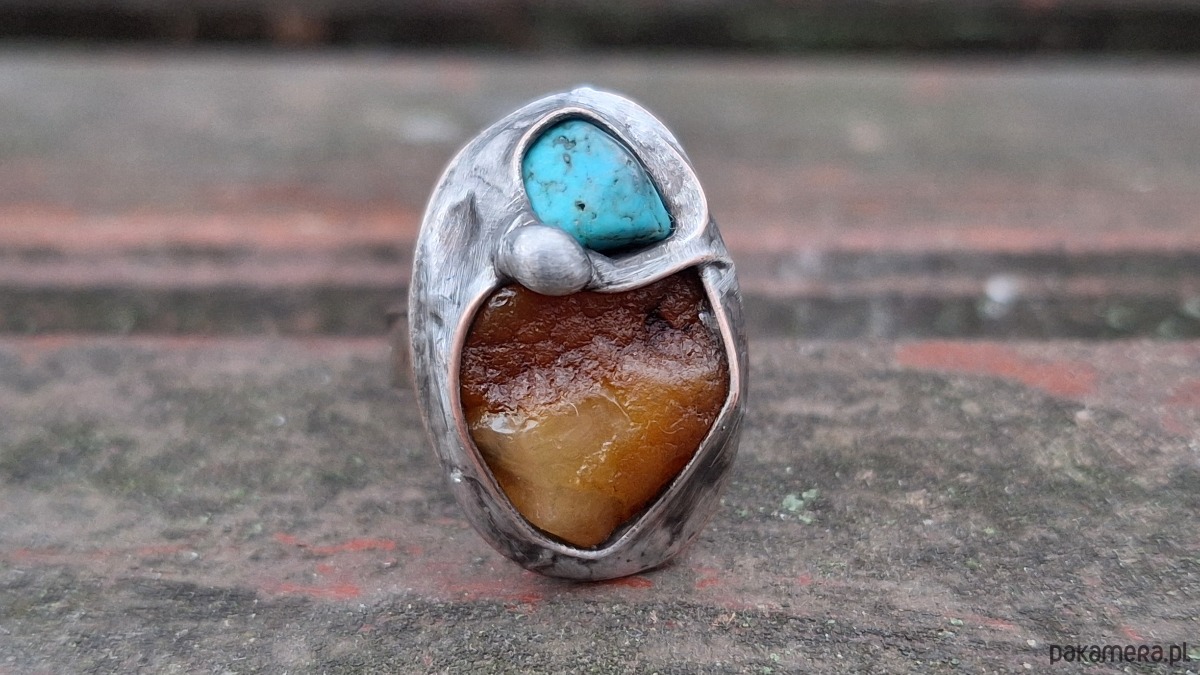 Pierścionek wykonany z miedzi, cyny, howlitu i bursztynu. Wymiary ok. 2.5 na 1.7 cm. Regulowany. Nie jest ciężki.