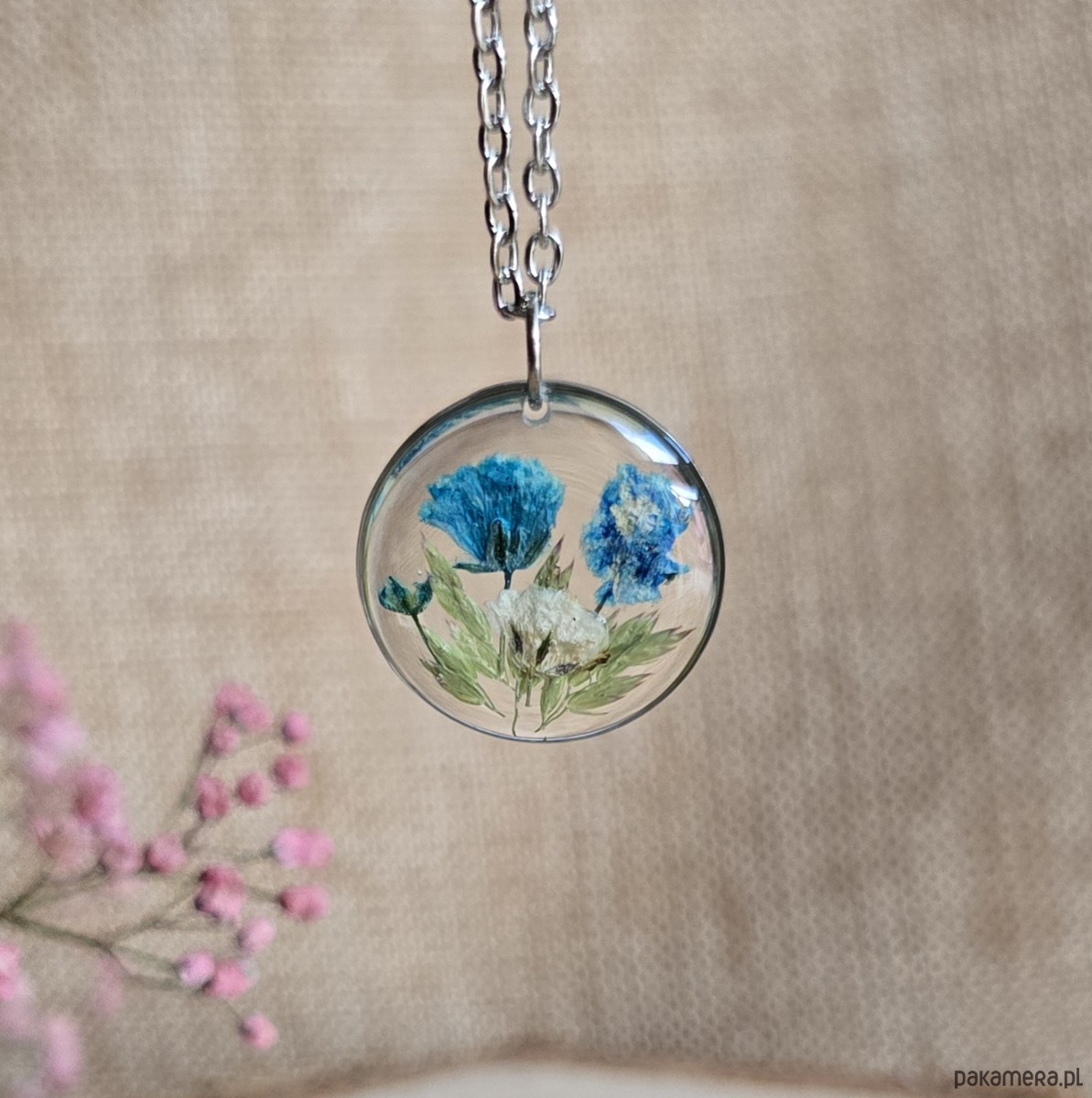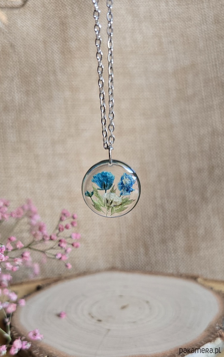 Oferuję Państwu unikalną biżuterię. Zawieszka jest wykonana z suszonych kwiatów i żywicy epoksydowej. Biżuteria jest wspaniałym i oryginalnym prezentem na lata.
