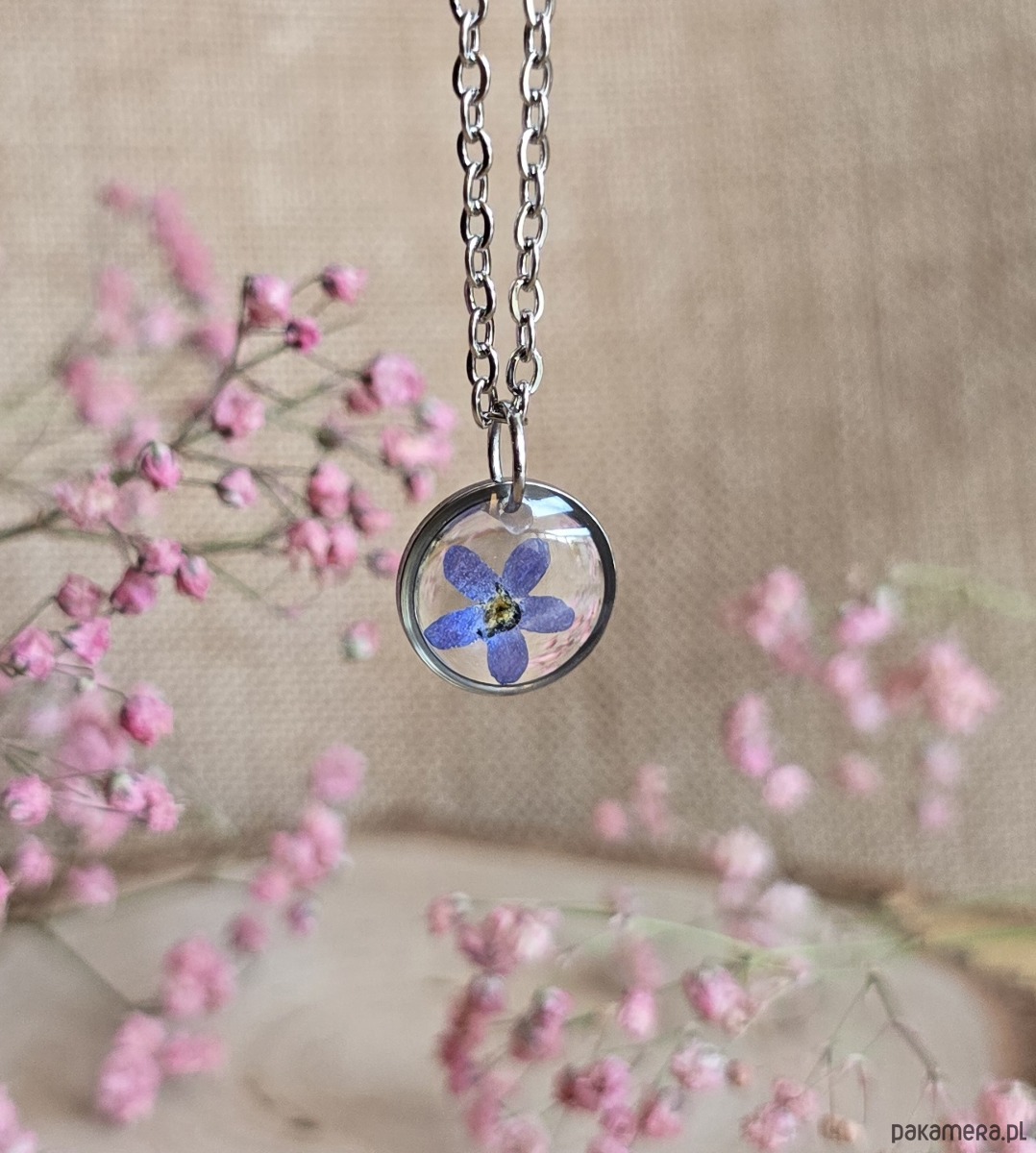 Oferuję Państwu unikalną biżuterię. Zawieszka jest wykonana z suszonych kwiatów i żywicy epoksydowej. Biżuteria jest wspaniałym i oryginalnym prezentem na lata.