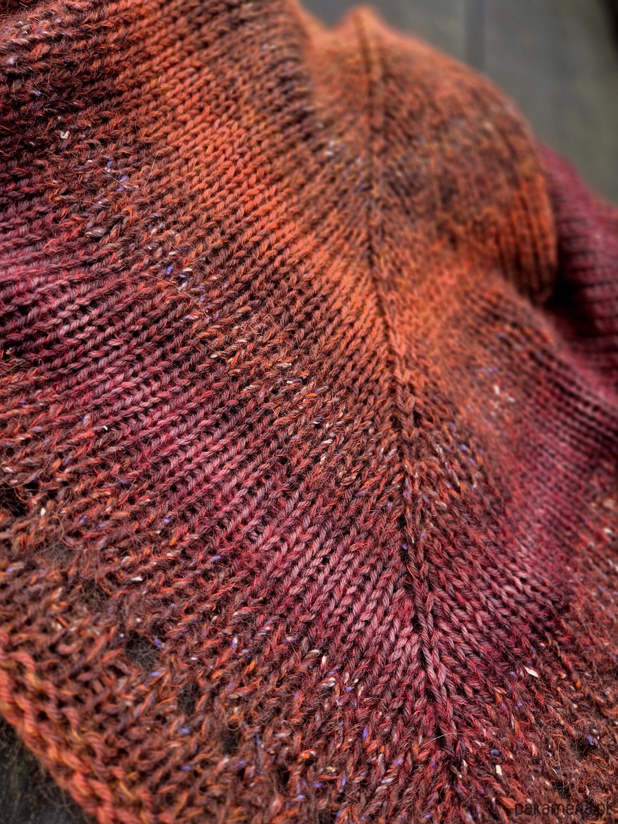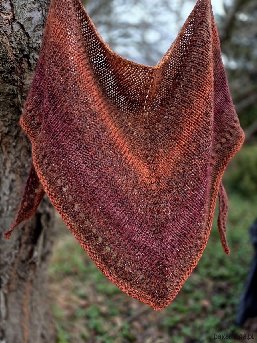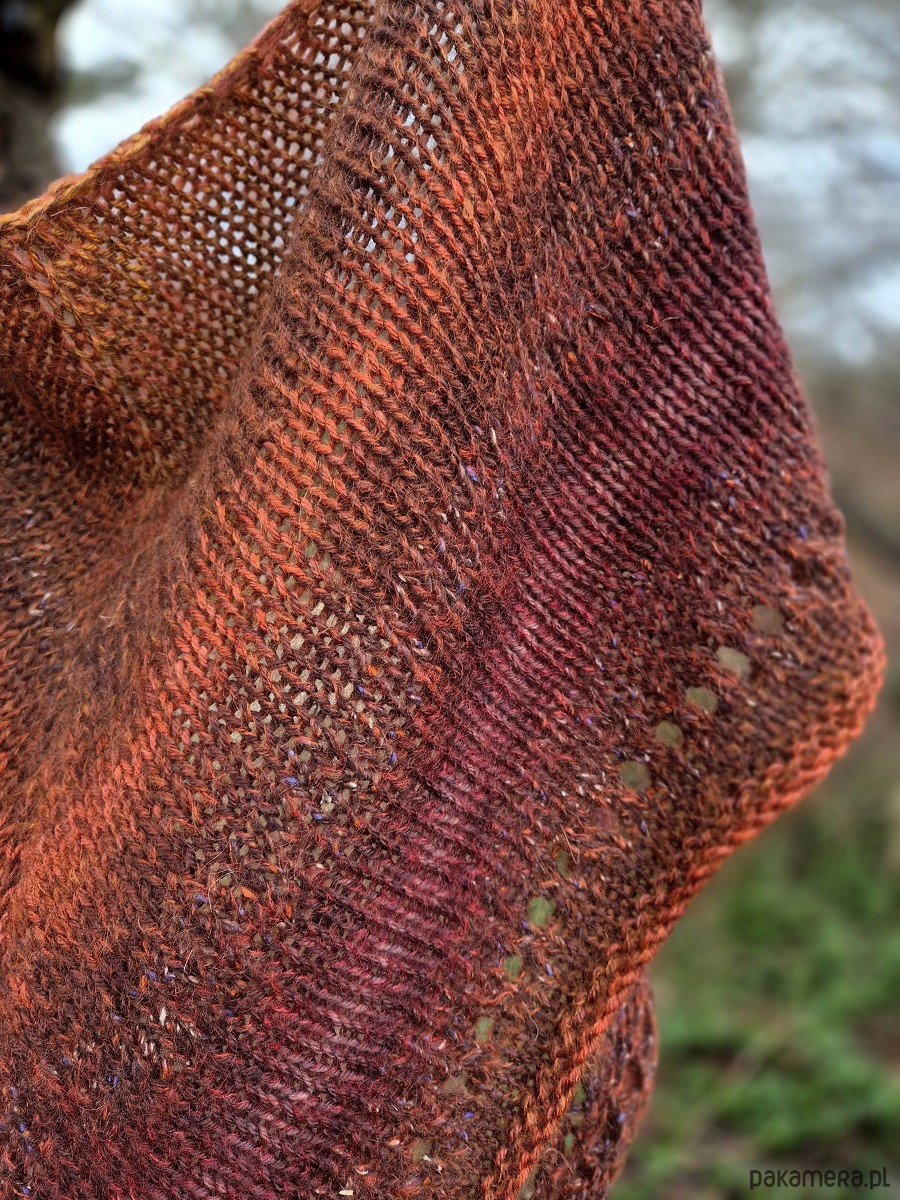 Miękka, puszysta i lejąca chusta, wykonana ręcznie na drutach z wysokiej jakości włóczek- do pięknie wybarwionej tweedowej dodałam miękkie merino.