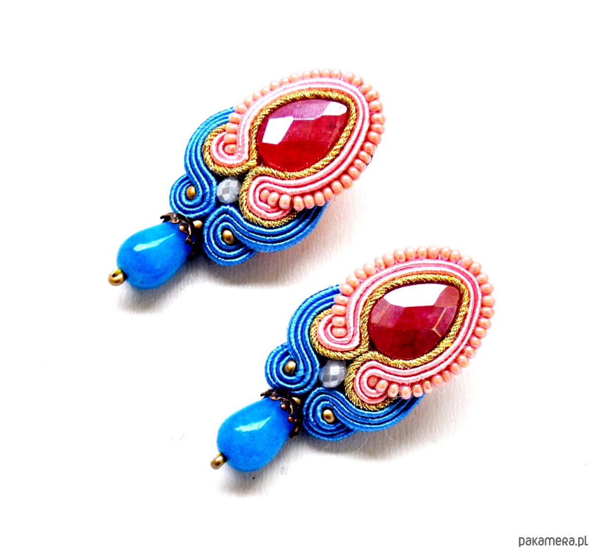 Eleganckie kolczyki w tonacji różu, ciemnego błękitu i złota z fasetowanymi łzami agatu. Długość 4 cm. Sztyfty antyalergiczne. Kolczyki wykonywane na indywidualne zamówienie - możliwość zmian kolorystycznych.