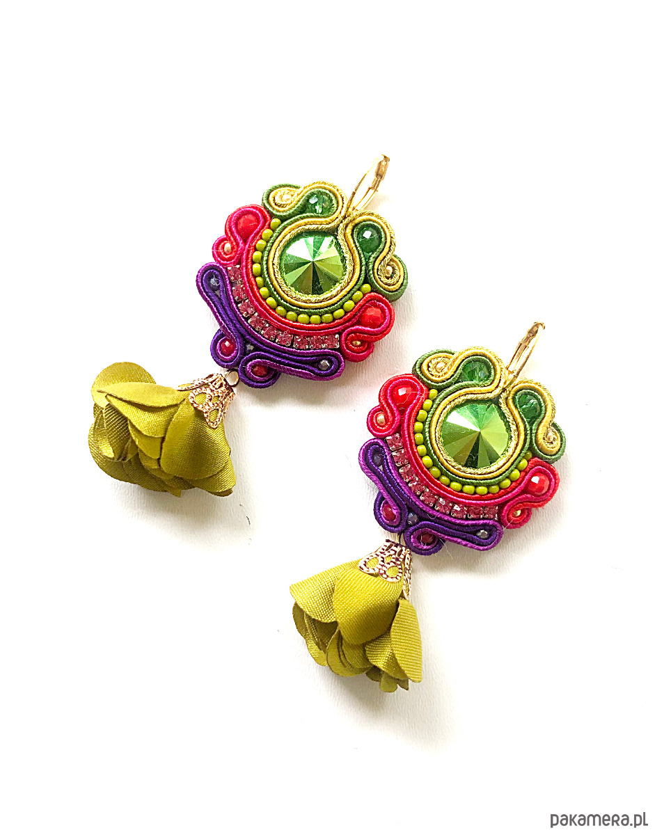 Kolczyki z sutaszu - w połączeniu zieleni, czerwieni, fioletu, złota z oliwkowymi kwiatami. Długość ok. 6-7 cm. Zawieszone na antyalergicznych biglach, możliwość wymiany na klipsy lub sztyfty. Kolczyki wykonywane na indywidualne zamówienie.
