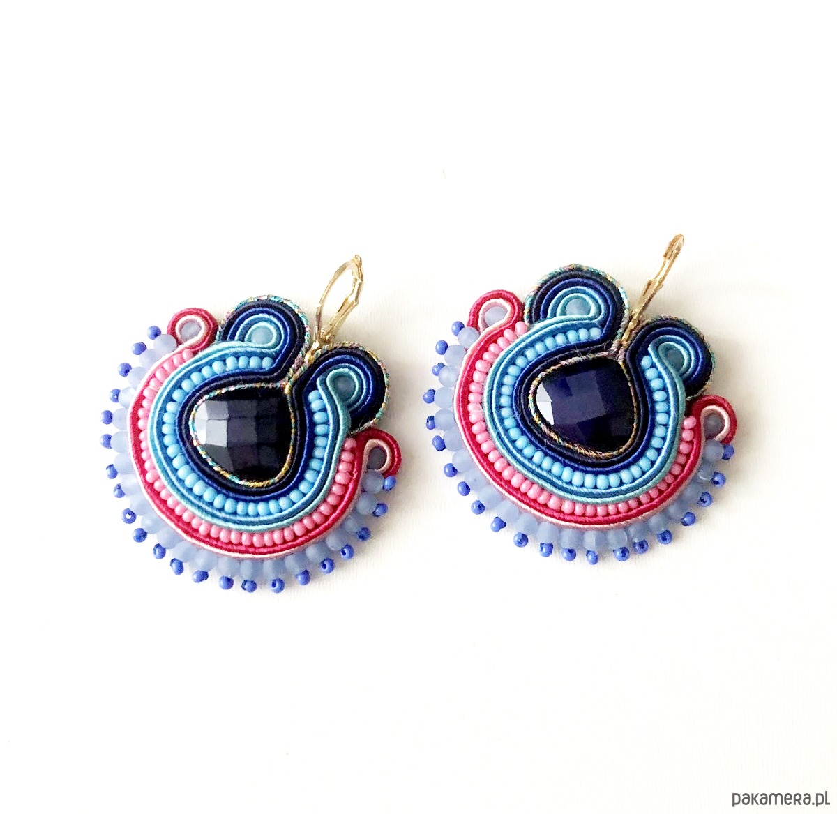 Eleganckie kolczyki w tonacji różu, niebieskiego, zieleni i żółtego z fasetowanymi żółtymi kaboszonami. Długość 4 cm. Sztyfty antyalergiczne. Kolczyki wykonywane na indywidualne zamówienie - możliwość zmian kolorystycznych.