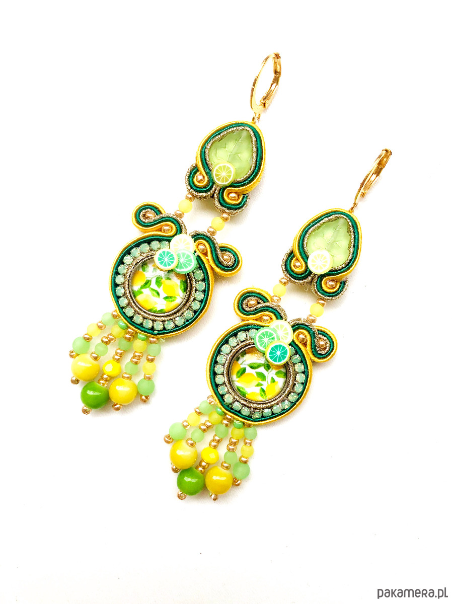 Długie, bogato zdobione kolczyki w odcieniach: zieleni, żółtego i złota z kaboszonami z cytrynami. Na dole małe szklane koraliki. Zdobione maleńkimi cytrynami i limonkami. Długość ok. 10 cm. Zawieszone na antyalergicznych biglach. Możliwość wymiany na sztyfty. Kolczyki robione są na indywidualne zamówienie.