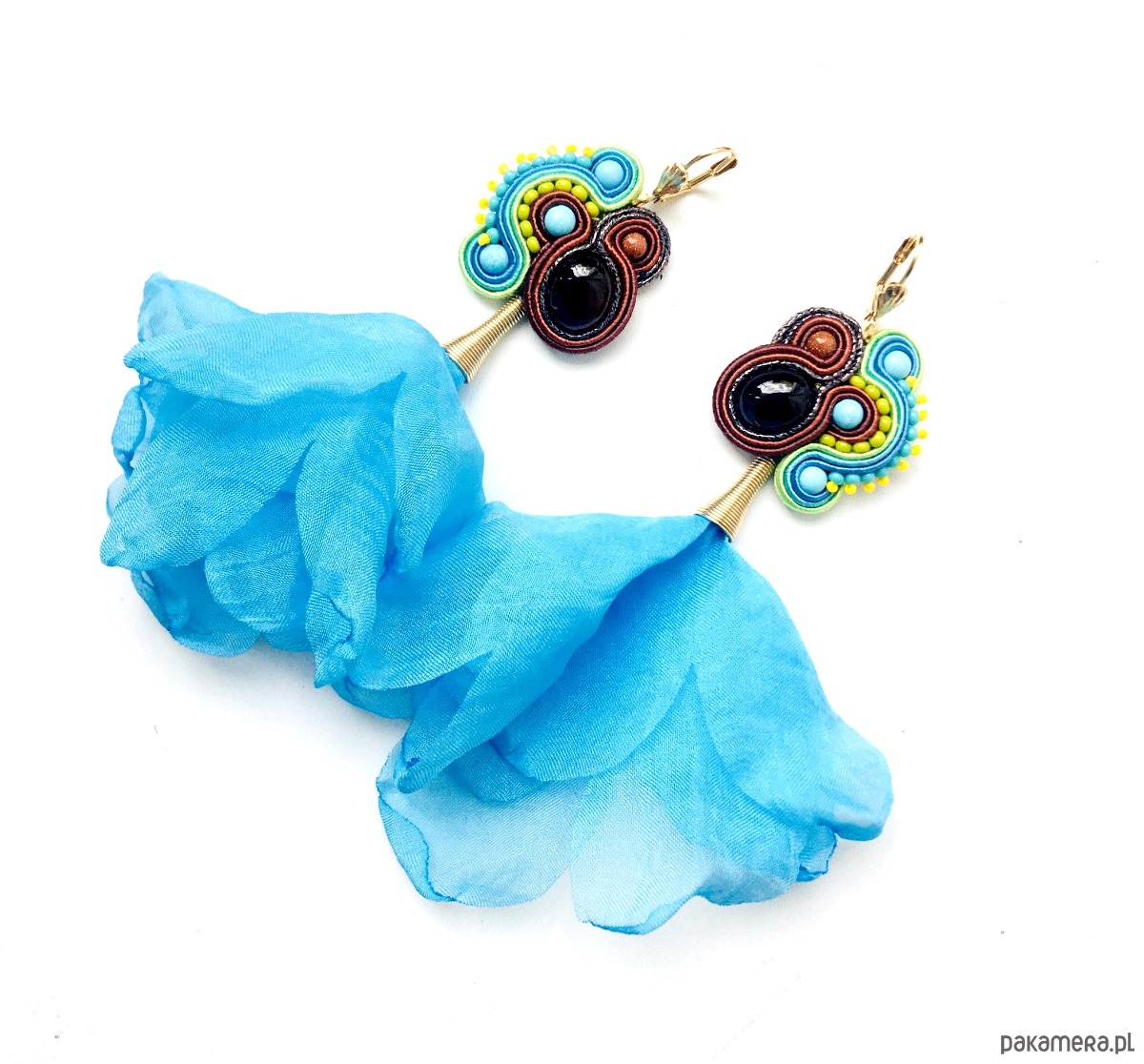 Oryginalne eleganckie kolczyki z sutaszu z naturalnym bursztynem w odcieniach zieleni, niebieskiego i brązu z szyfonowymi kwiatami w kolorze błękitu. Długość ok. 11 cm. Zawieszone na antyalergicznych sztyftach.Impregnowane. Kolczyki wykonywane są na indywidualne zamówienie.