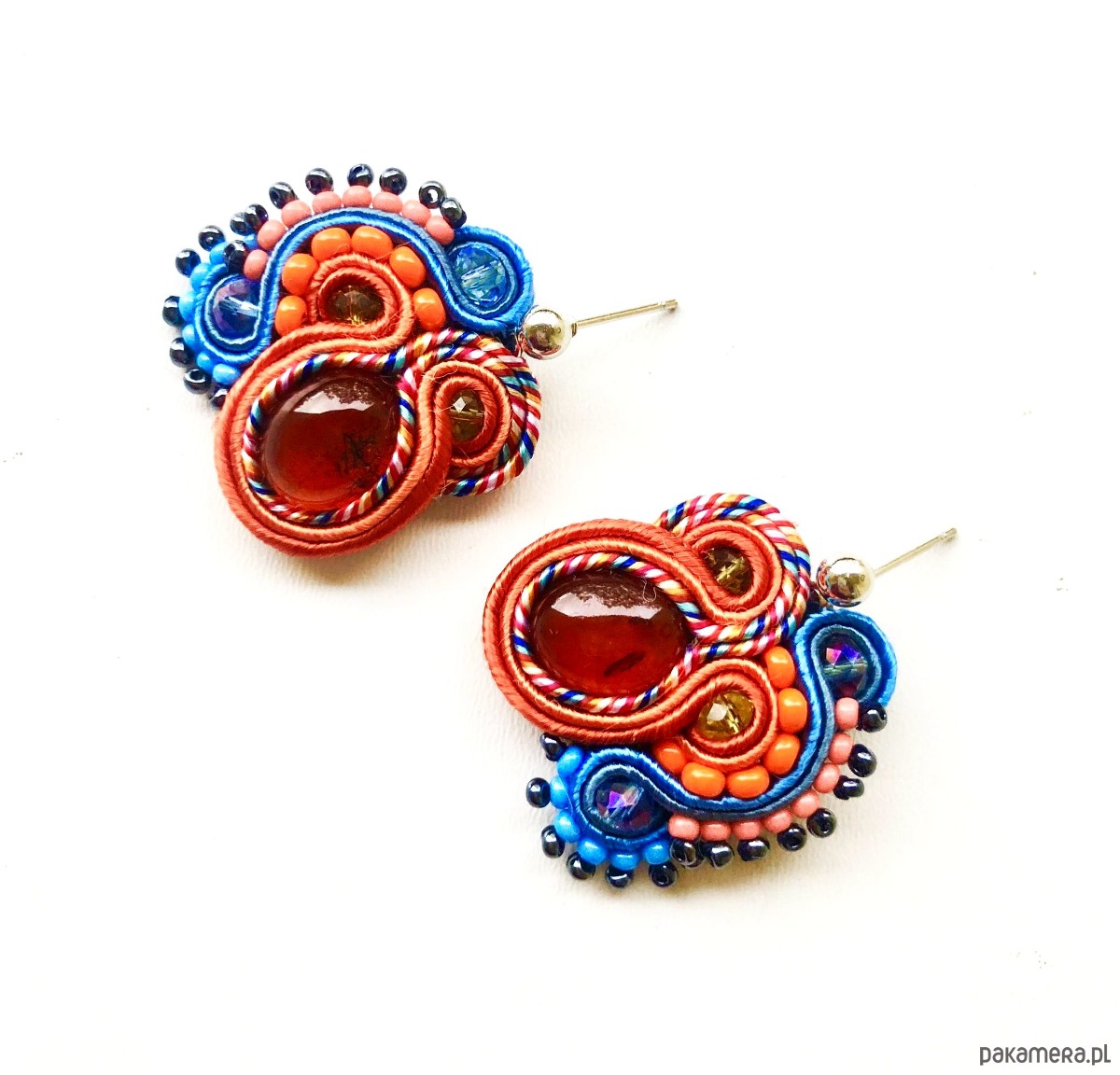 Kolczyki z sutaszu z naturalnym bursztynem - w połączeniu pomarańczu i niebieskiego. Długość 3 cm. Zawieszone na antyalergicznych biglach, możliwość wymiany na klipsy lub sztyfty. Kolczyki wykonywane na indywidualne zamówienie.