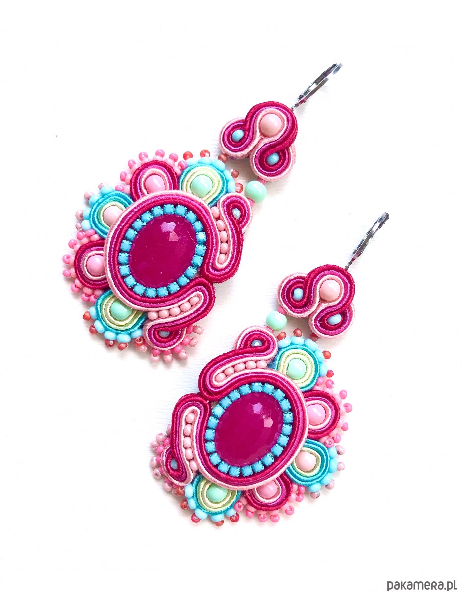 Kolczyki sutasz w odcieniach różu i turkusu z amarantowym fasetowanym jadeitem.. Długość 18 cm. Zawieszone na antyalergicznych biglach. Kolczyki robione są na indywidualne zamówienie. Proszę o przemyślane zakupy, bo nie przyjmuję zwrotów.