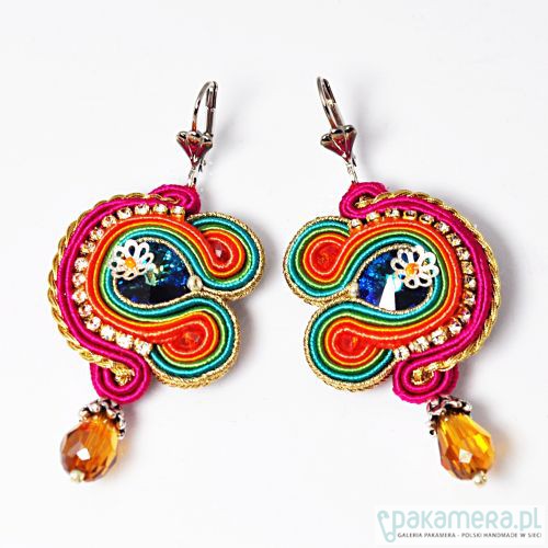 Eleganckie kolczyki w tonacji różu, pomarańczu, turkusu, zieleni i złota z serduszkami swarovskiego Długość 4,5 cm. Bigle antyalergiczne. Możliwość wymiany na klipsy lub sztyfty.