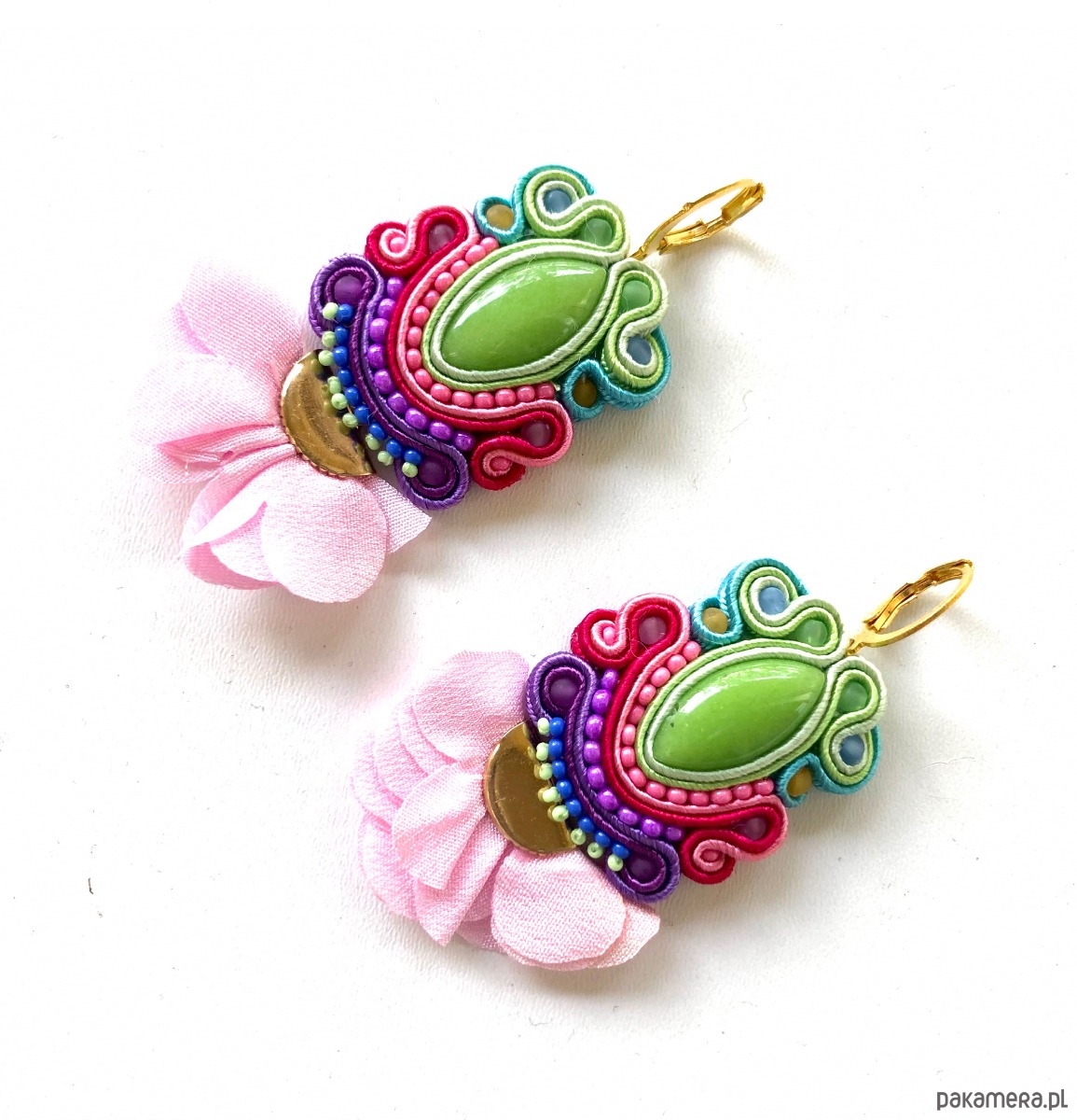 Bajecznie kolorowe kolczyki z sutaszu w w zieleni, fiolecie i różu z zielonymi jadeitami i kwiatami . Długość ok.6 cm. Niezwykle eleganckie. Zawieszone na antyalergicznych biglach. Tył wykończony ekologiczną skórą. Impregnowane. Kolczyki wykonywane na indywidualne zamówienie, dlatego proszę o przemyślane zakupy, bo nie ma możliwość ich zwrotu.. Możliwość zmiany kolorów w kolczykach.