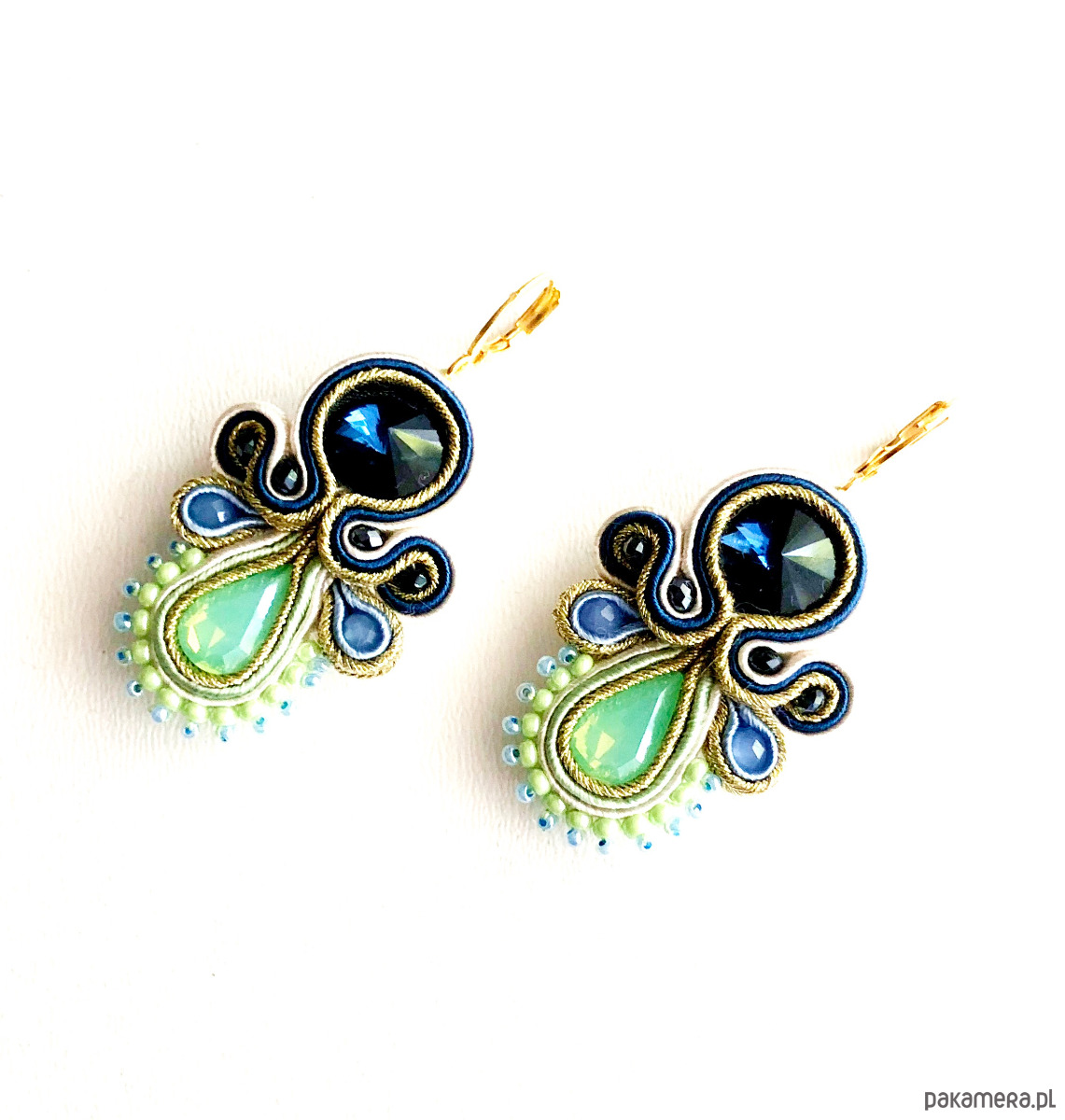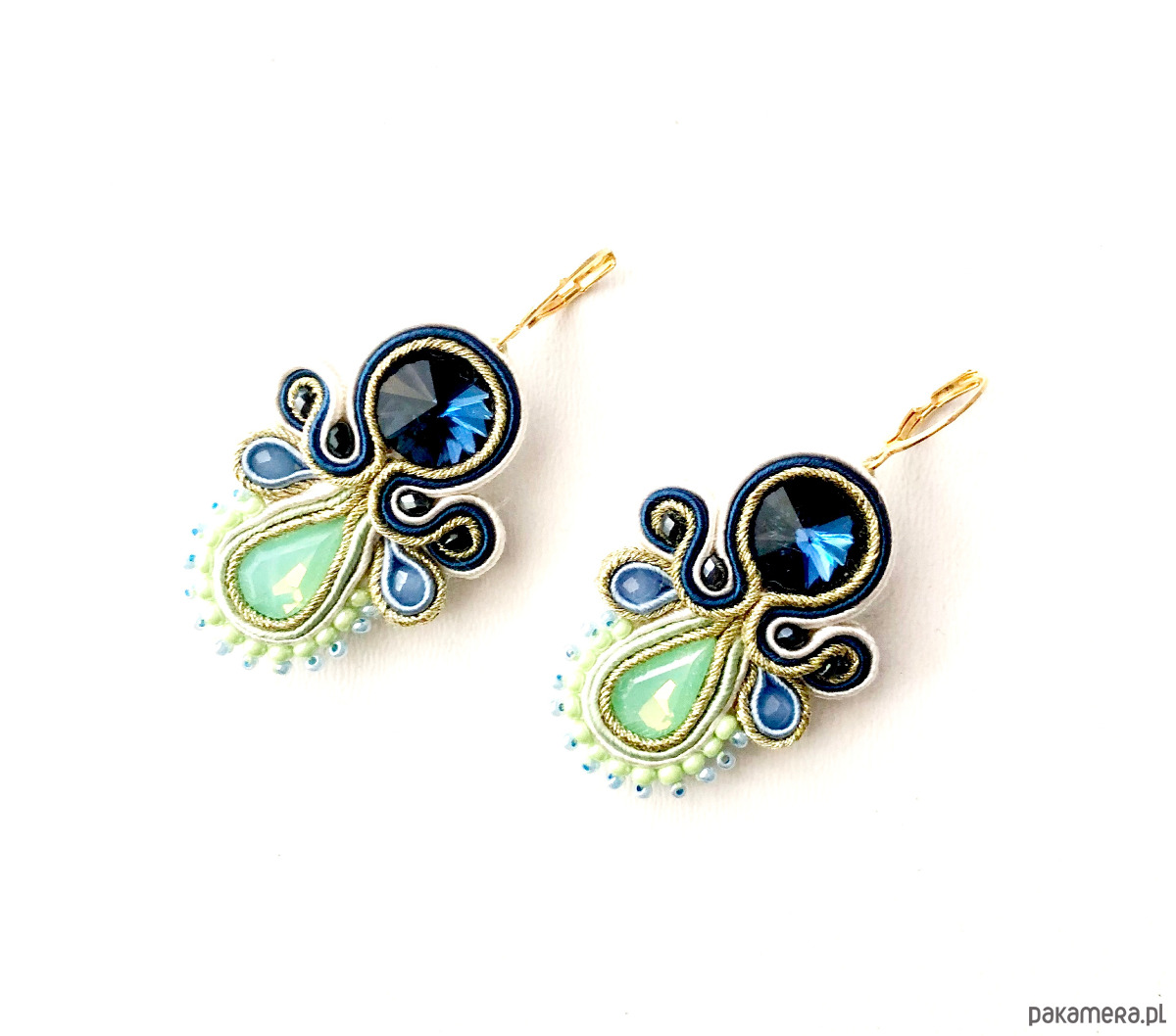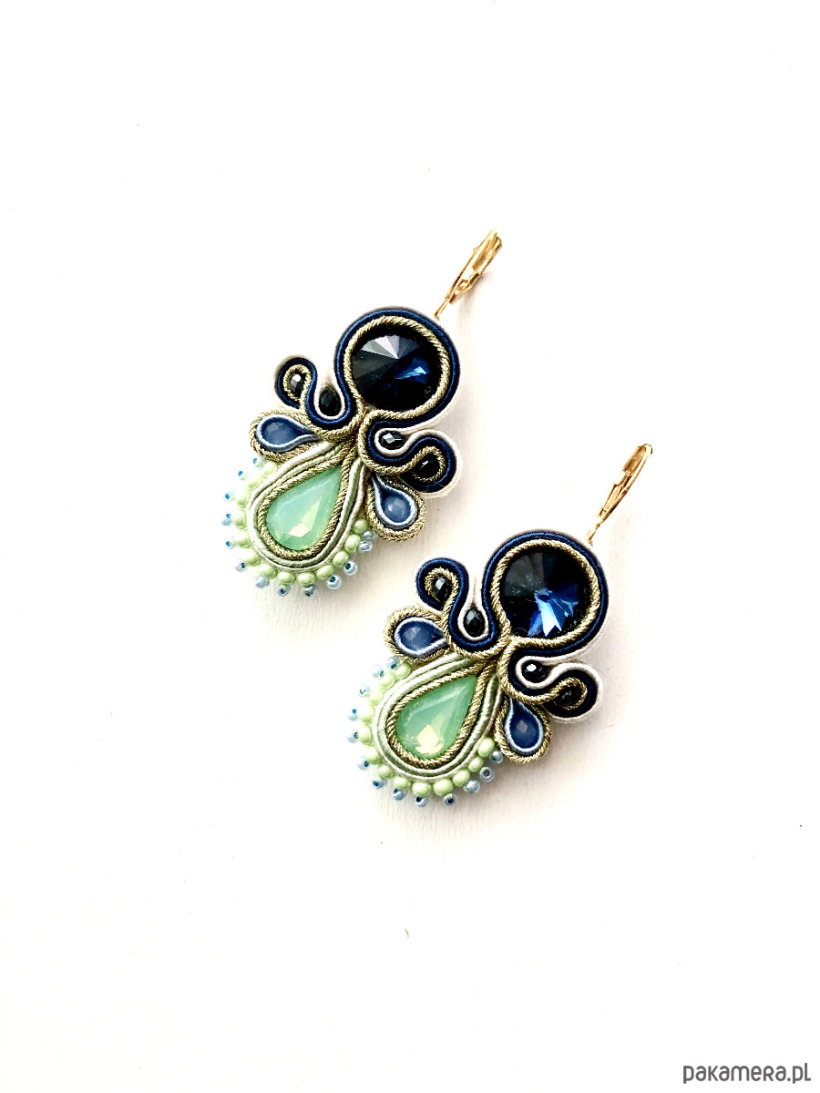 Kolczyki z sutaszu - w połączeniu jasnej mięty, granatu i niebieskiego. Długość ok. 6 cm. Zawieszone na antyalergicznych biglach, możliwość wymiany na klipsy lub sztyfty. Kolczyki wykonywane na indywidualne zamówienie.