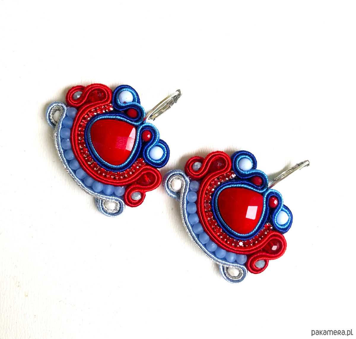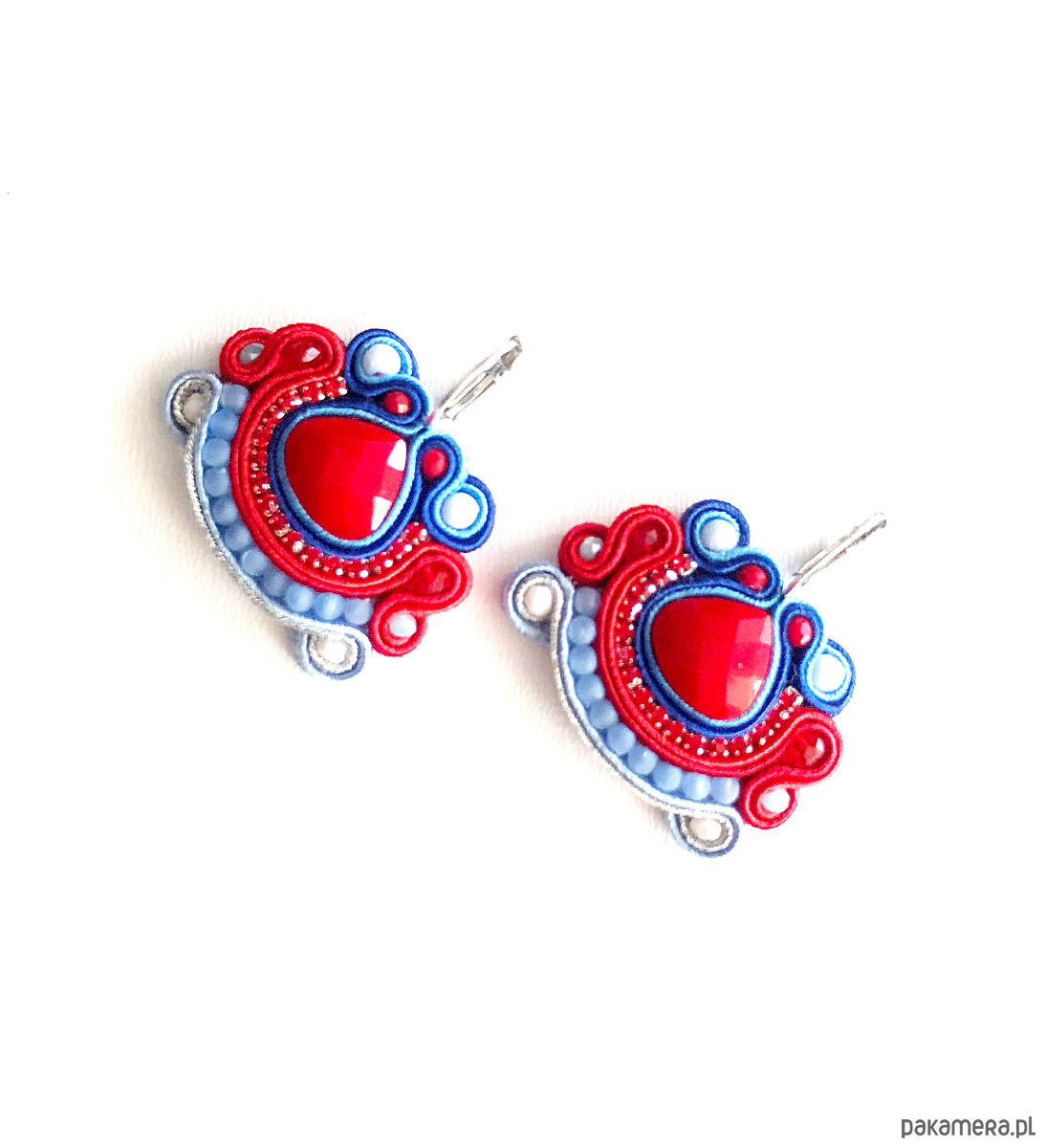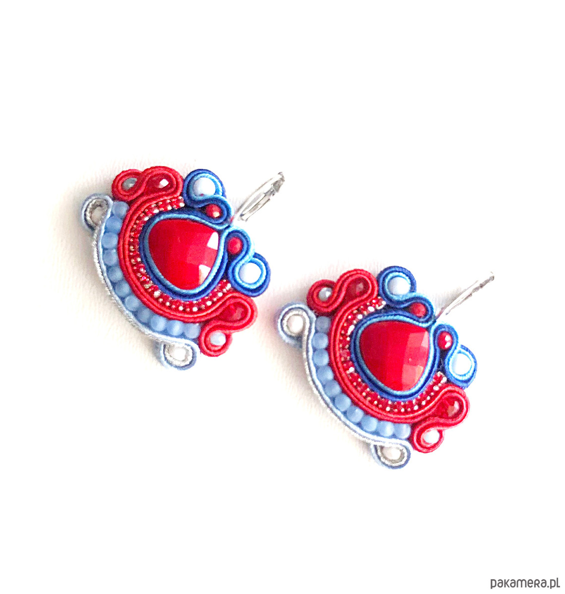 Wyjątkowe kolczyki z sutaszu - w połączeniu różnych odcieni czerwieni i niebieskiego. Długość 4,5 cm. Zawieszone na antyalergicznych biglach, możliwość wymiany na klipsy lub sztyfty. Kolczyki wykonywane są na zamówienie, w związku z czym nie ma możliwości zwrotu produktu.