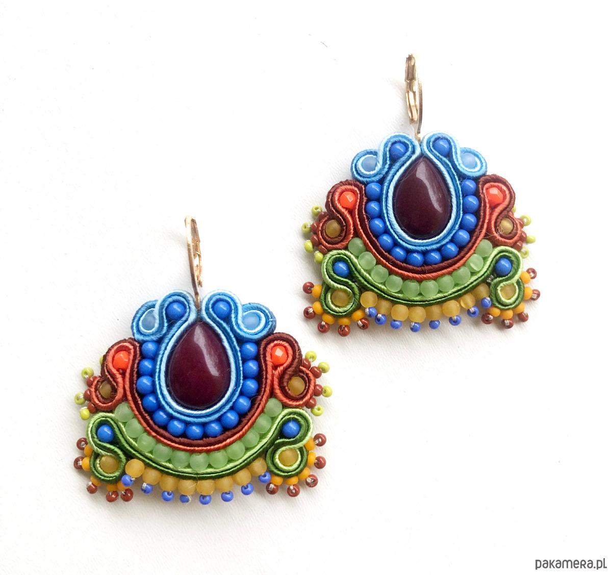 Oryginalne kolczyki z sutaszu - w połączeniu niebieskiego, pomarańczu, brązu i zieleni. Długość ok 4,5 cm. Zawieszone na antyalergicznych biglach, możliwość wymiany na klipsy lub sztyfty. Kolczyki wykonywane na indywidualne zamówienie. Proszę o przemyślane zakupy, bo nie przyjmuję zwrotów.