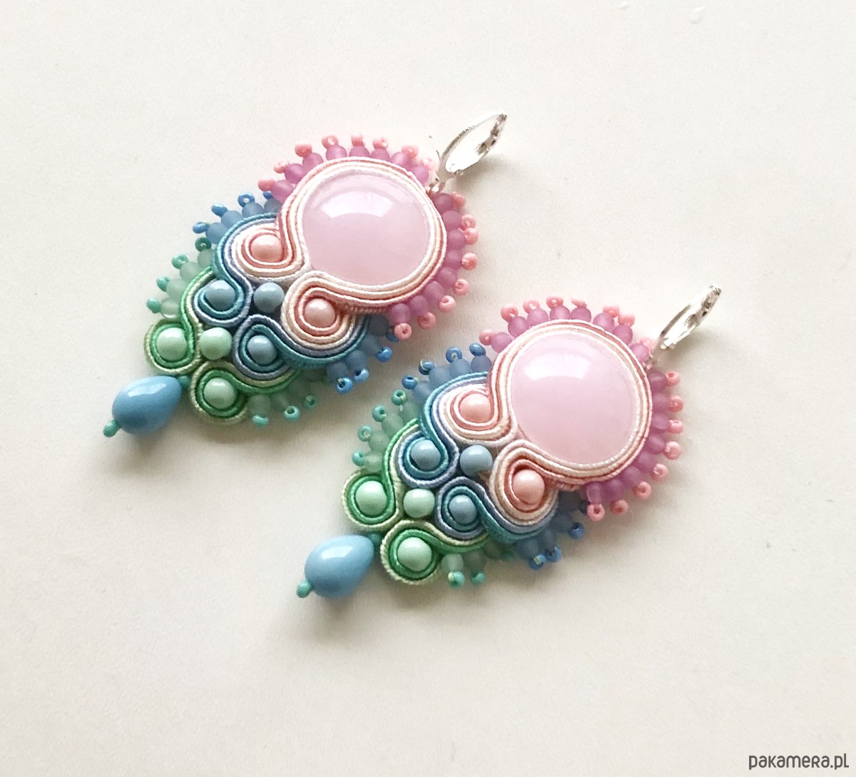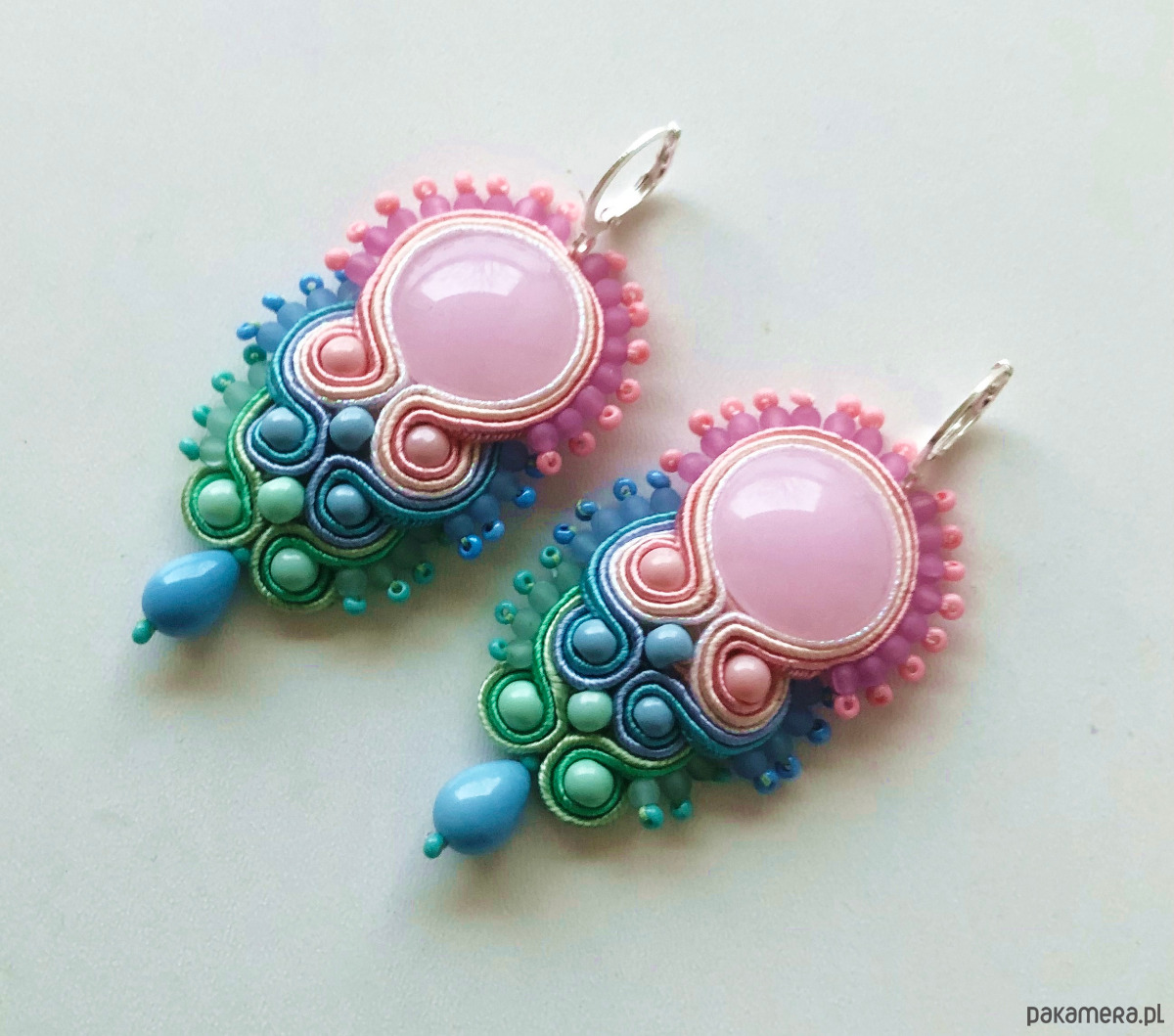 Pastelowe sutaszowe kolczyki z najnowszej wiosenno-letniej kolekcji w odcieniach: różu, błękitu i zieleni. Długość 7,5 cm. Zawieszone na antyalergicznych biglach. Kolczyki wykonywane na indywidualne zamówienie.